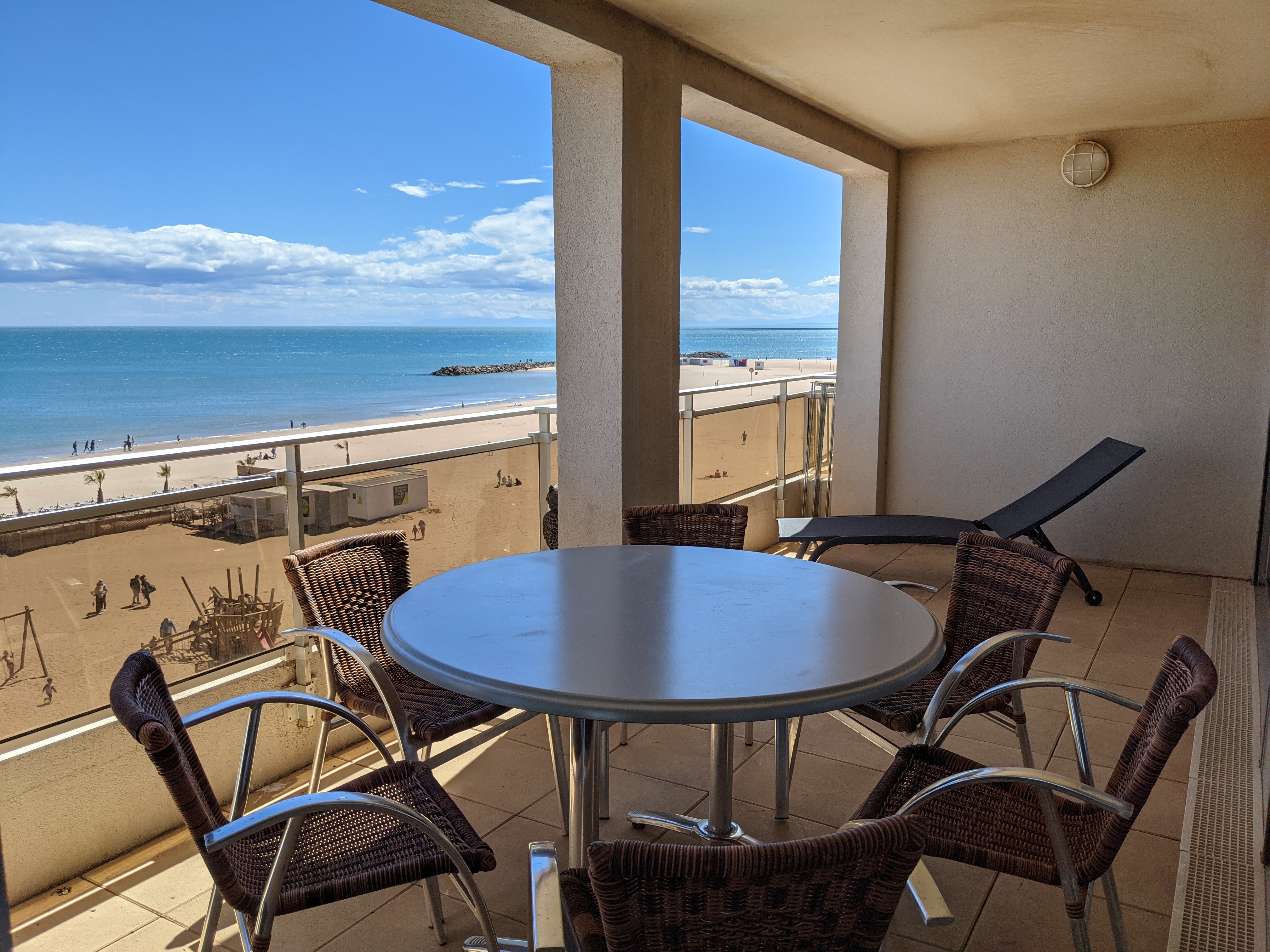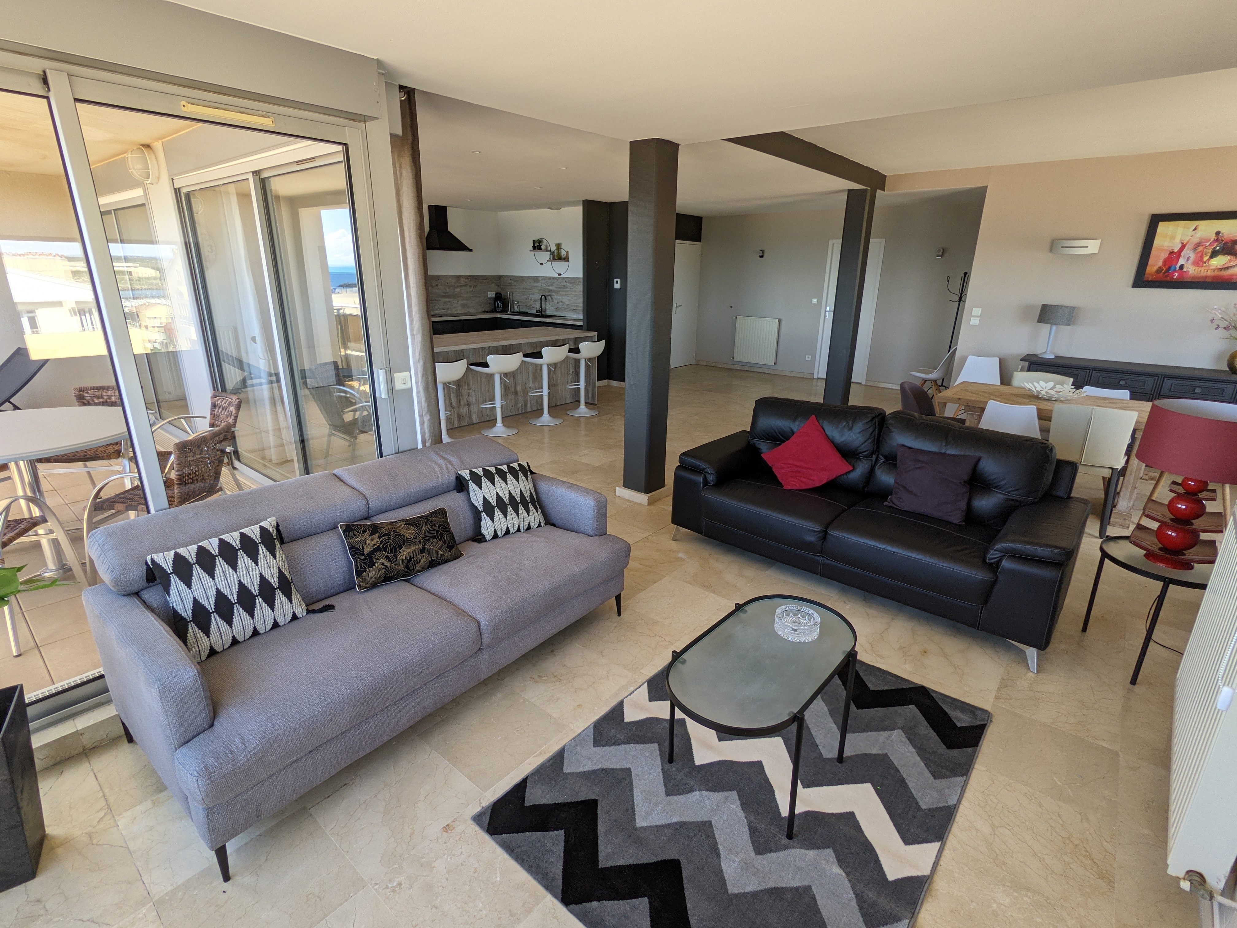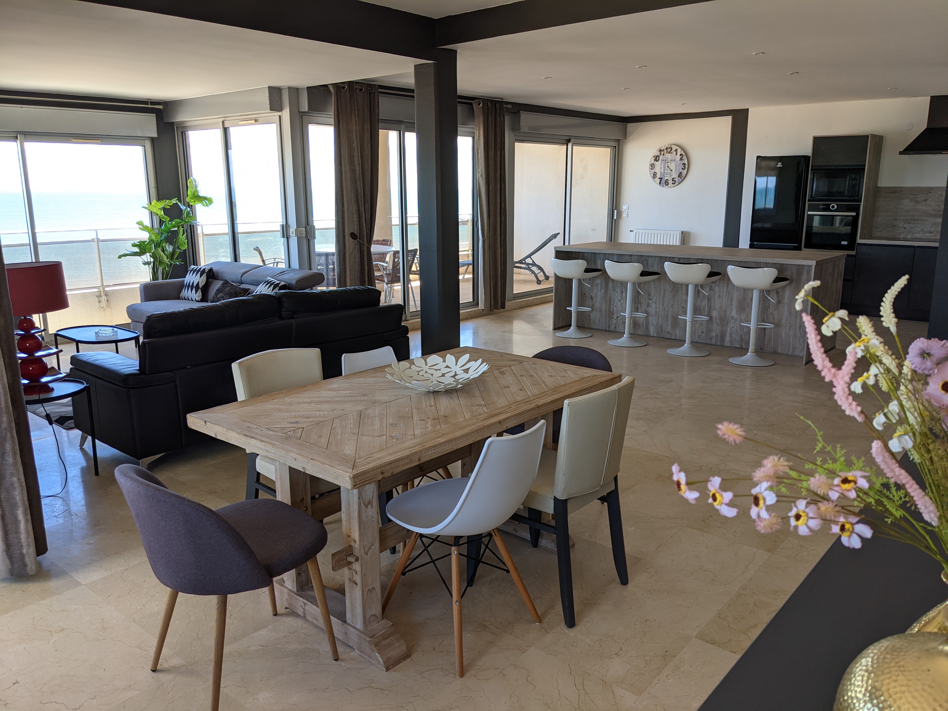 Appartement T4 dans immeuble, capacité d’accueil 6 personnes, vue sur la mer, 3ème étage, ascenseur, superficie 180 m², climatisation, terrasse. Animaux admis.