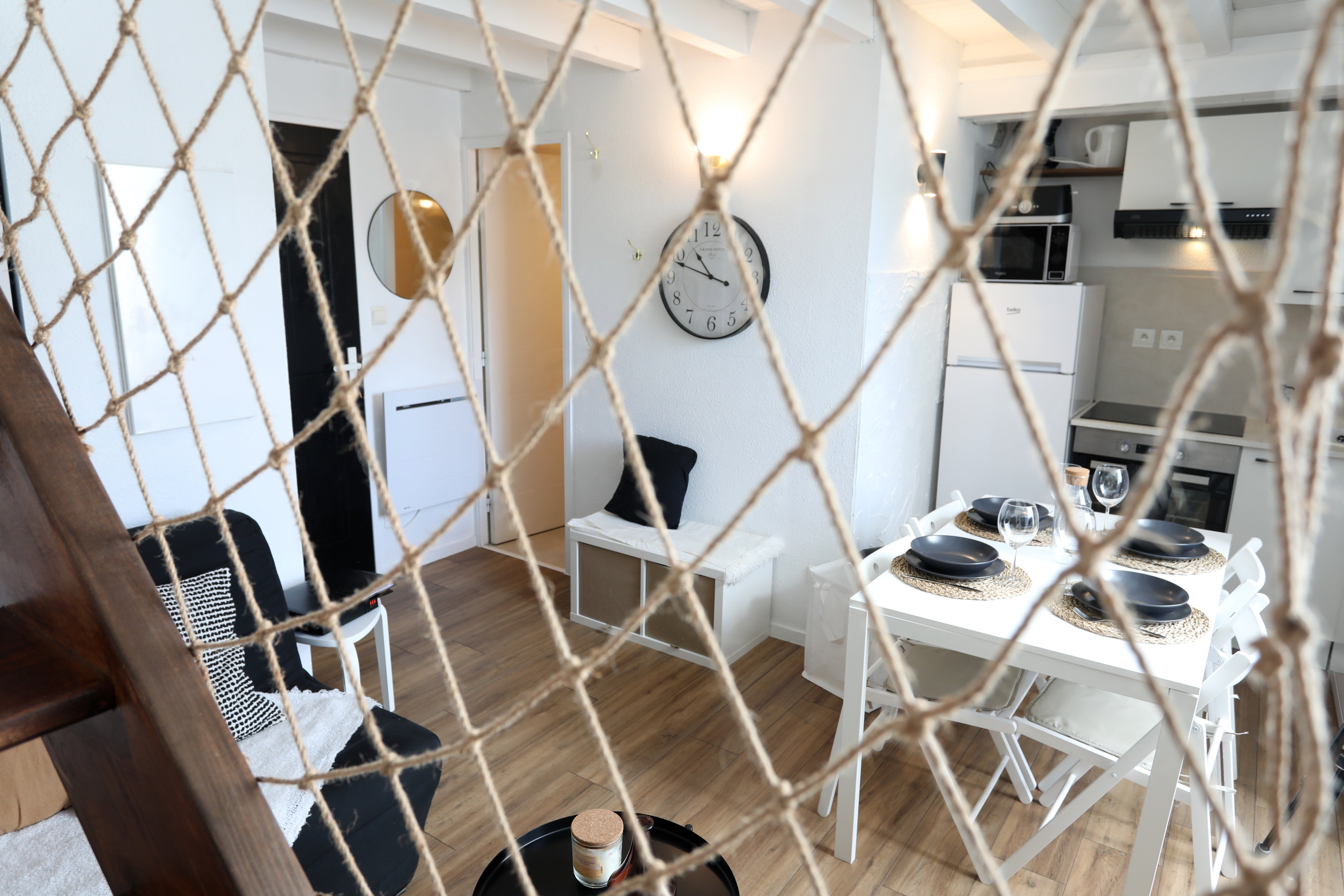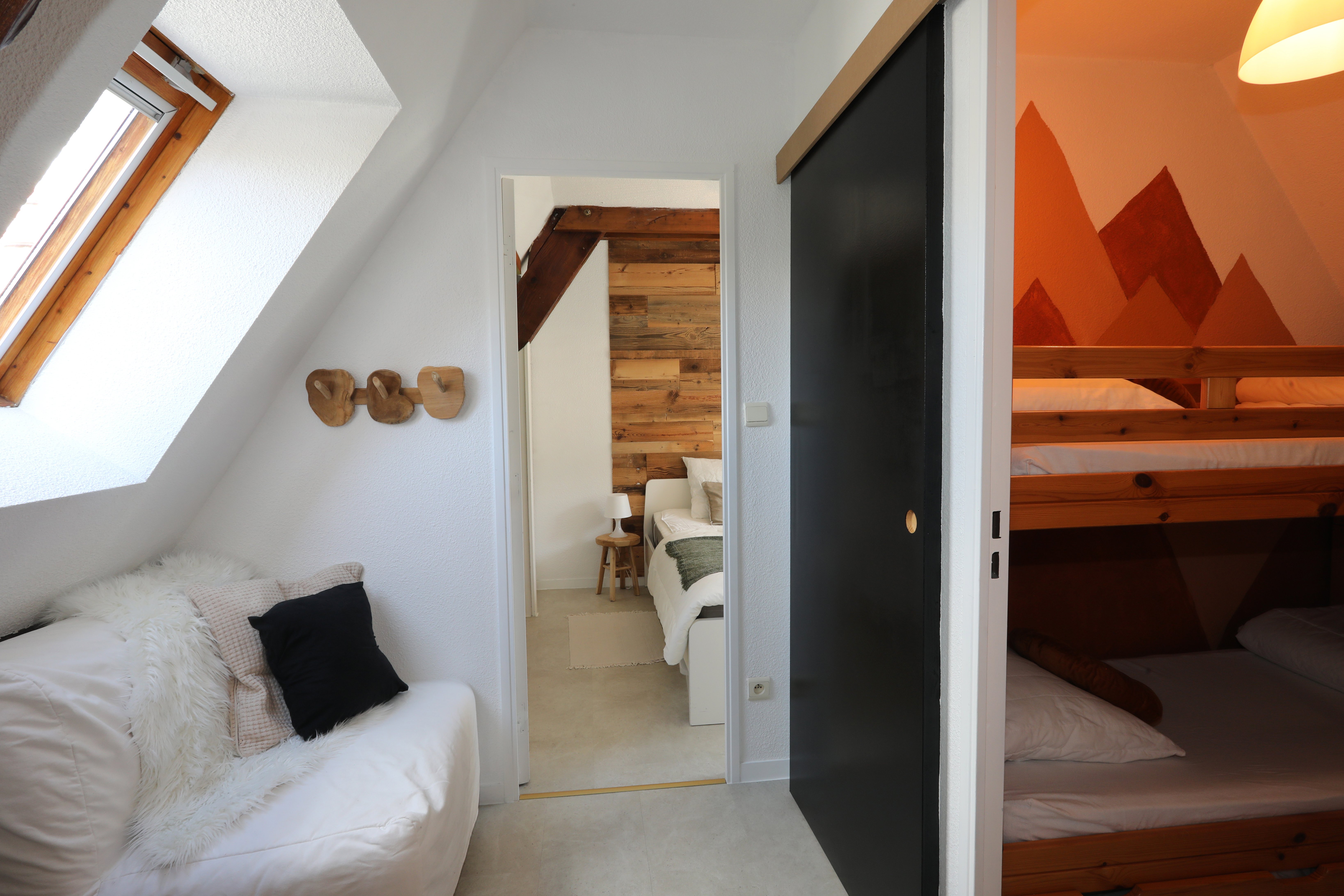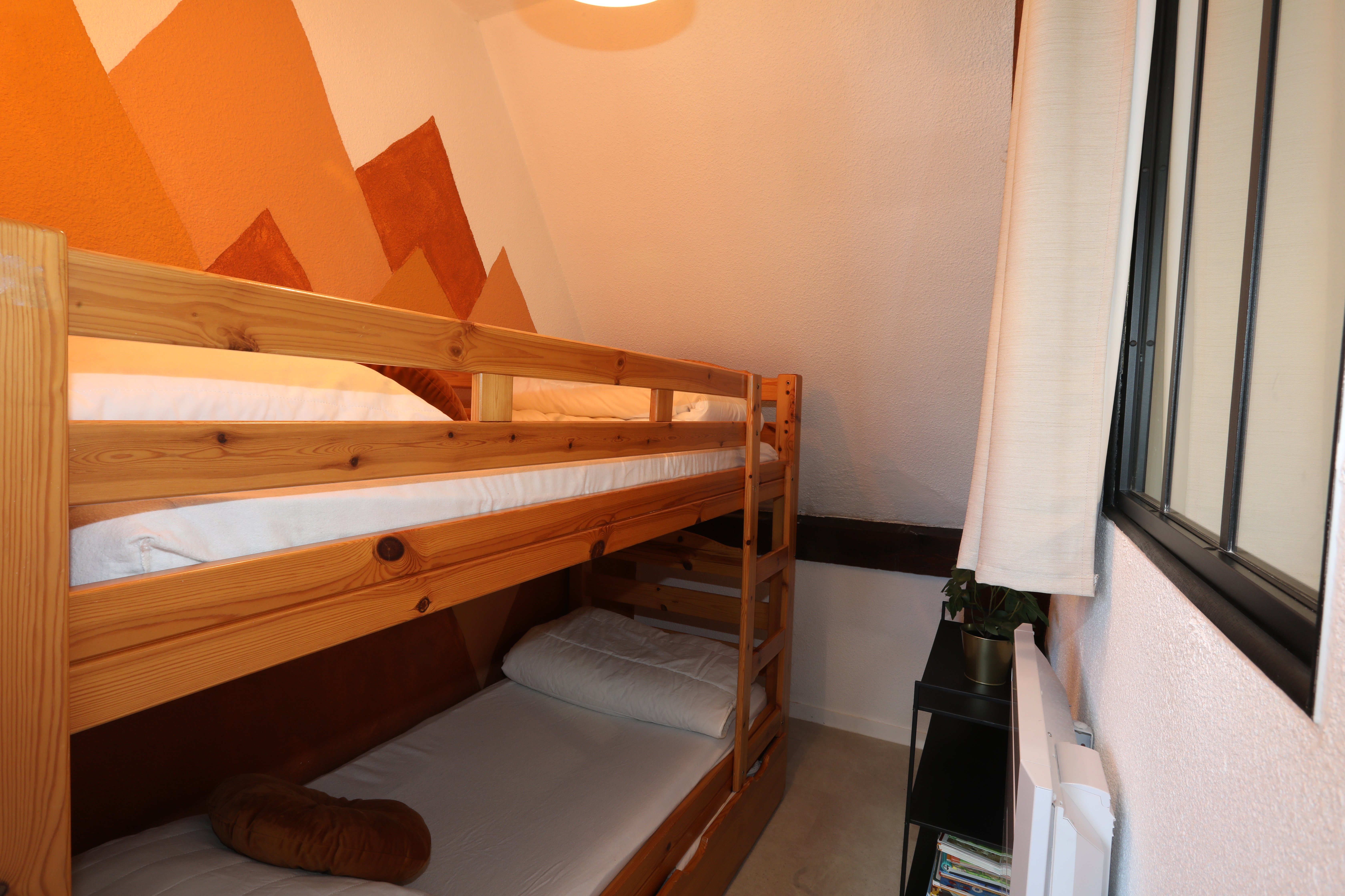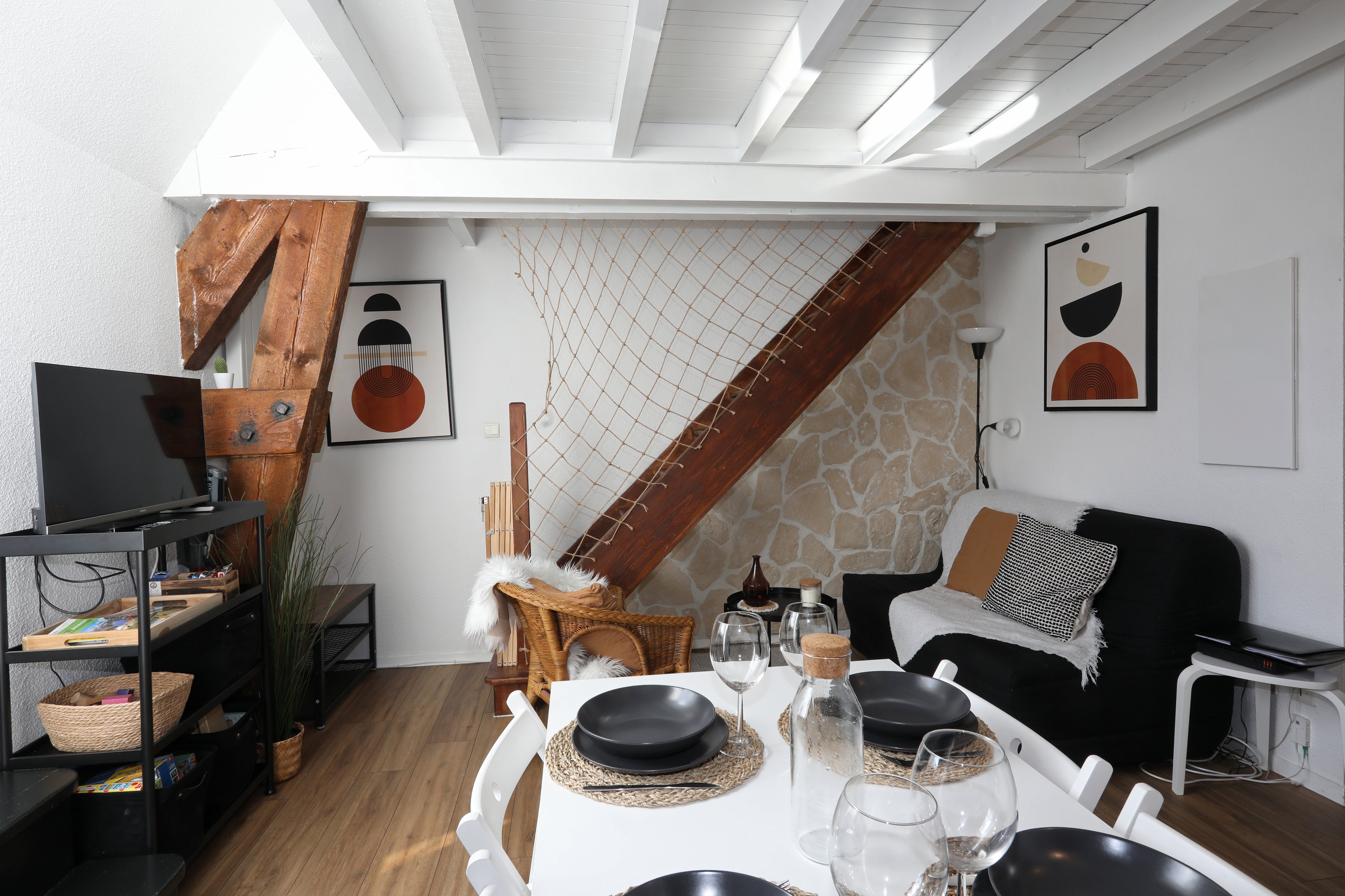 Appartement de 45 m², à étage, comprenant : Rez-de-chaussée, une pièce de vie avec salon, un espace repas et cuisine toute équipée, une salle de bain (baignoire) et un WC indépendant. À l’étage, un coin salon avec canapé BZ (1 personne), 1 chambre (1 lit en 160, 1 lit bébé) et un coin nuit (2 lits en 90 superposés). La location bénéficie en sous-sol, d’un local à skis avec des luges, tables et chaises de camping et jeux d’extérieur.