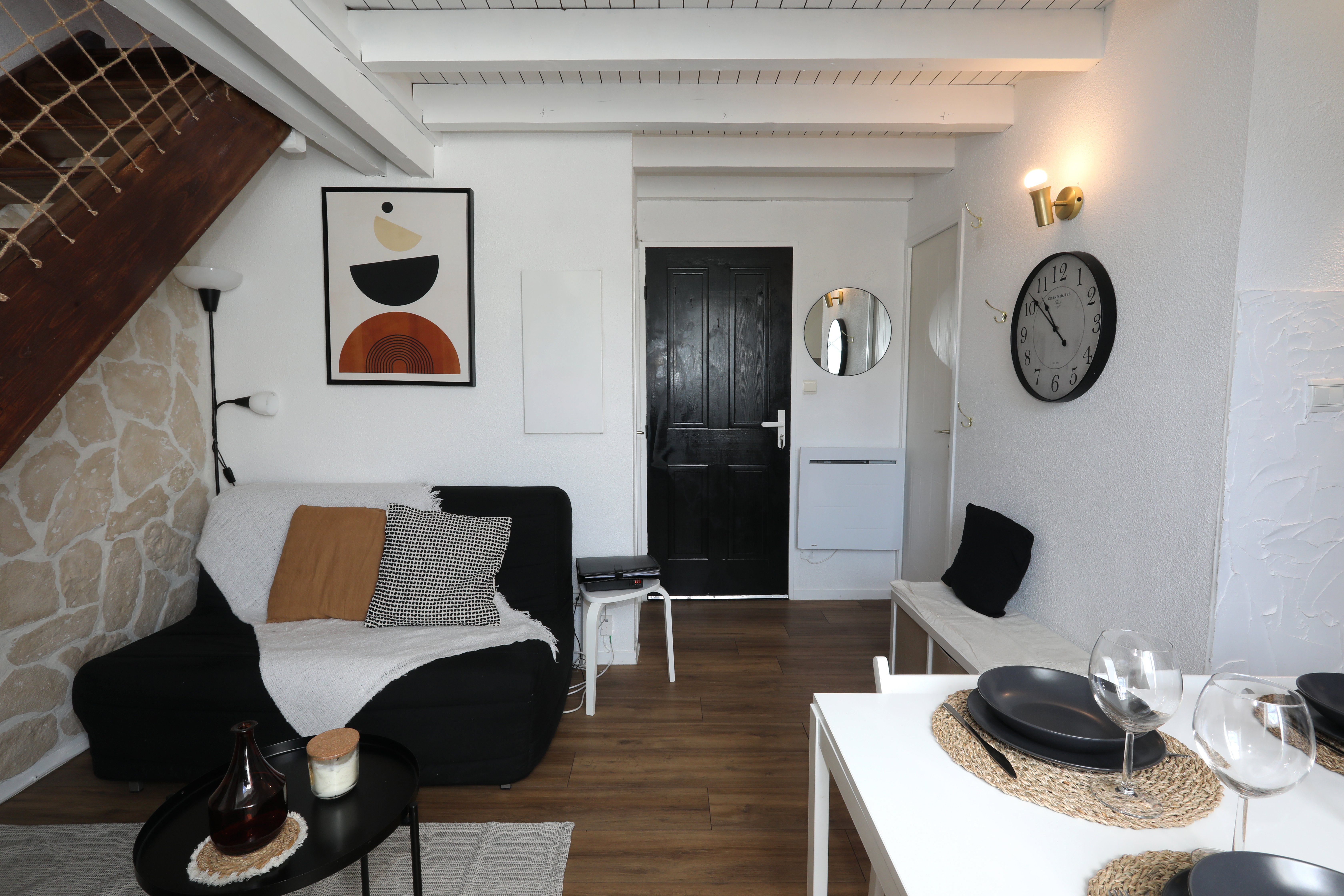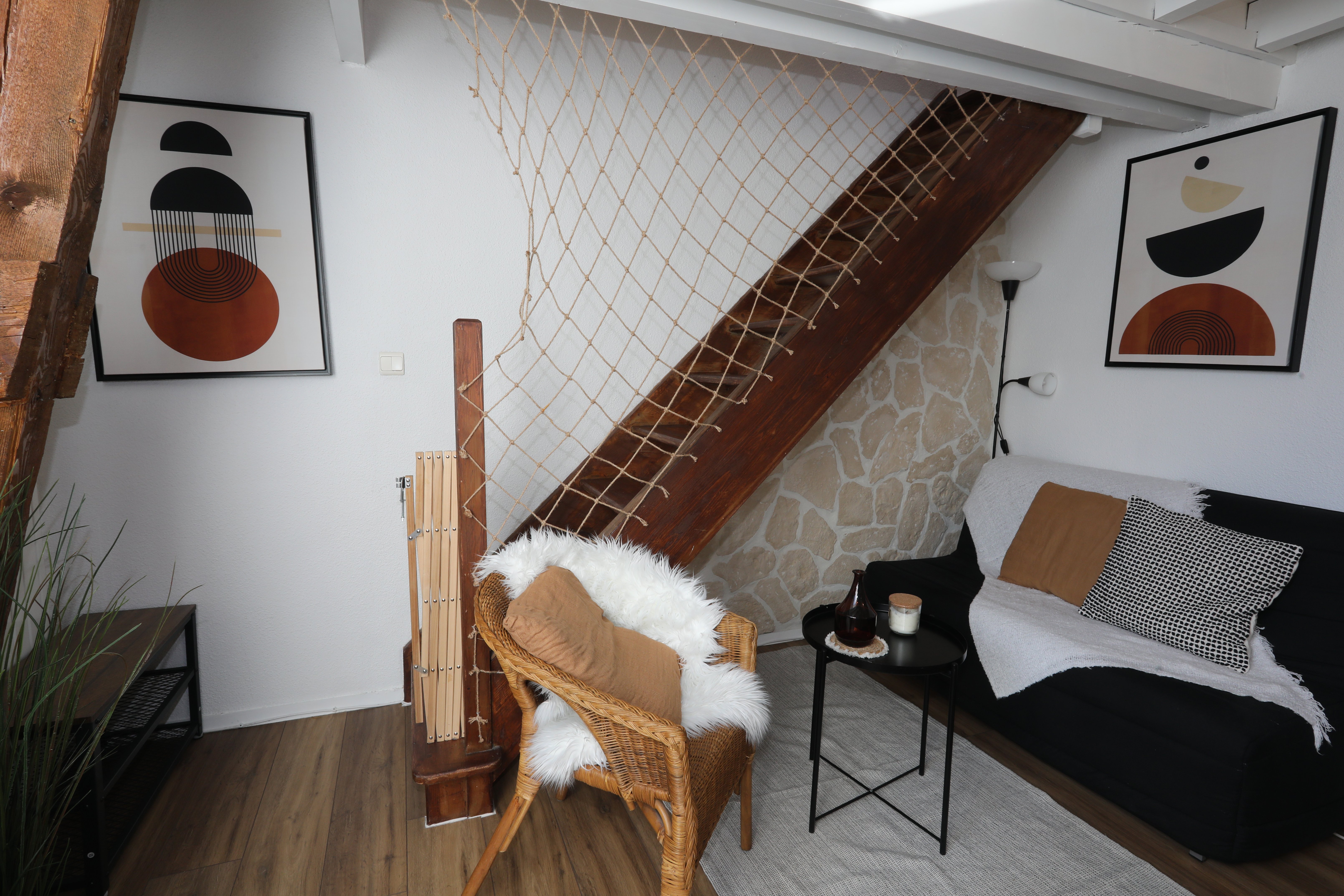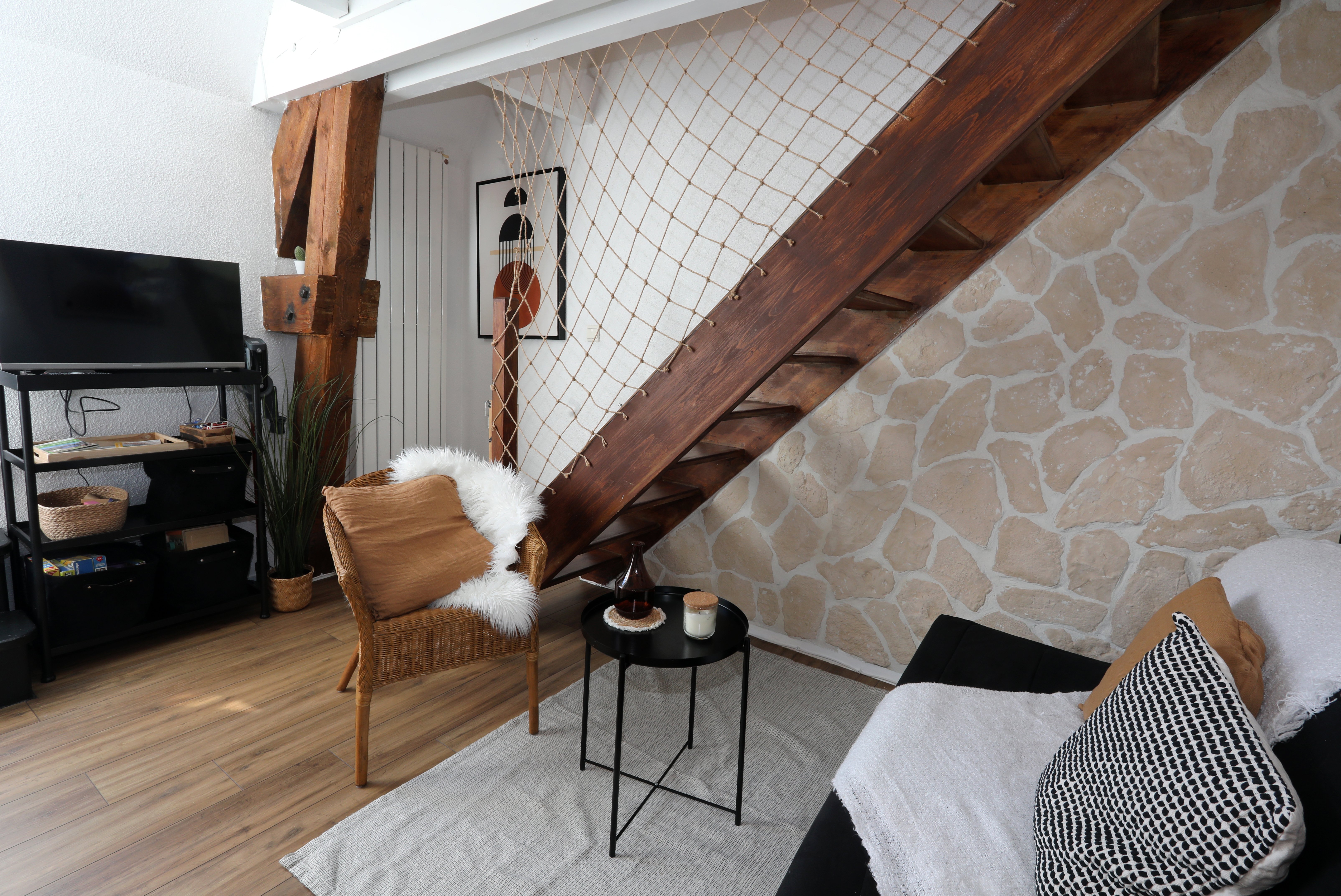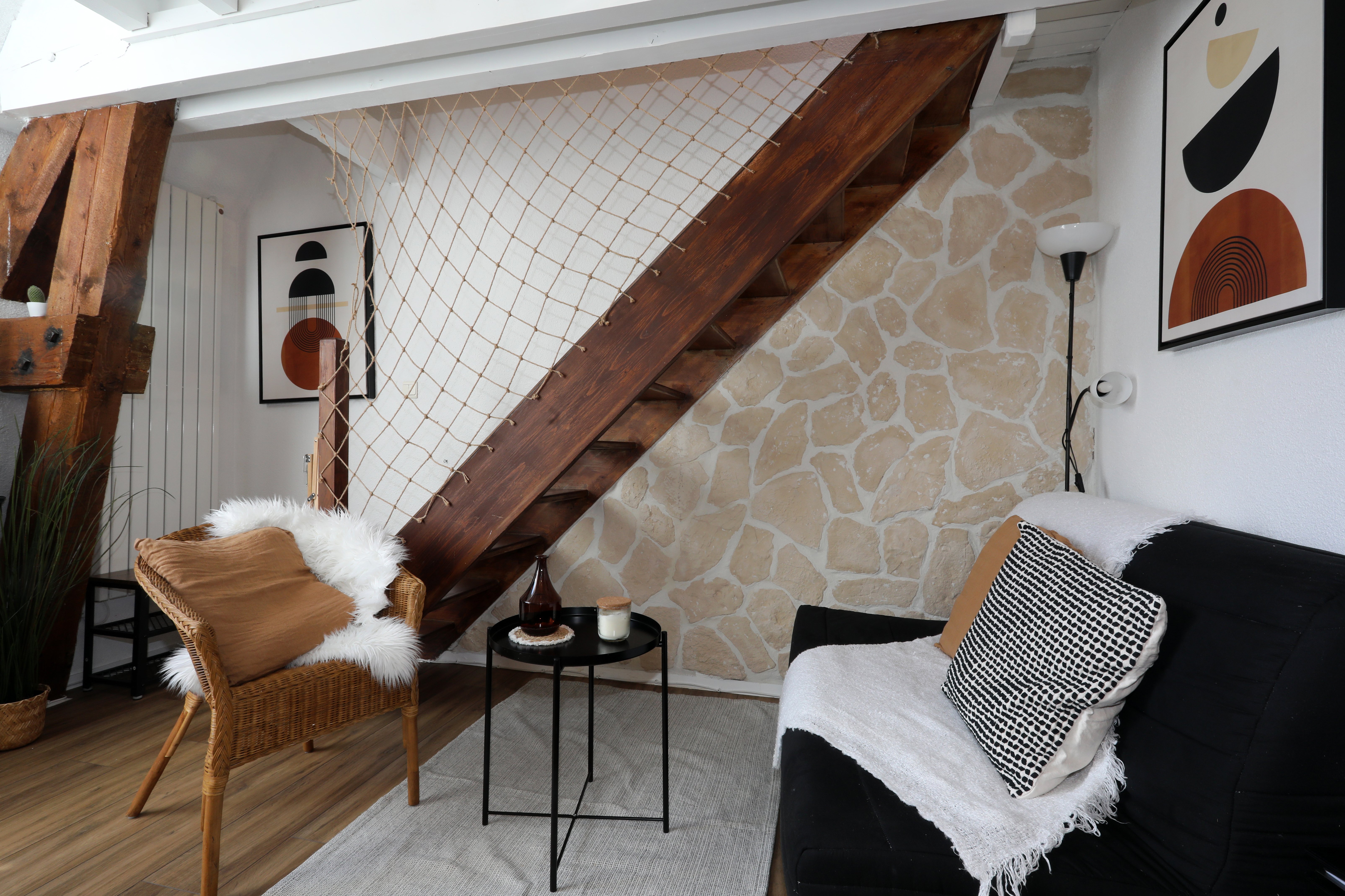 Appartement de 45 m², à étage, comprenant : Rez-de-chaussée, une pièce de vie avec salon, un espace repas et cuisine toute équipée, une salle de bain (baignoire) et un WC indépendant. À l’étage, un coin salon avec canapé BZ (1 personne), 1 chambre (1 lit en 160, 1 lit bébé) et un coin nuit (2 lits en 90 superposés). La location bénéficie en sous-sol, d’un local à skis avec des luges, tables et chaises de camping et jeux d’extérieur.