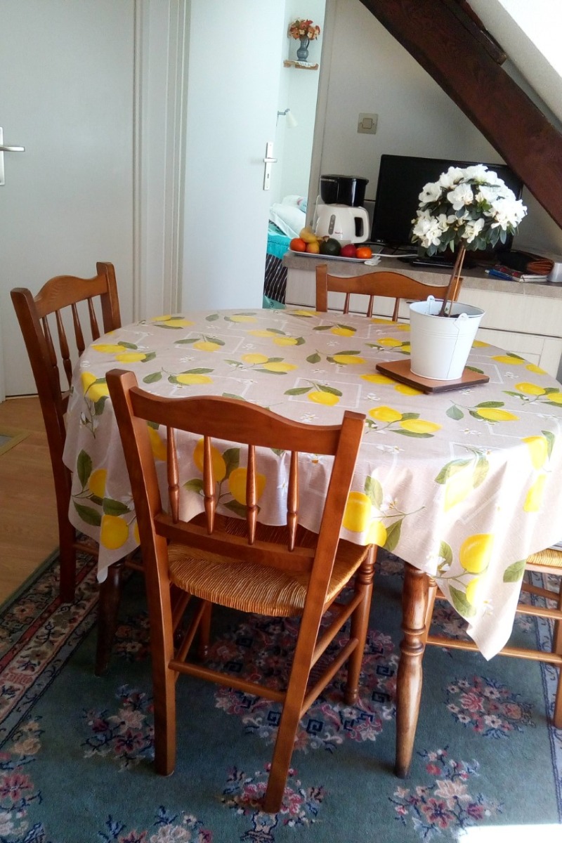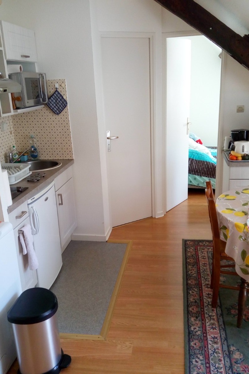 Séjour kitchenette avec un canapé convertible BZ en 140, une chambre avec un lit en 140, salle d’eau avec WC.