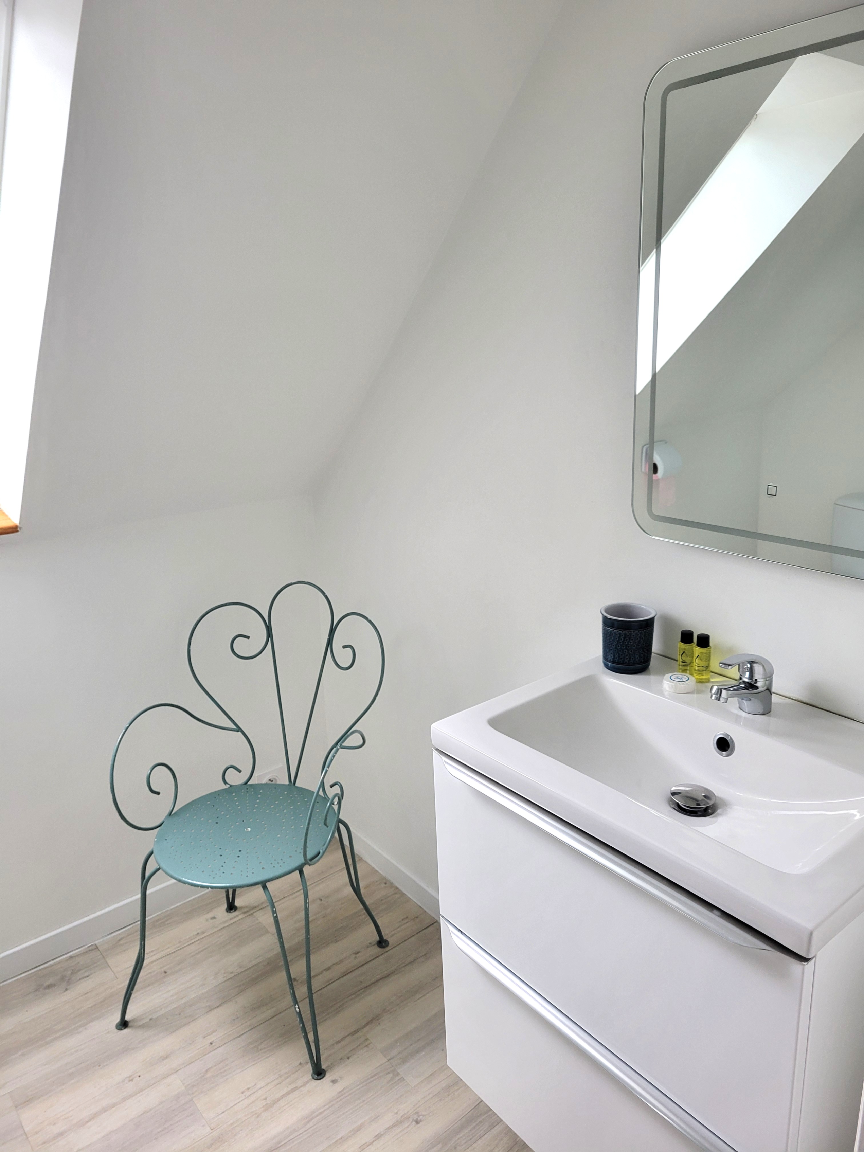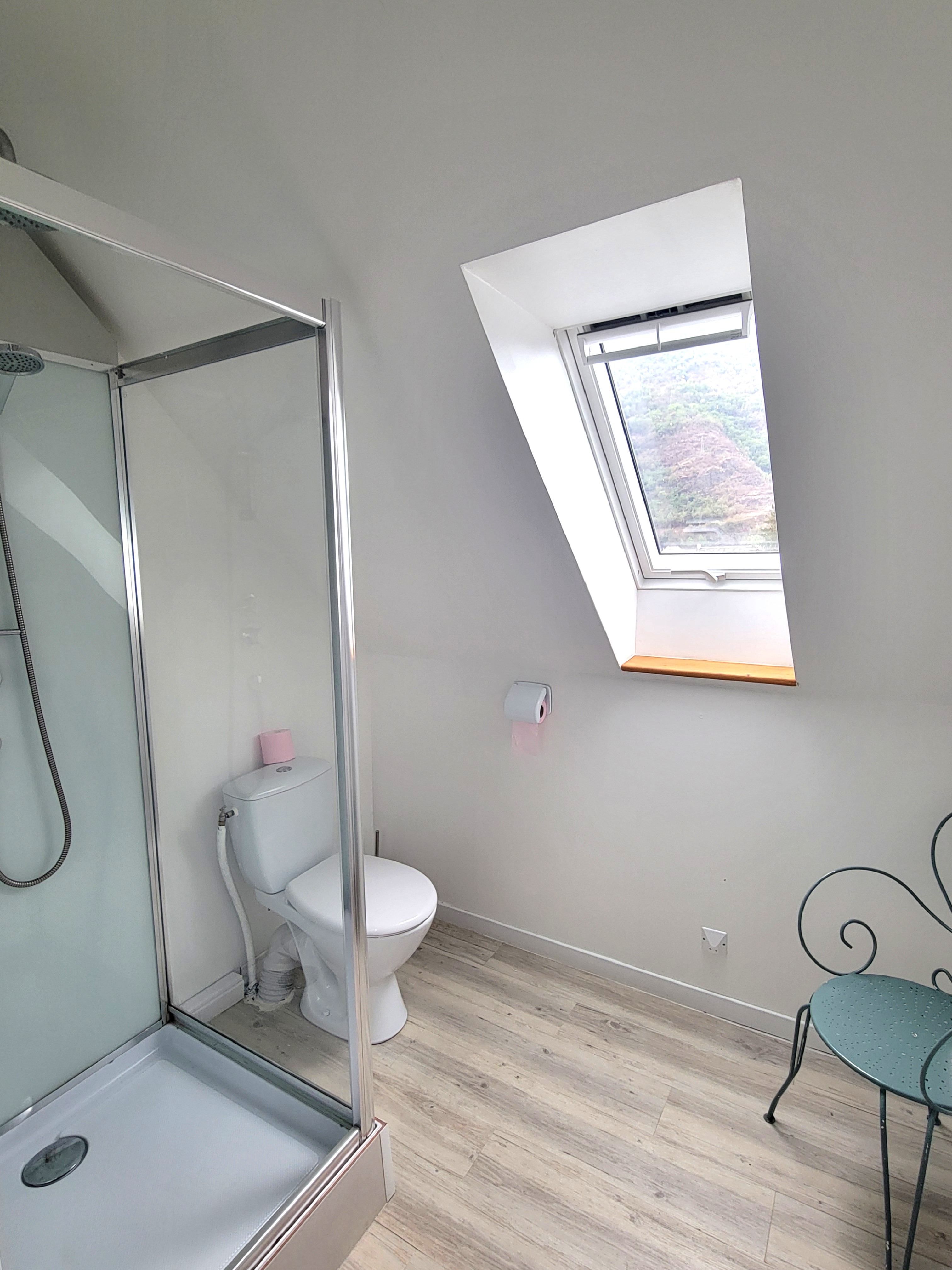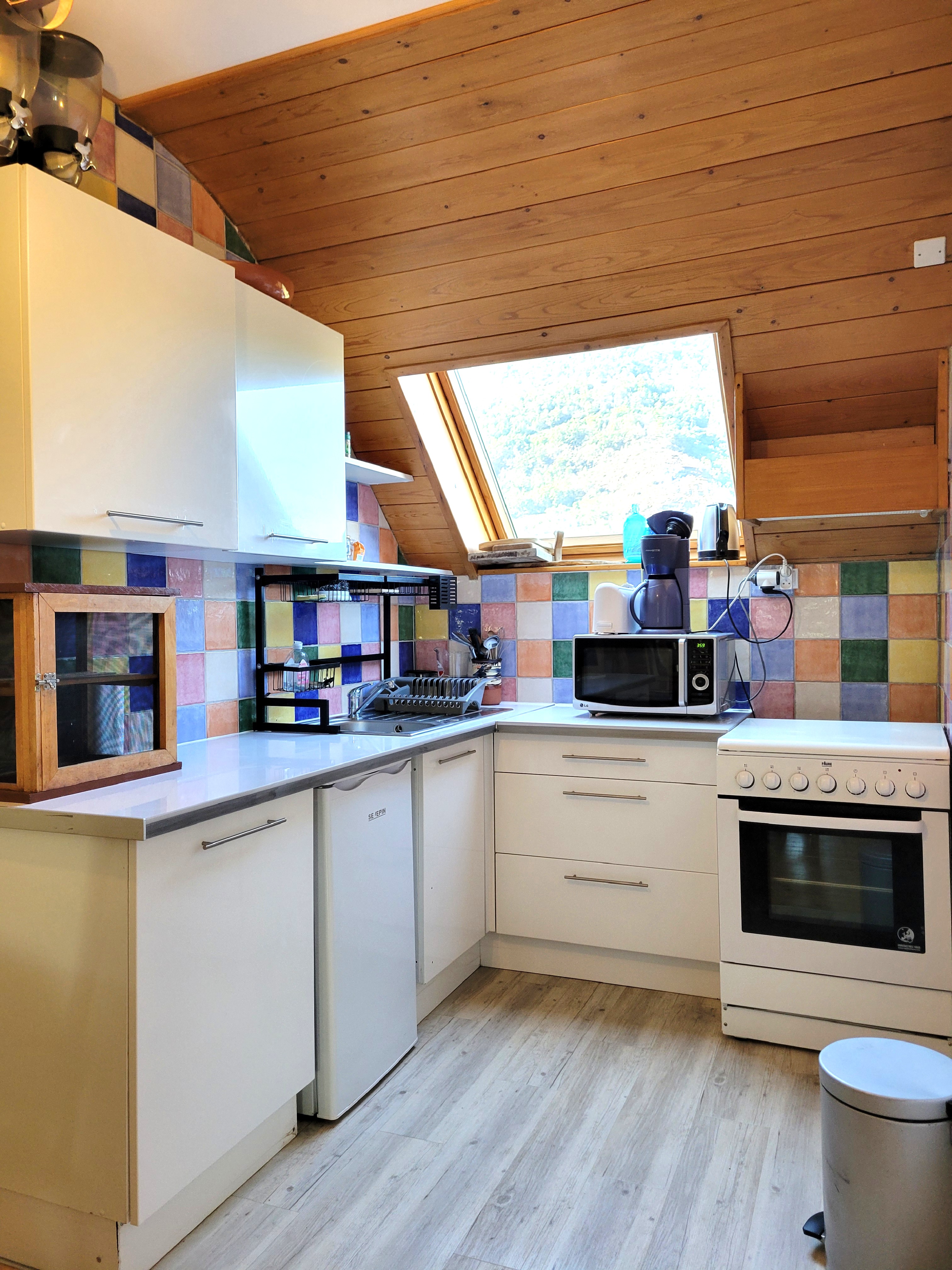 Cuisine équipée (lave-linge, four, micro-ondes, gaz), salle d’eau et WC séparé.