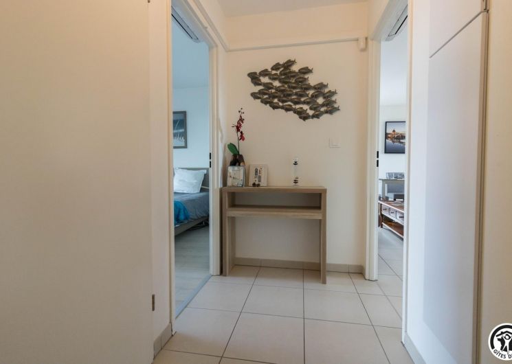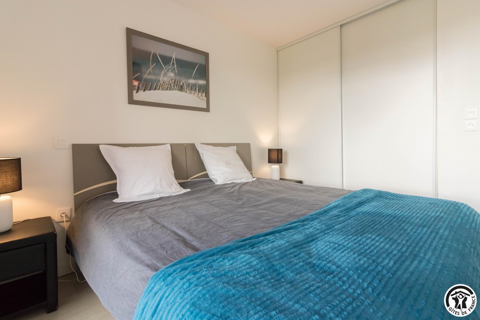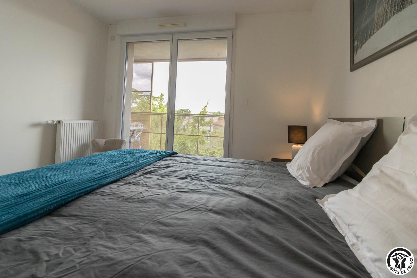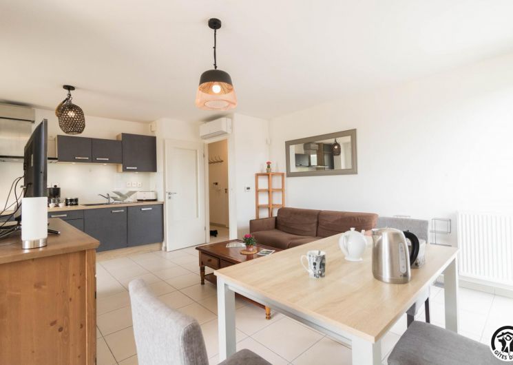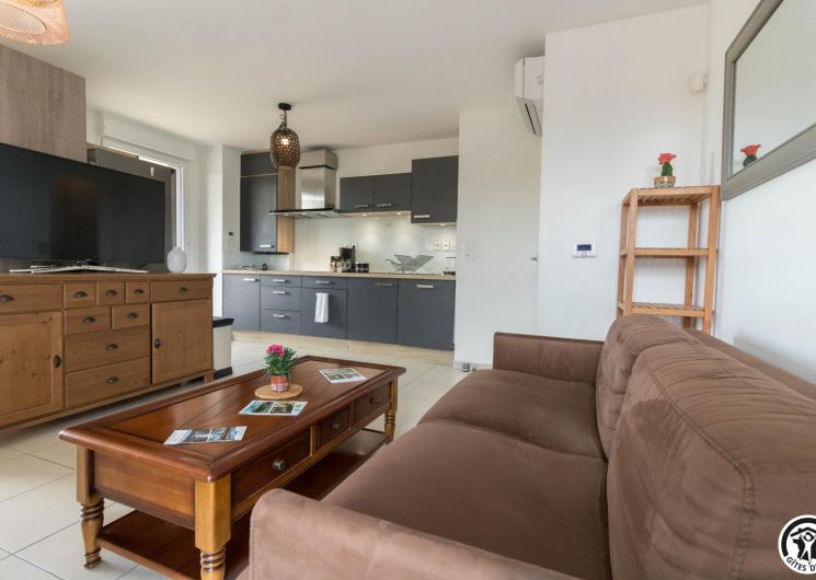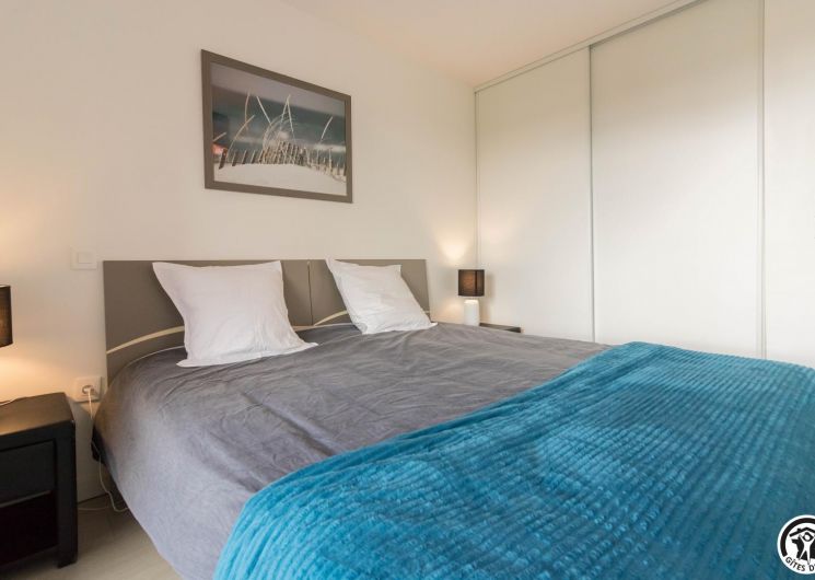 Appartement au deuxième étage (ascenseur) d’une résidence sécurisée avec 1 place privative dans un parking souterrain : entrée, grand séjour (donnant sur une terrasse de 10m2) avec un espace salon (canapé convertible pour 2 personnes en 140*190cm), un espace salle à manger, une cuisine intégrée totalement équipée, une chambre avec 2 lits simples en 90*200cm, jumelables (accès direct à un balcon terrasse) et une salle de bains/WC.