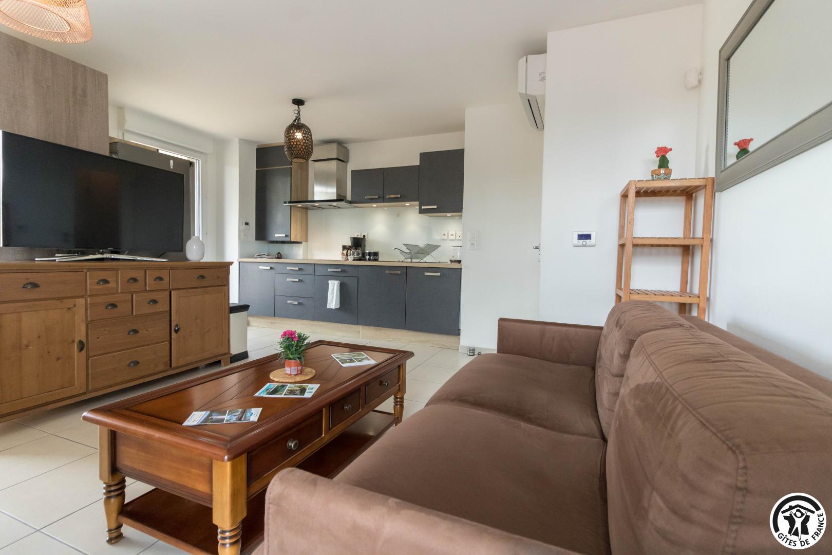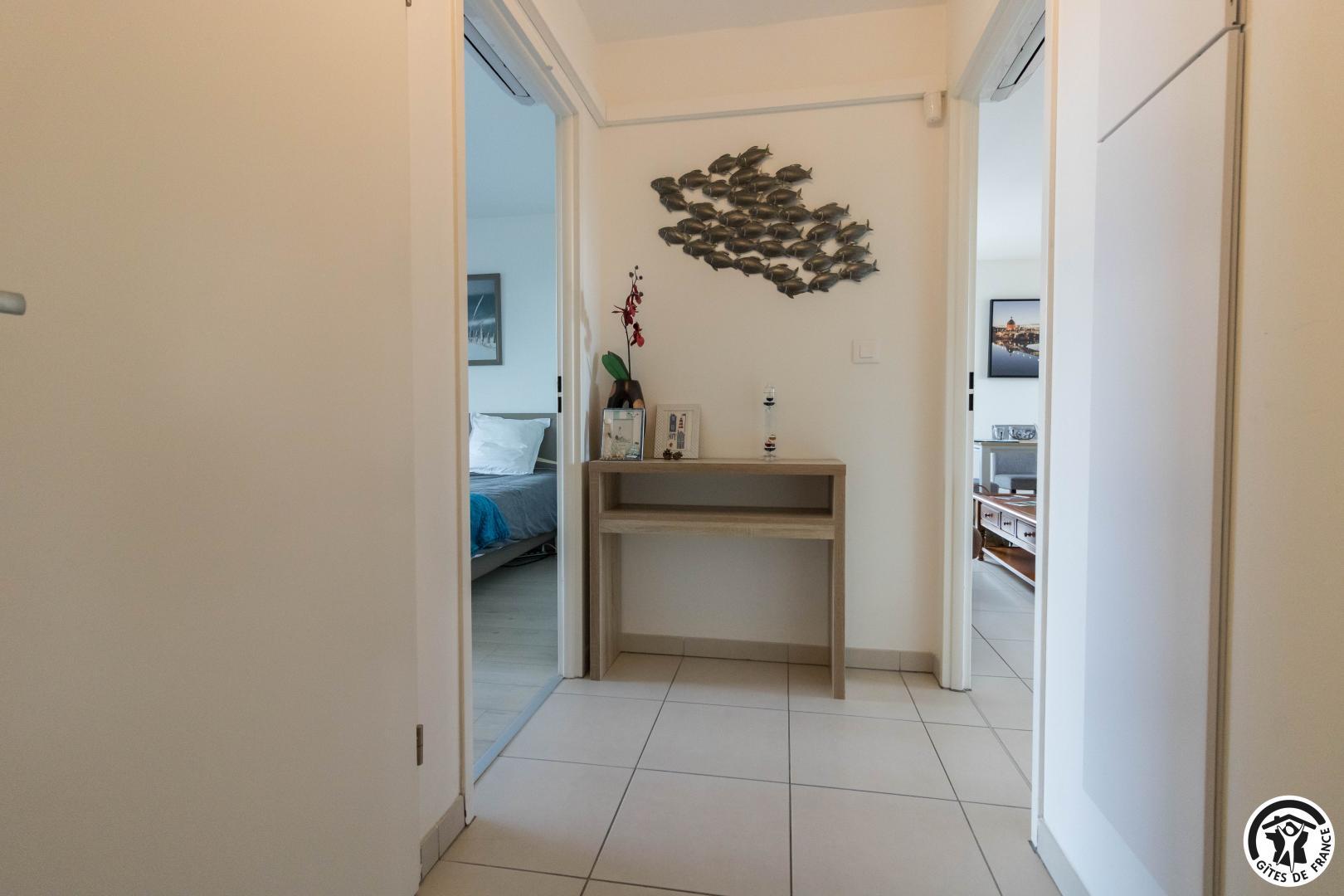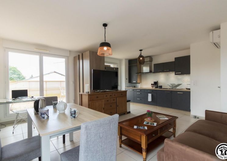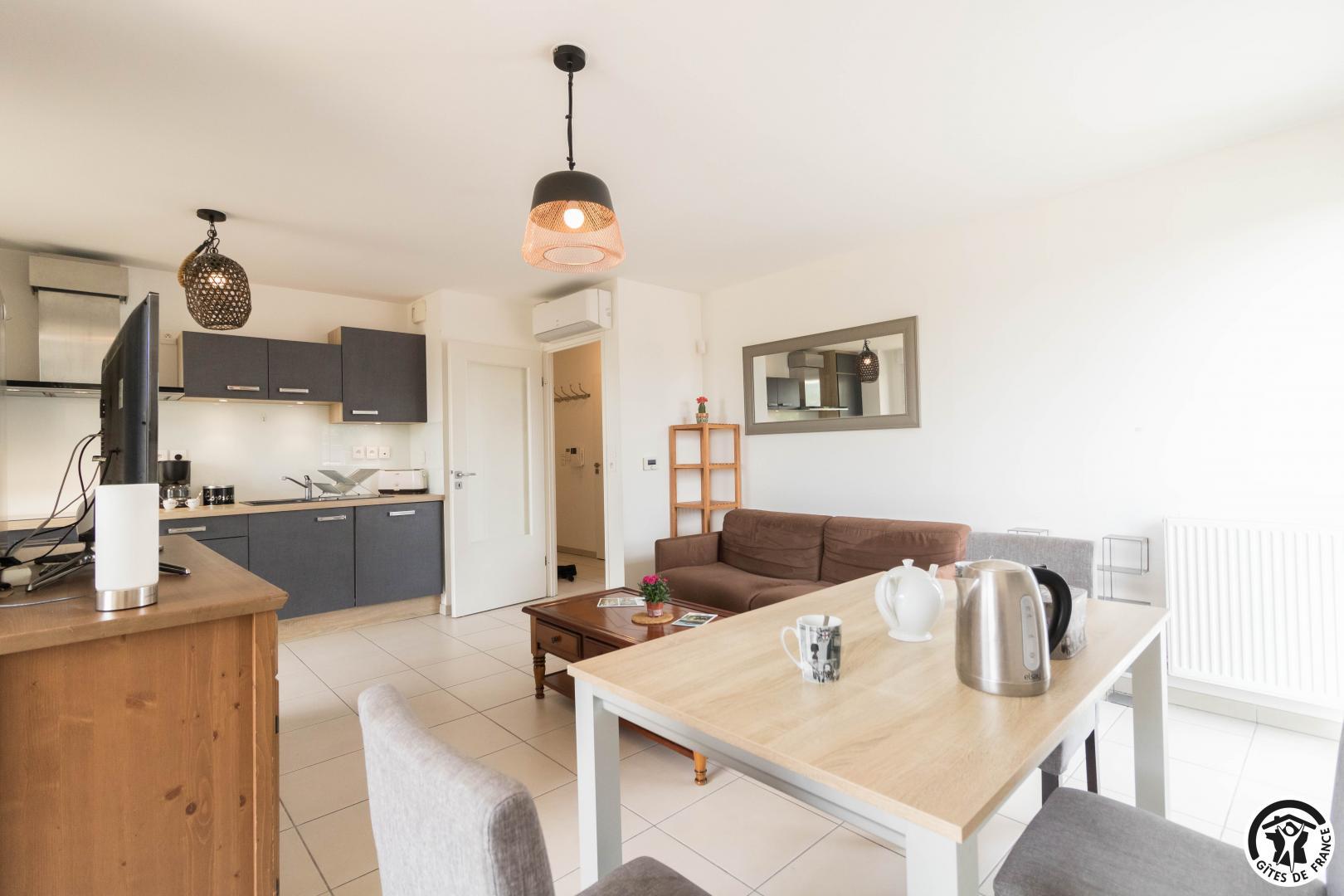 Appartement au deuxième étage (ascenseur) d’une résidence sécurisée avec 1 place privative dans un parking souterrain : entrée, grand séjour (donnant sur une terrasse de 10m2) avec un espace salon (canapé convertible pour 2 personnes en 140*190cm), un espace salle à manger, une cuisine intégrée totalement équipée, une chambre avec 2 lits simples en 90*200cm, jumelables (accès direct à un balcon terrasse) et une salle de bains/WC.