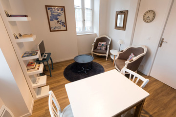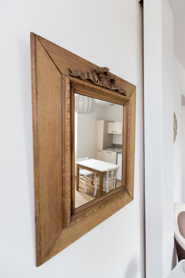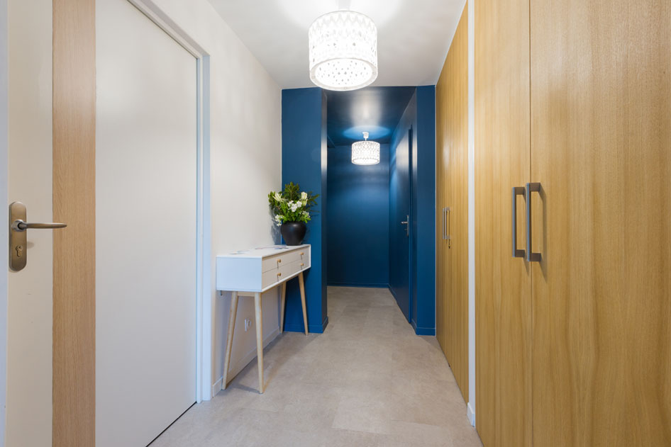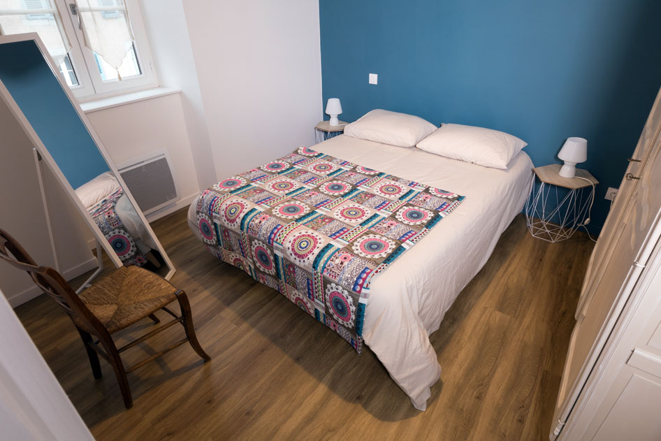 Ambiance romantique et cosy pour ce T2 face au parc des Vignaux, entièrement rénové, où meubles patinés et mur bleu profond s’associent dans un style contemporain.