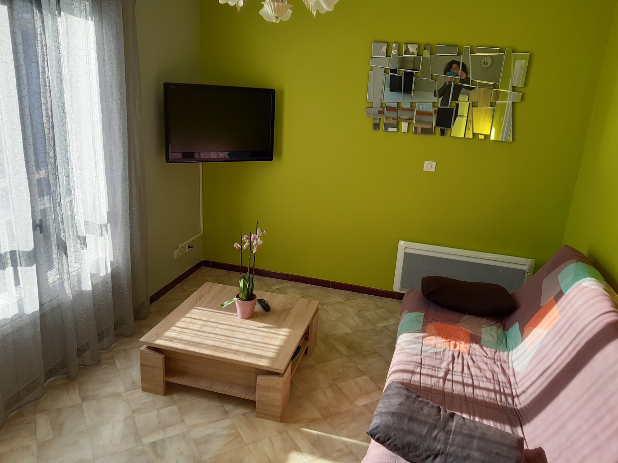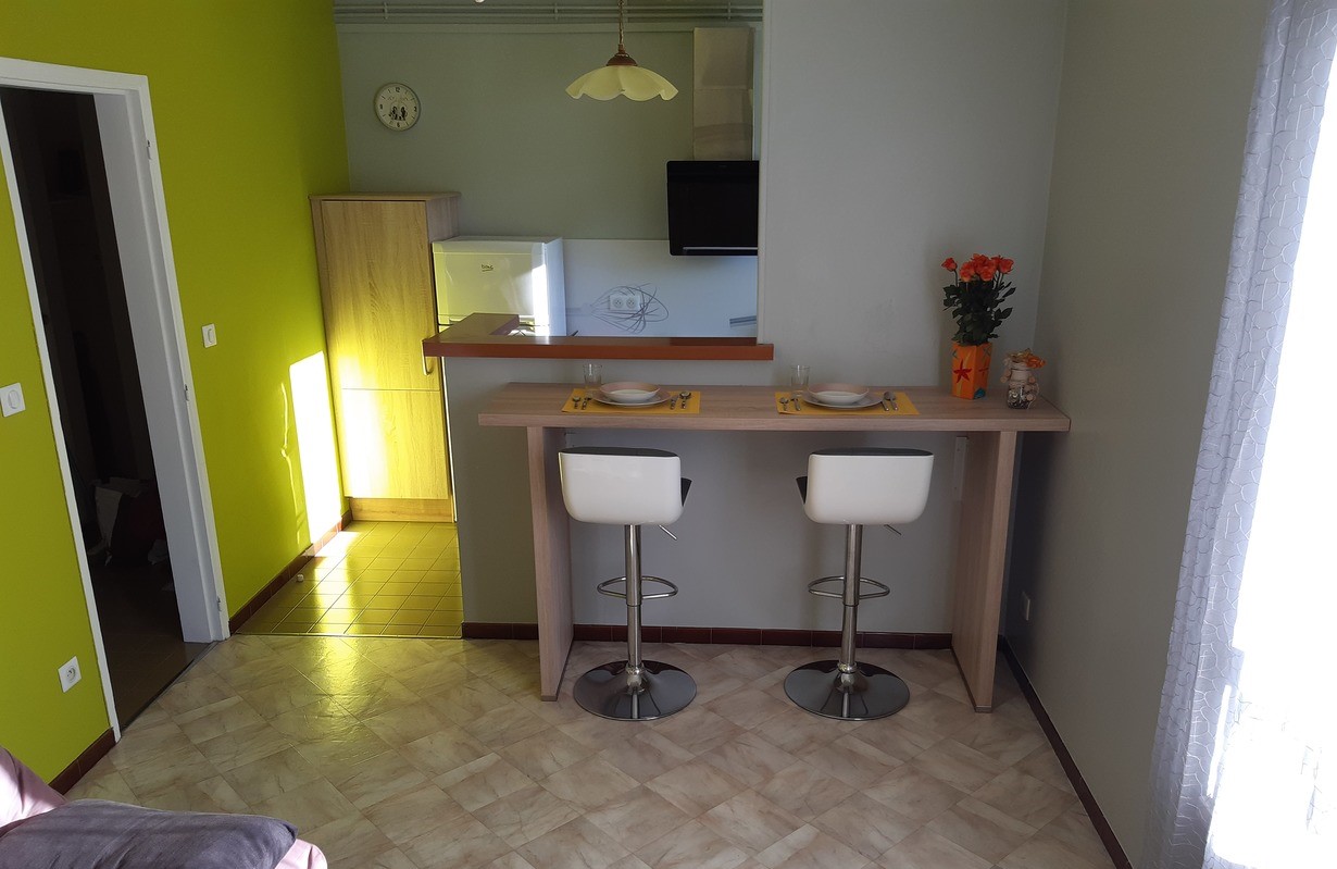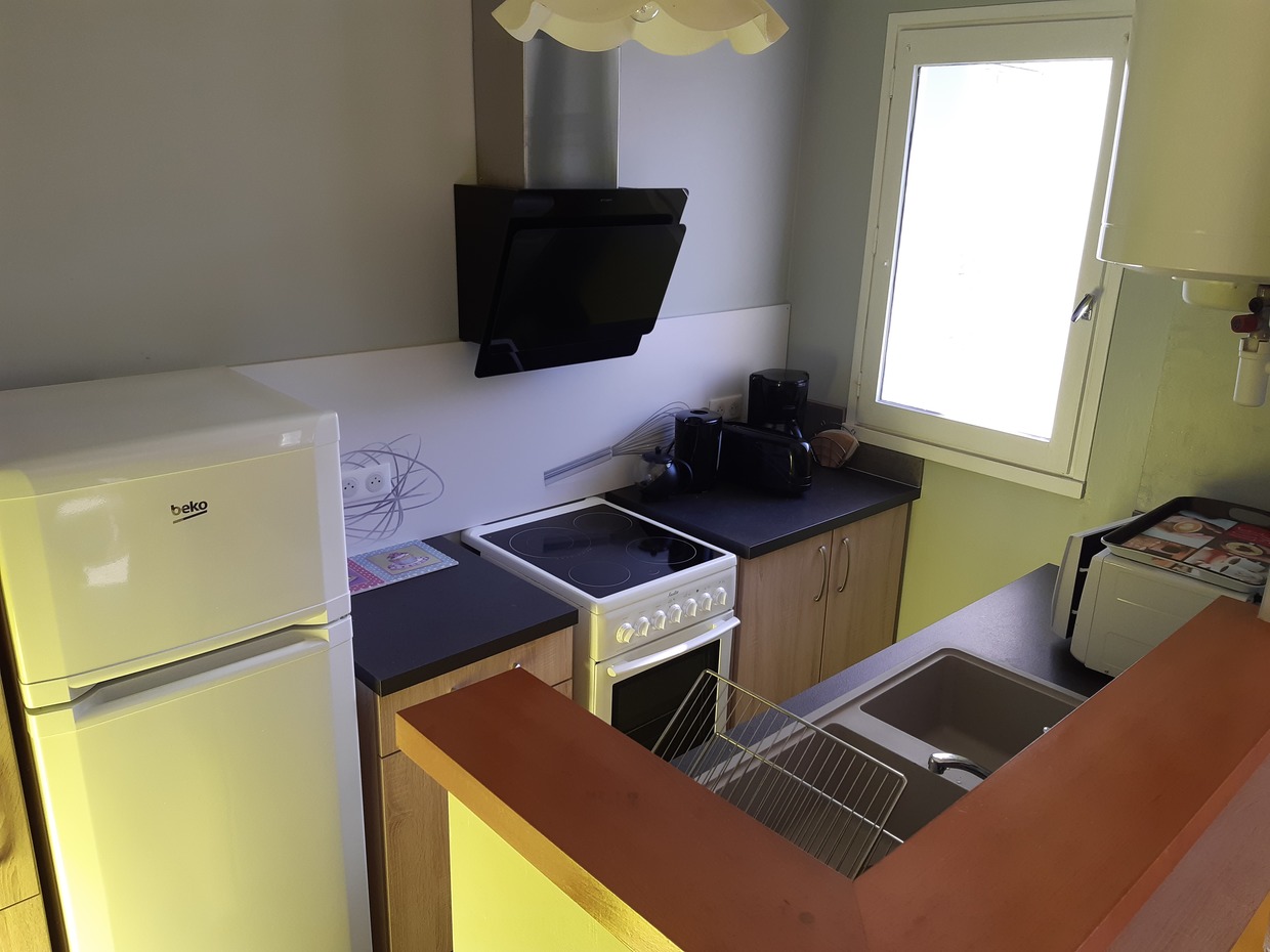 Cuisine ouverte sur le salon avec bar mural, 1 chambre avec lit 140/190, salle d’eau avec une grande douche. TV, micro-ondes, frigo-congélateur, cuisinière avec plaque + four, canapé convertible, machine à laver, placard de rangement entrée + chambre.