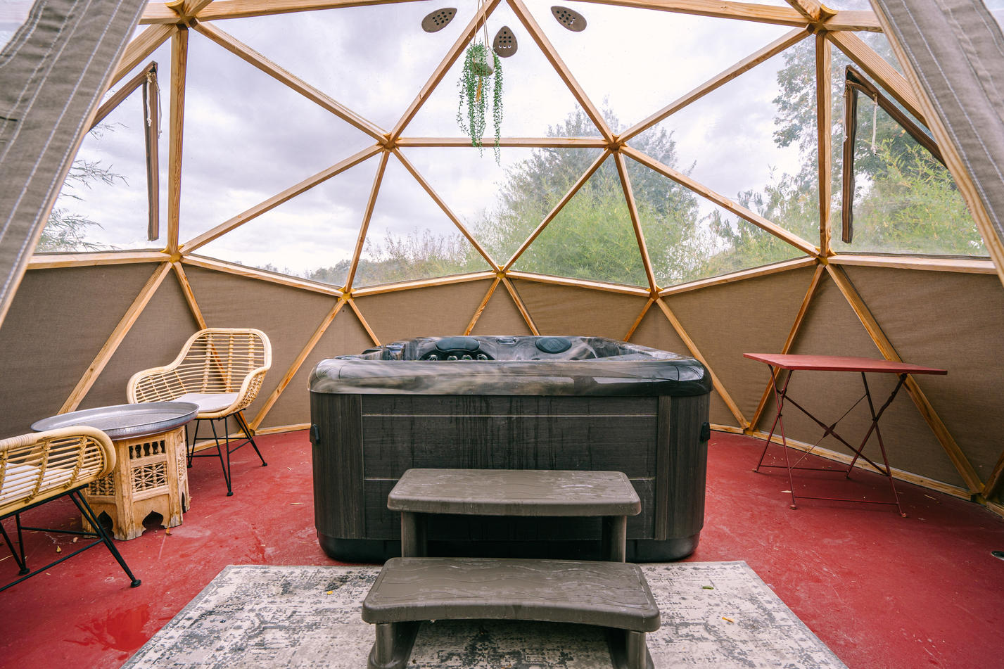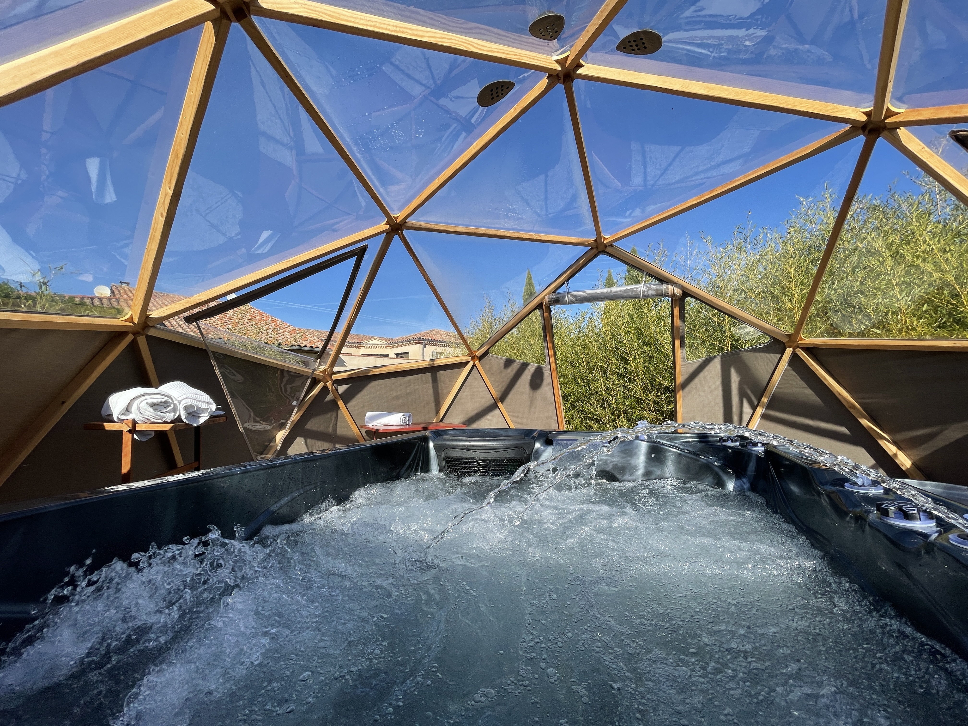 Un appartement situé à l’étage, totalement indépendant, très cosy, tout équipé, avec à l’extérieur son jacuzzi privatif sous un dôme.