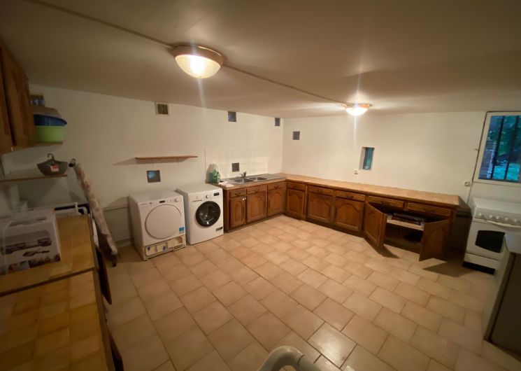 2 entrées vous sont proposées : soit par l’ancien auvent soit par l’entrée originelle qui donne sur un hall avec un wc et un lavabo, rangement. Cette entrée donne sur la salle de jeux investit par des jeux enfants et adultes, un piano droit. De ce couloir on arrive dans un salon salle à manger ouvert sur cuisine. Salon avec cheminée, 3 canapés, TV, table de salon, table de salle à manger avec un banc et des chaises, donnant sur la cuisine ouverte qui est équipée d’éléments intégrés (four avec vapeur, micro-ondes, lave-vaisselle, réfrigérateur américain, plaque à induction). Un deuxième sas dessert une chambre totalement indépendante avec 1 lit 160 x200 une salle d’eau privative avec wc. Par l’entrée « vestibule » sous auvent équipée d’étagères chaussures et vestiaire, on trouve une grande buanderie avec lave-linge, sèche-linge et réfrigérateur d’appoint.