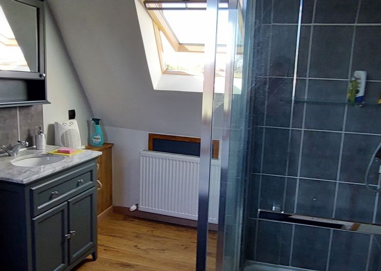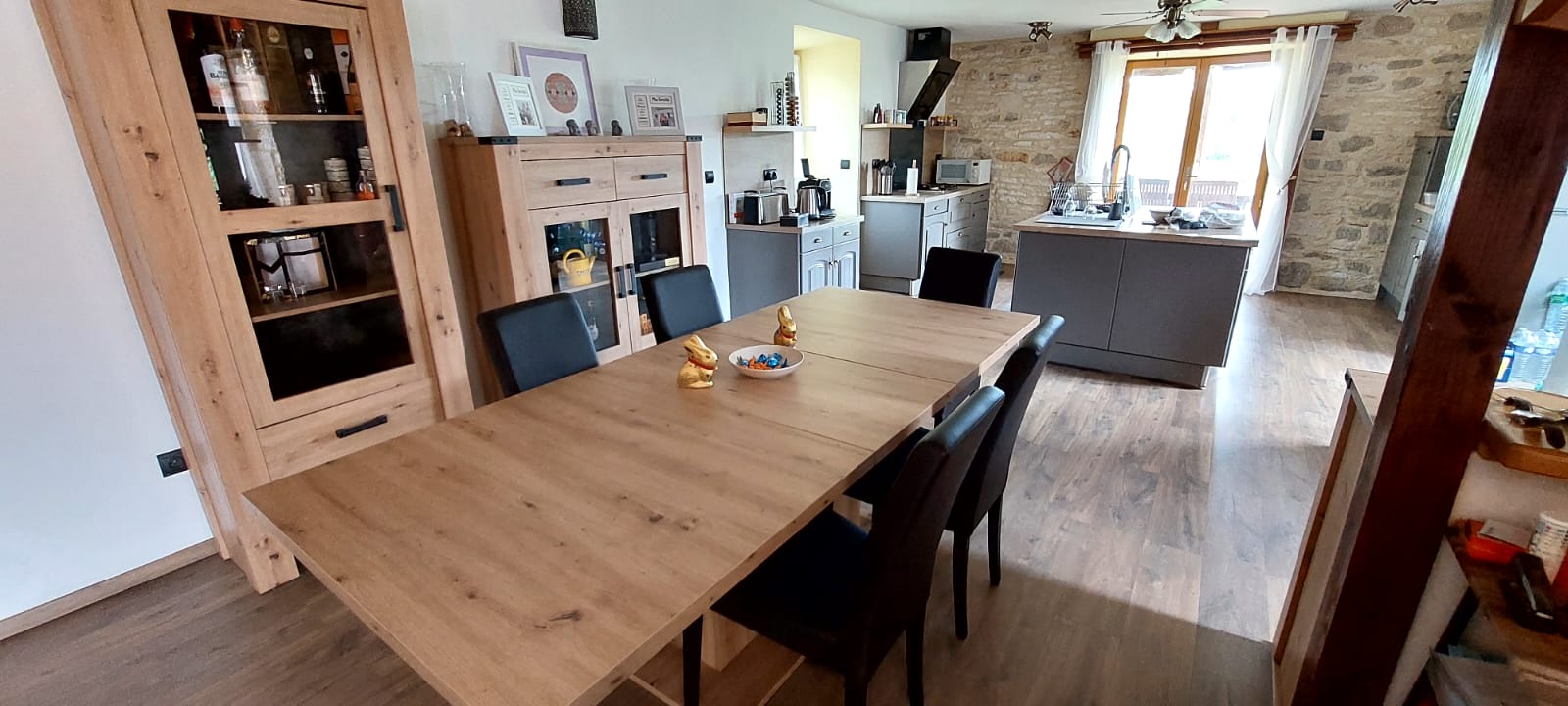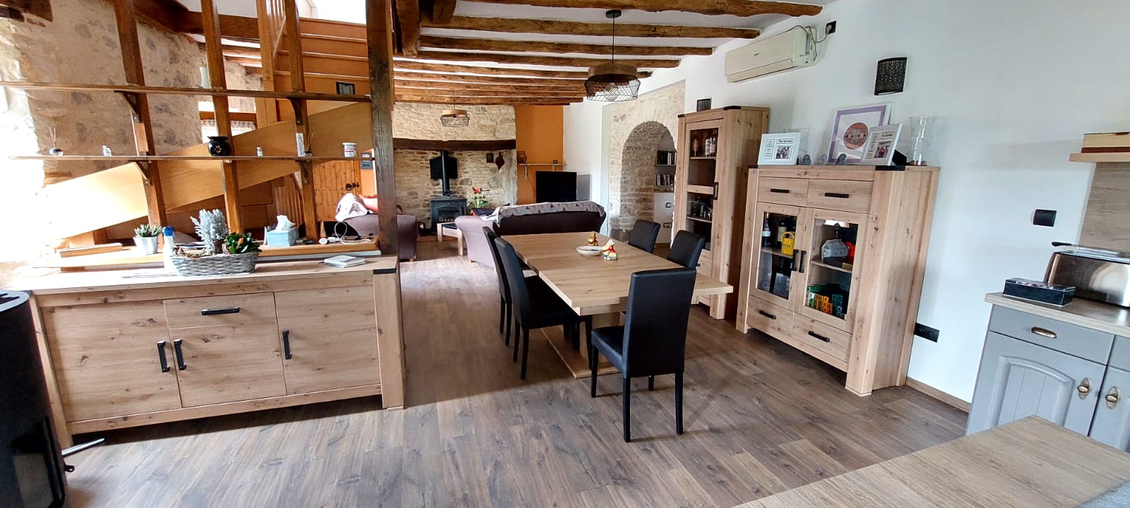 Maison climatisée en duplex pouvant accueillir 7 personnes Au rez-de-chaussée, une grande pièce à vivre (plus de 70 m2), dans laquelle se trouve : – Une cuisine toute équipée avec îlot central (1 grand réfrigérateur, 1 congélateur à tiroir, 1 four, 1 micro-ondes, 1 lave-vaisselle, 1 lave-linge, 1 cafetière expresso, 1 toaster, 1 bouilloire, vaisselle et ustensiles de cuisine pour 7 personnes ; Torchons et produits ménagers de base sont fournis sans supplément ainsi que certains condiments de base (sel, poivre, huile, vinaigre) ; – Une salle à manger (1 grande table de 280 cm, 1 argentier, 1 buffet, 1 vitrine ; – Un salon (2 confortables canapés 3 places, 1 télévision de 146 cm ; – Une alcôve avec 2 lits de 80x200cm Le tout agrémenté d’une cheminée avec poêle à bois. * A l’étage, deux suites parentales équipées chacune d’une salle d’eau avec toilettes + 1 chambre simple