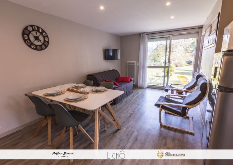 Appartement de 38 m² comprenant : Une cuisine équipée ouverte sur une salle à manger, un salon avec un BZ (en 140), une chambre (1 lit en 140), une salle d’eau (douche) et un WC indépendant. La location bénéficie d’une place de parking privative et d’une cave pour ranger vélos et skis. Le plus : De la terrasse donnant sur un parc de 2000 m2 au bord du Gave d’Azun, vous profiterez de la vue sur les sommets du Hautacam. A savoir : possibilité de location de linge de lit et de linge de toilette.
