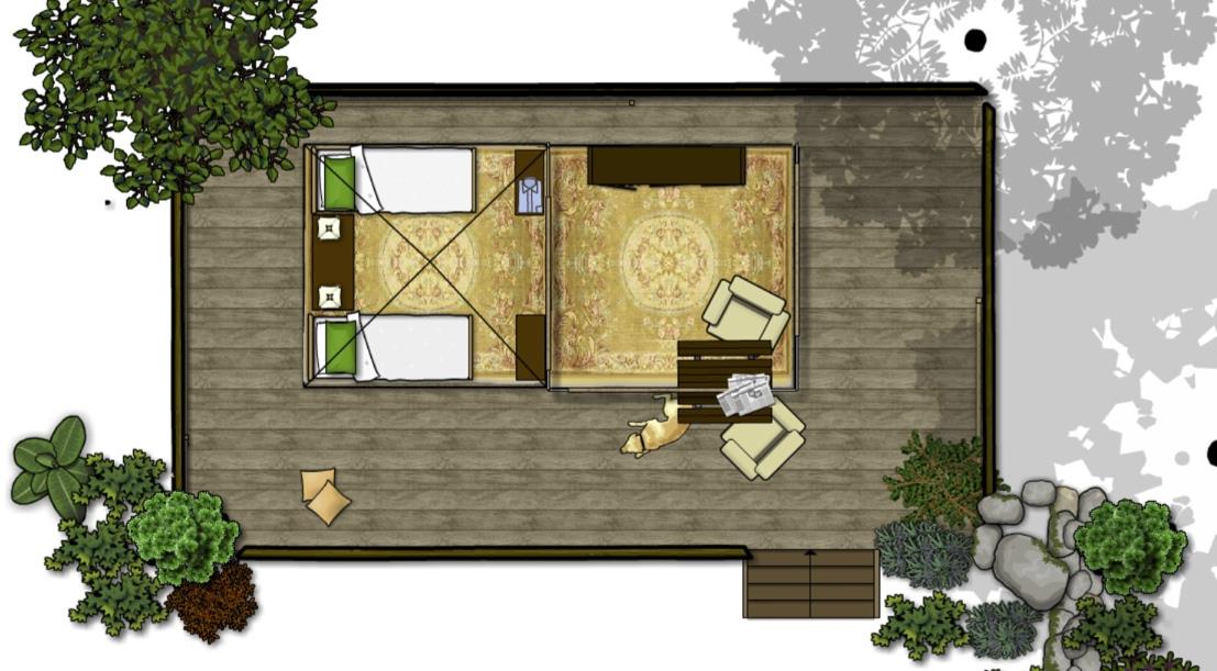 Profitez du confort de deux lits (90 × 190) sous une tente en coton et laissez-vous bercer par les bruits de la nature environnante. L’extension couverte de 11 m² agrandit votre espace de vie et peut être entièrement fermée la nuit. Les draps et les serviettes sont inclus. Il n’y a pas de point d’eau courante sur le dome lodge.