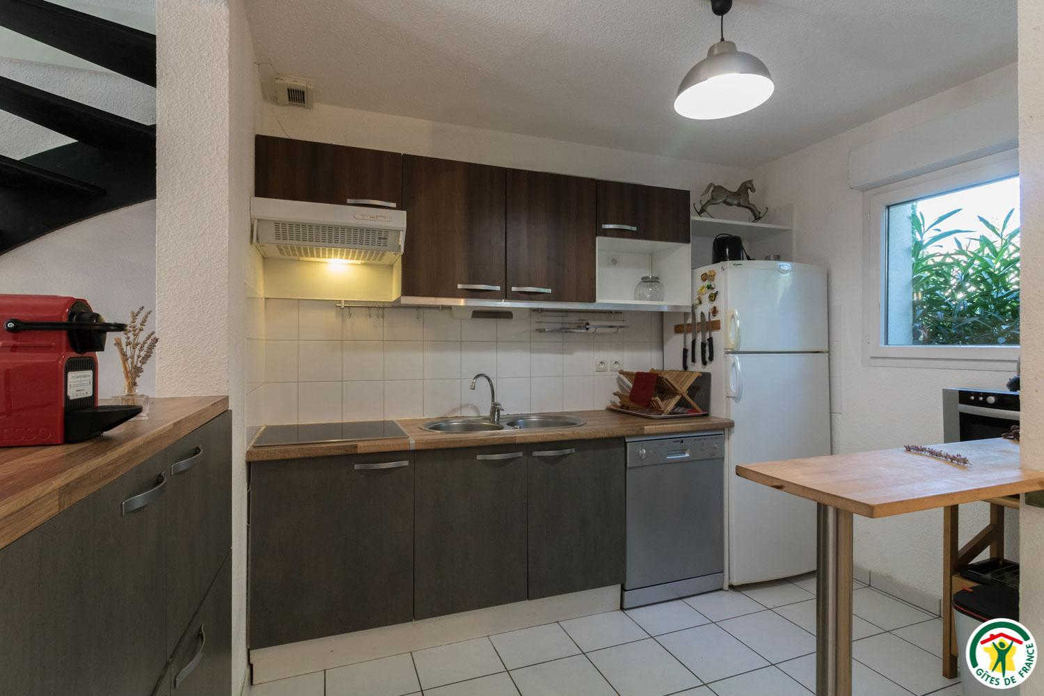 – au rez-de-chaussée : entrée, coin-cuisine, séjour ouvrant par une large baie vitrée sur une terrasse et un petit jardin clos privatif.