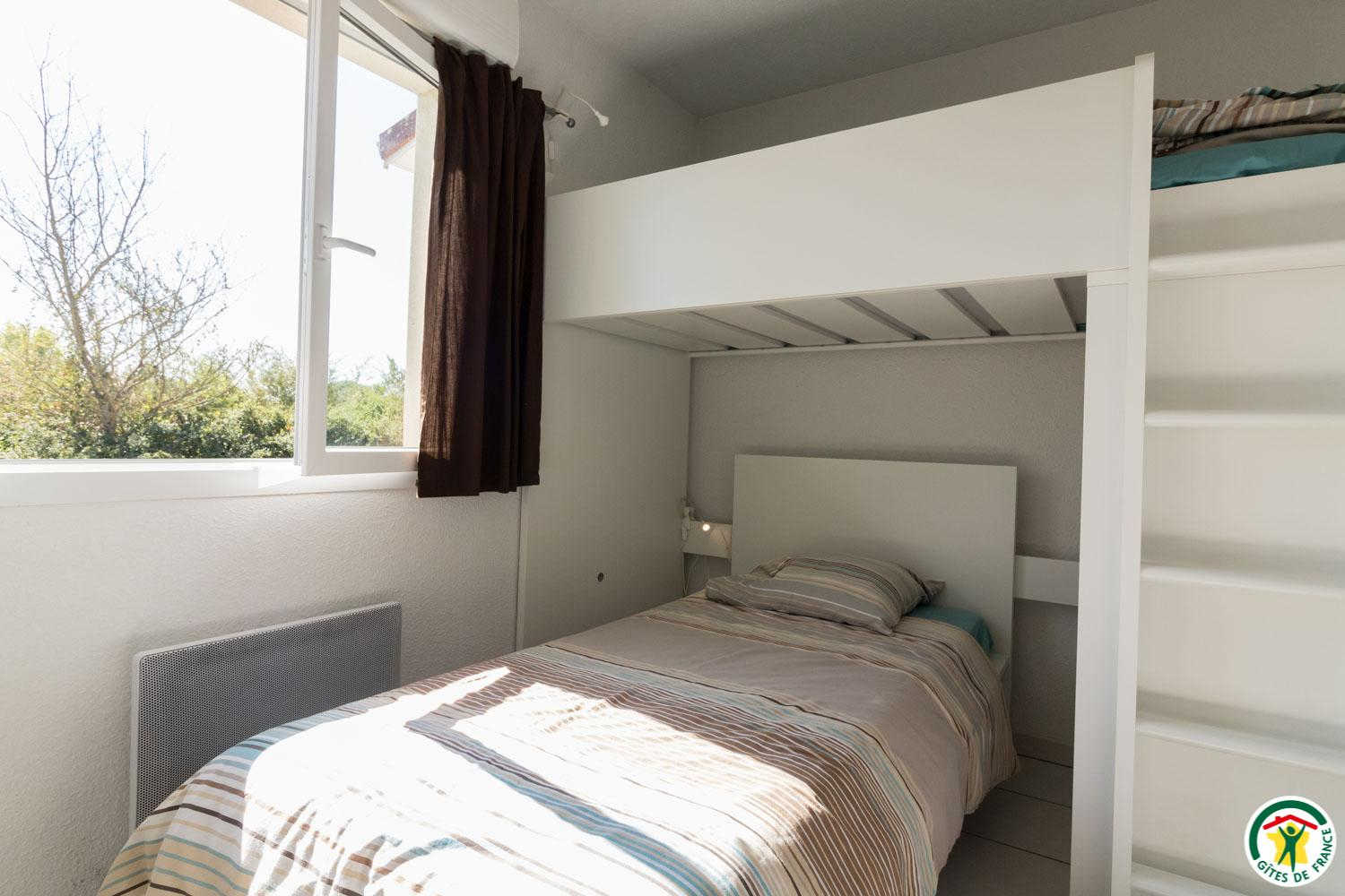 – à l’étage : un dégagement dessert 2 chambres (2 lits 1 personne en 90cm jumelables) (2 lits 1 personne en 90cm dont un mezzanine), une salle d’eau et un WC.