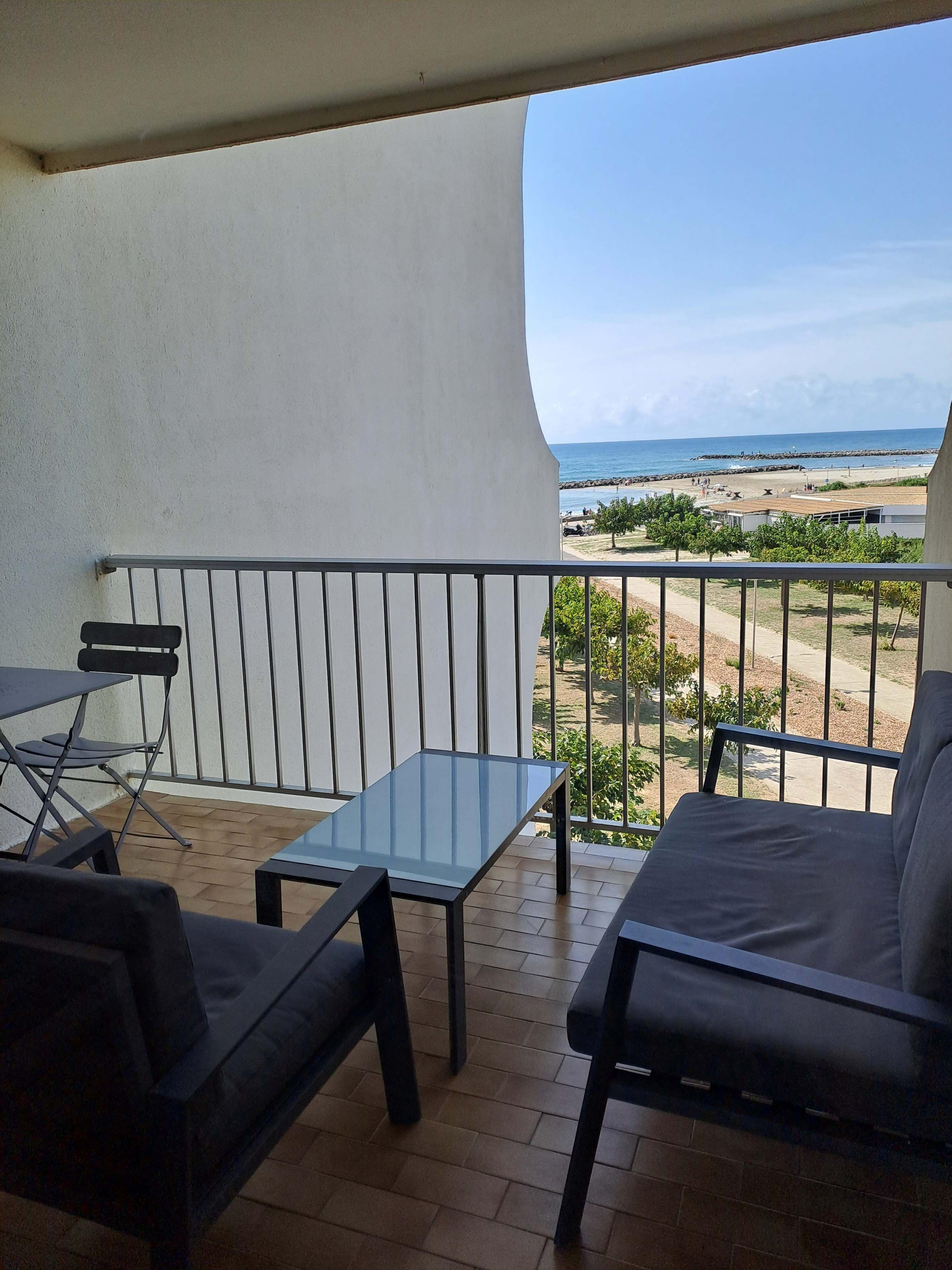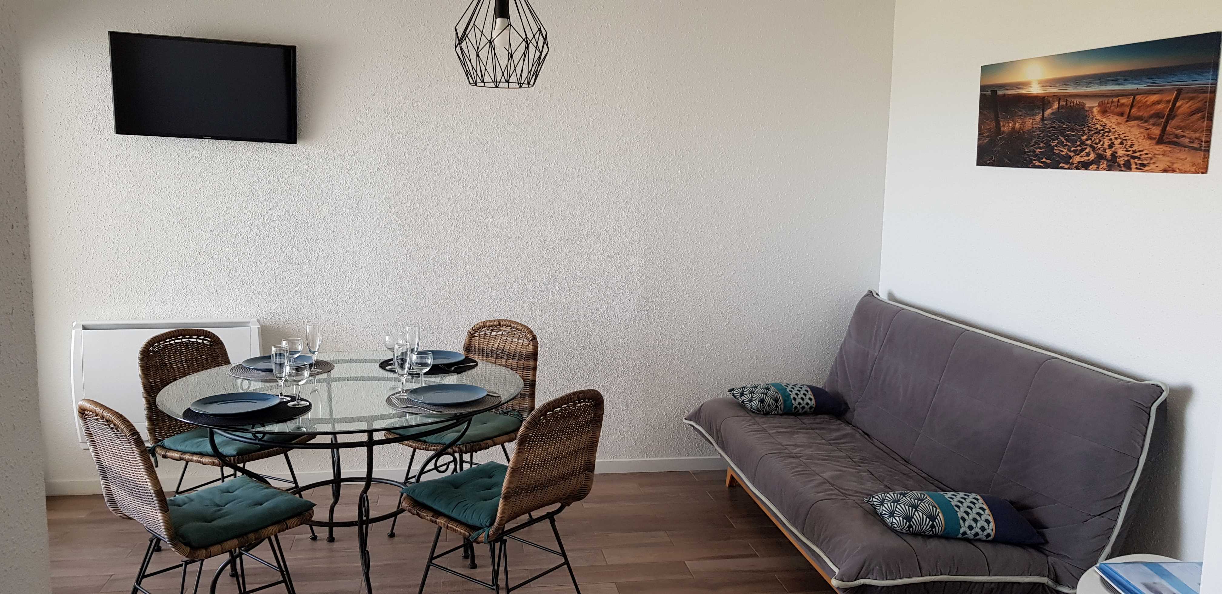 Appartement T2+cabine de 41 m2 pour une à quatre personnes, situé rive droite, résidence Le Soleil de la Mer (Institut Saint-Pierre à 250 mètres). Vue mer depuis l’appartement et la terrasse ( orientation sud-ouest.)