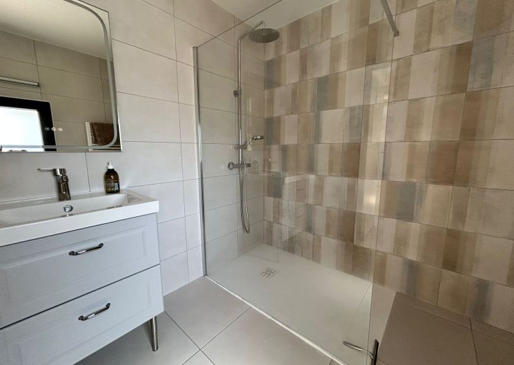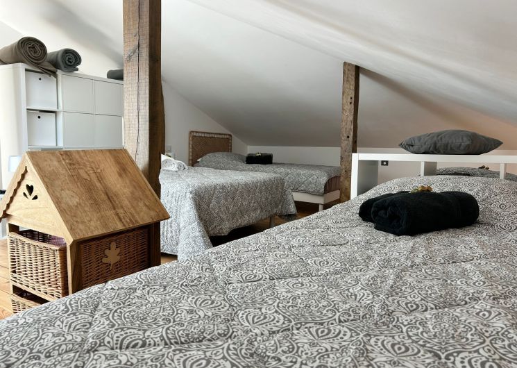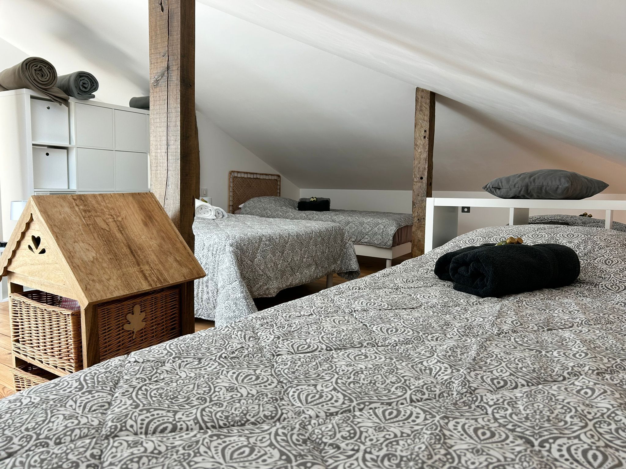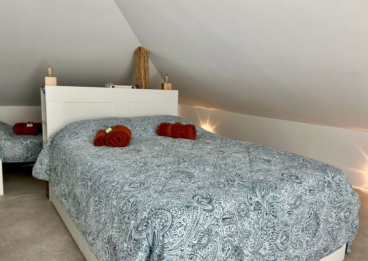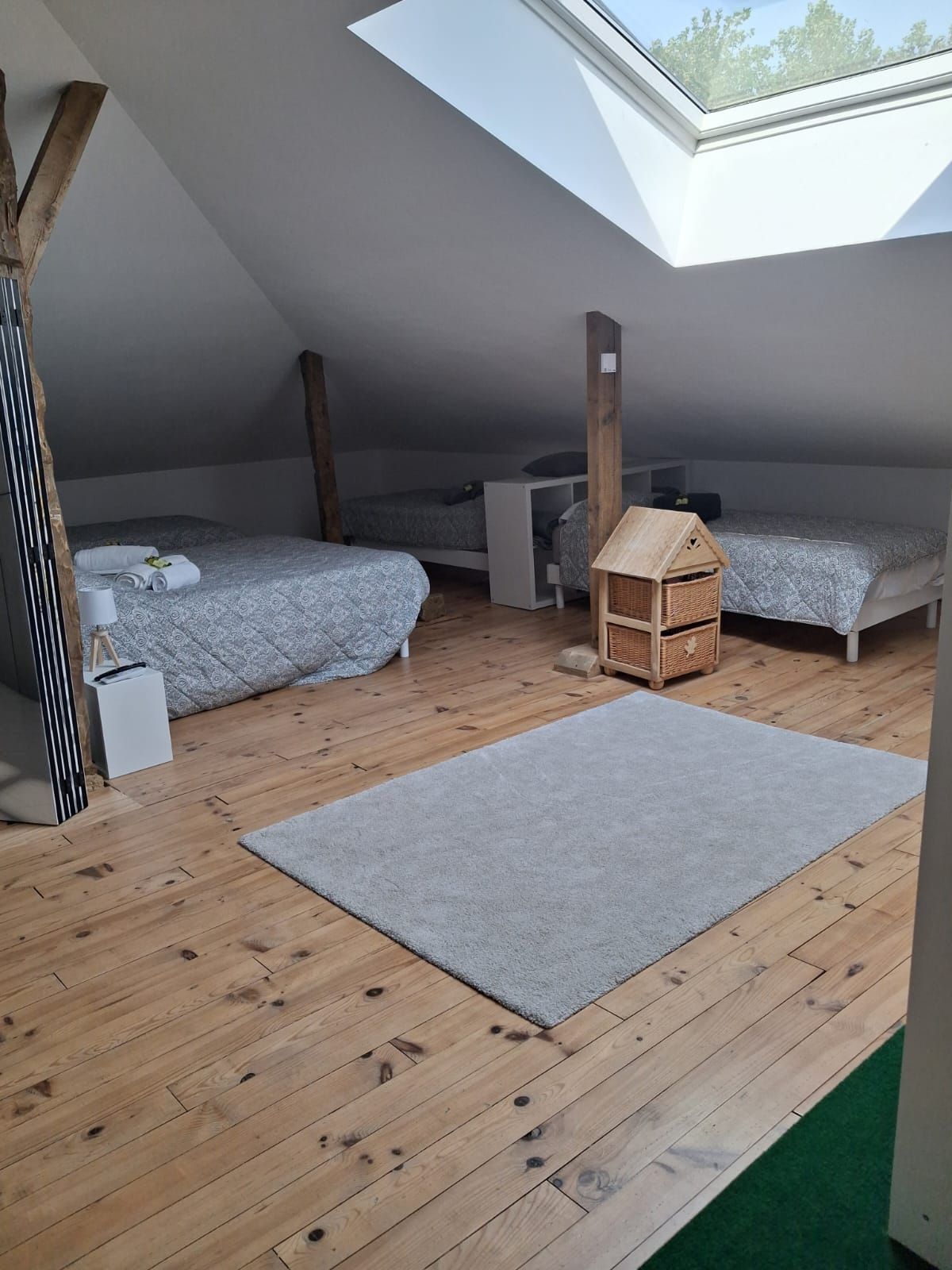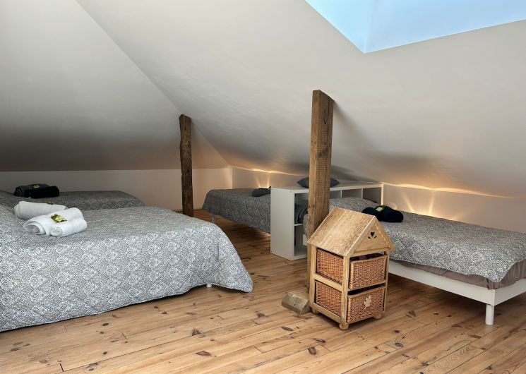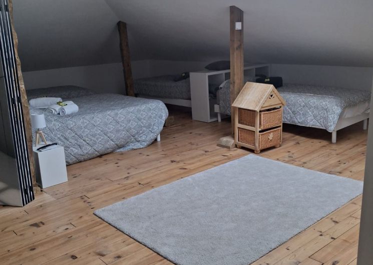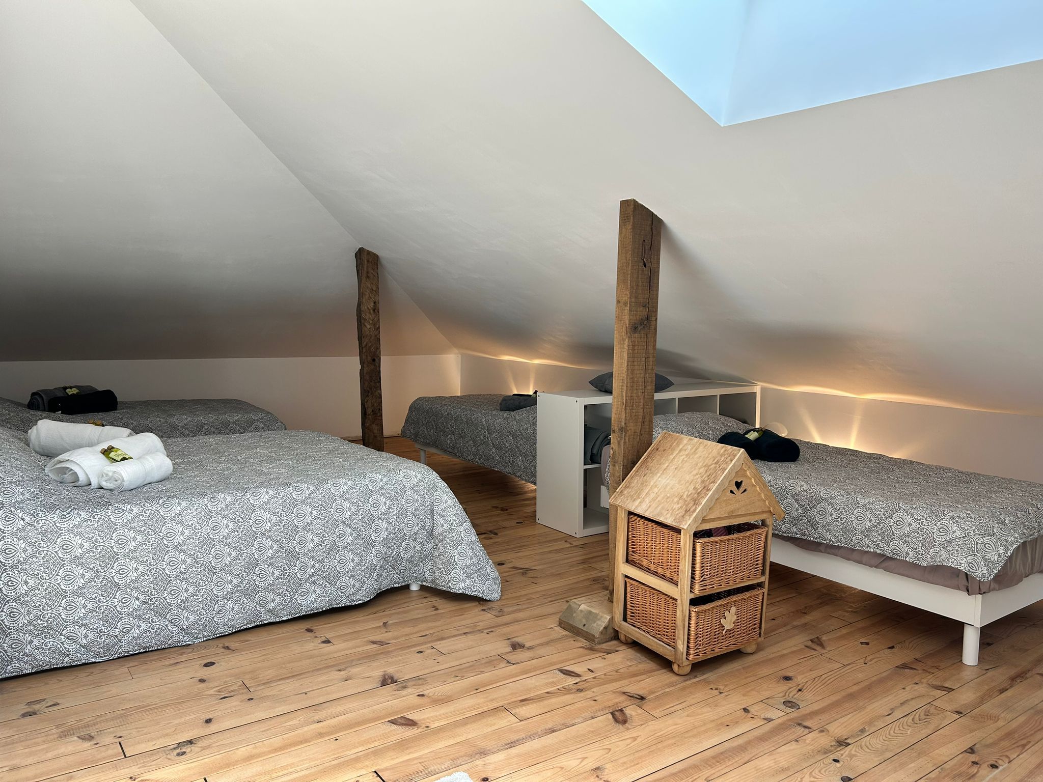 Vous trouverez en rez-de-chaussée, un grand séjour avec cuisine, salon, salle à manger, une grande salle d’eau avec 2 douches et 2 lavabos, une chambre parentale (1 lit 160) avec salle d’eau privative, un wc indépendant. L’étage mansardé se compose d’un espace dortoir avec 3 lits 90, 1 lit 140, jeux et espace détente idéal pour enfants et ados, et pour une intimité préservée 2 autres chambres avec séparation comprenant 1 lit 140 et 1 lit 90 pour l’une et 1 lit 140 pour l’autre, un wc avec lavabo et grands placards à disposition.
