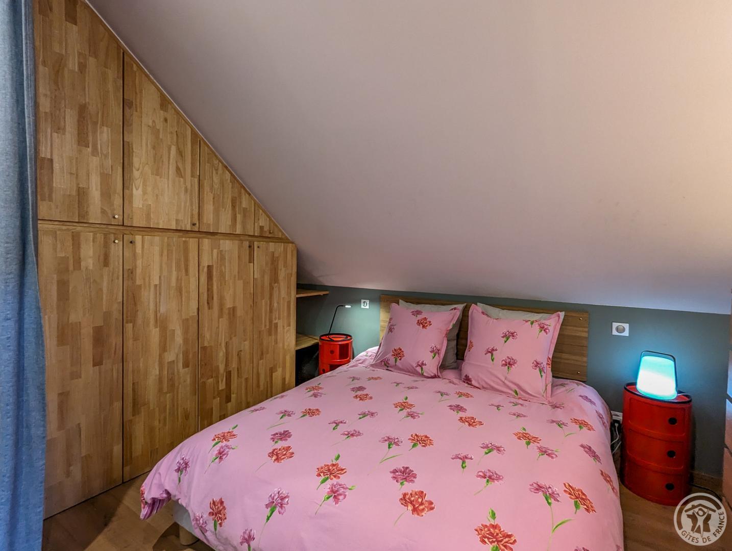 Gîte de plain pied : entrée, pièce de rangement/dressing et rangement skis/chaussures etc… Pièce de séjour avec cuisine intégrée donnant sur les montagnes (poêle à granulés), coin-nuit séparé du séjour par des rideaux, salle d’eau, WC indépendant. Chauffage électrique en complément du poêle.
