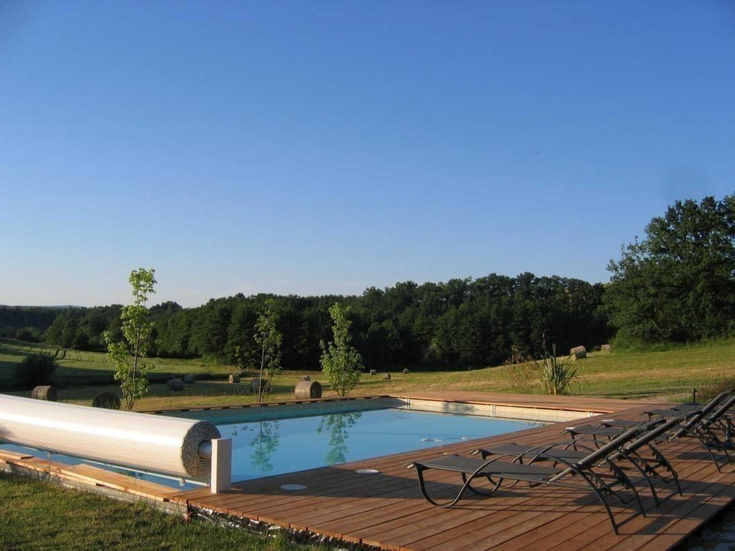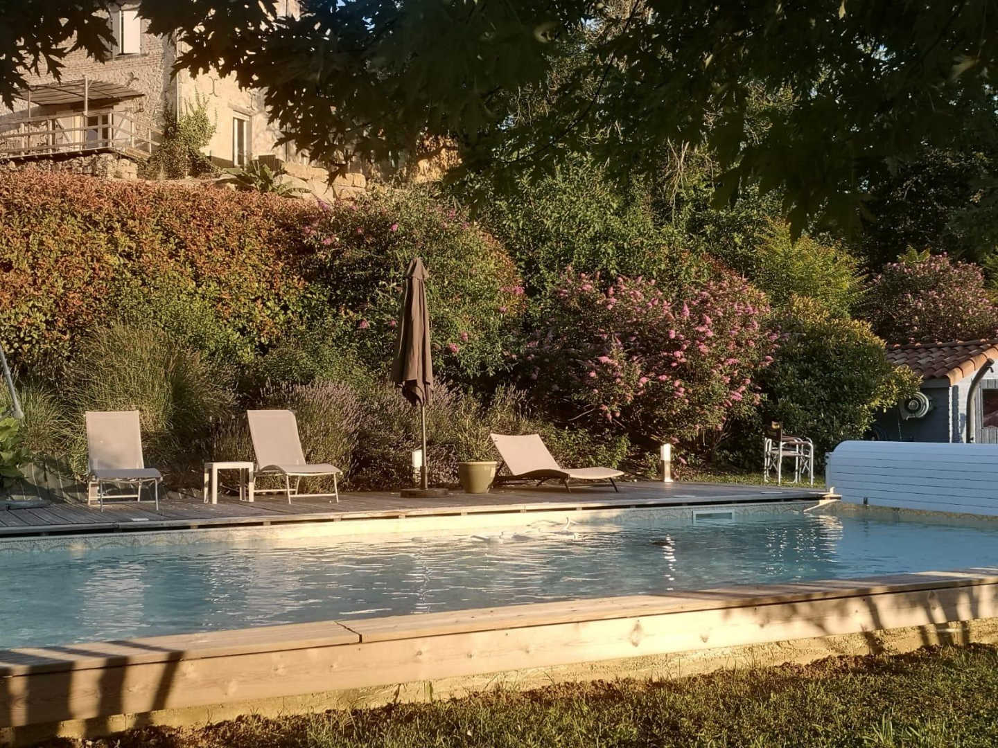 Piscine chauffée en contre-bas de la maison, face aux champs occupés par les chevaux, à par