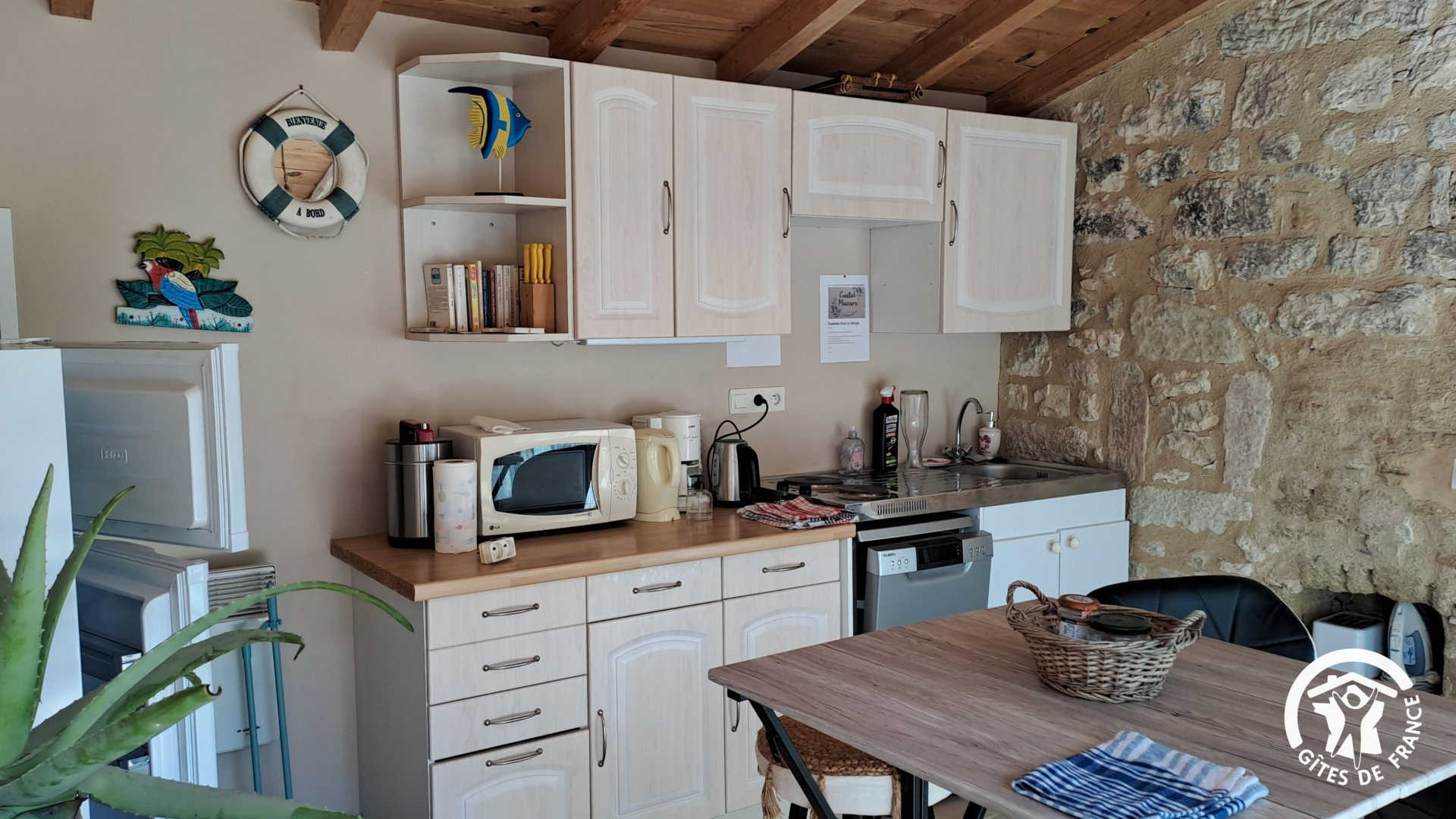 – Cuisine accessible depuis l’extérieur avec baie vitrée. Equipements : petit lave-vaisselle, mini-four combiné, réfrigérateur – congélateur, bouilloire, cafetière à filtre et Nespresso, grille-pain, 2 plaques électriques et micro-ondes.