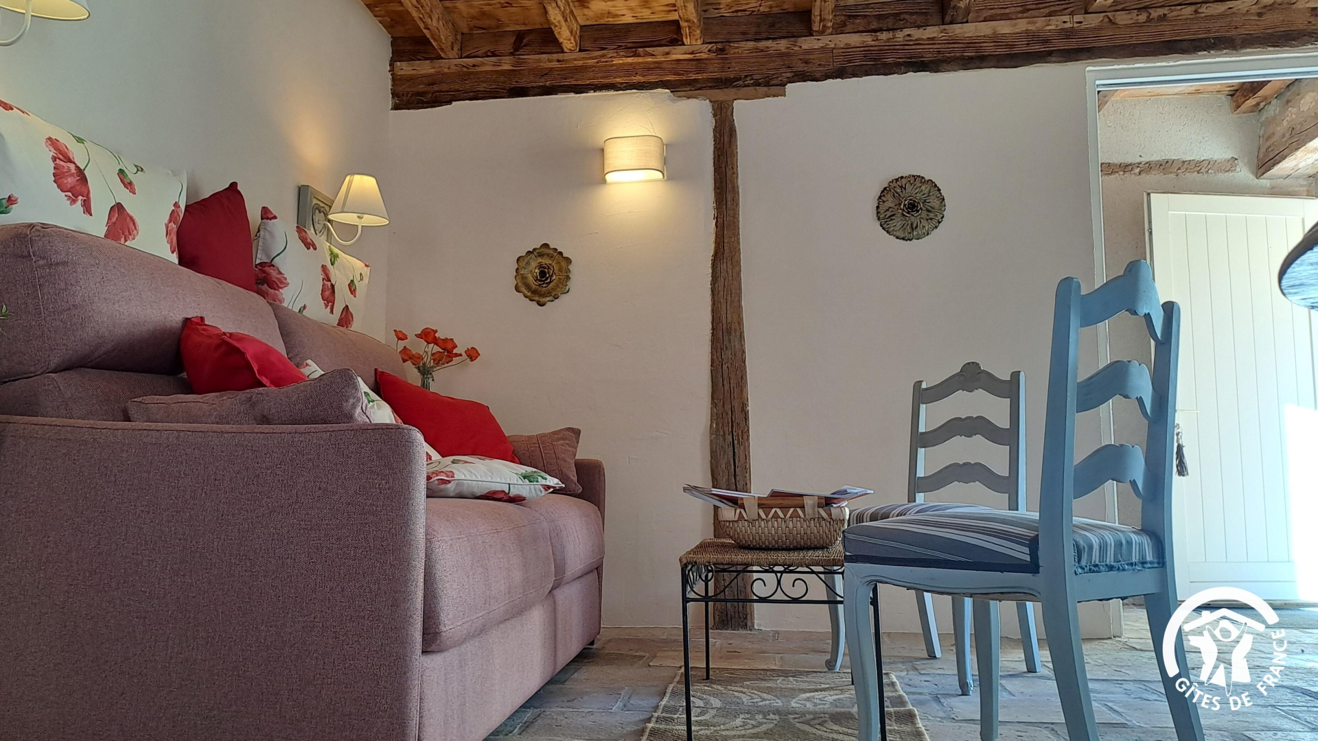 – Salon avec canapé convertible confortable, table à manger et TV. Depuis le salon, salle d’eau avec lave-linge, douche, vasque et wc séparé. Entre le salon et la cuisine : 3 marches.