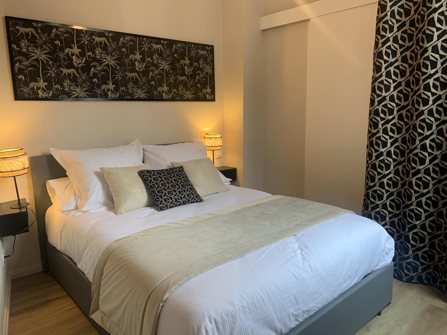 L’espace se compose d’un séjour lumineux avec cuisine ouverte équipée (four combiné, plaque induction, réfrigérateur, cafetière filtre et expresso, bouilloire), et d’une chambre indépendante. La salle d’eau dispose d’une cabine de douche, d’un sèche-serviettes et d’un lave-linge.