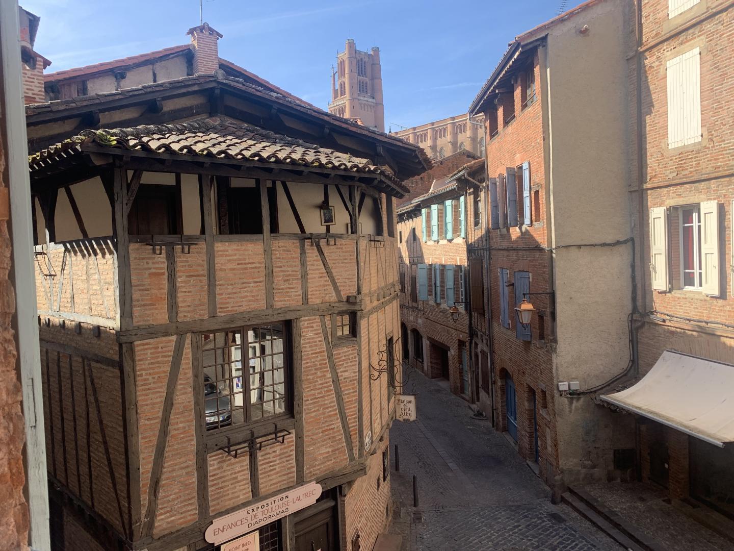 Les fenêtres offrent une vue sur la rue Puech Bérenguier et ses maisons typiques, dont la célèbre « maison du Vieil Albi », ainsi qu’une perspective sur le clocher de la cathédrale.