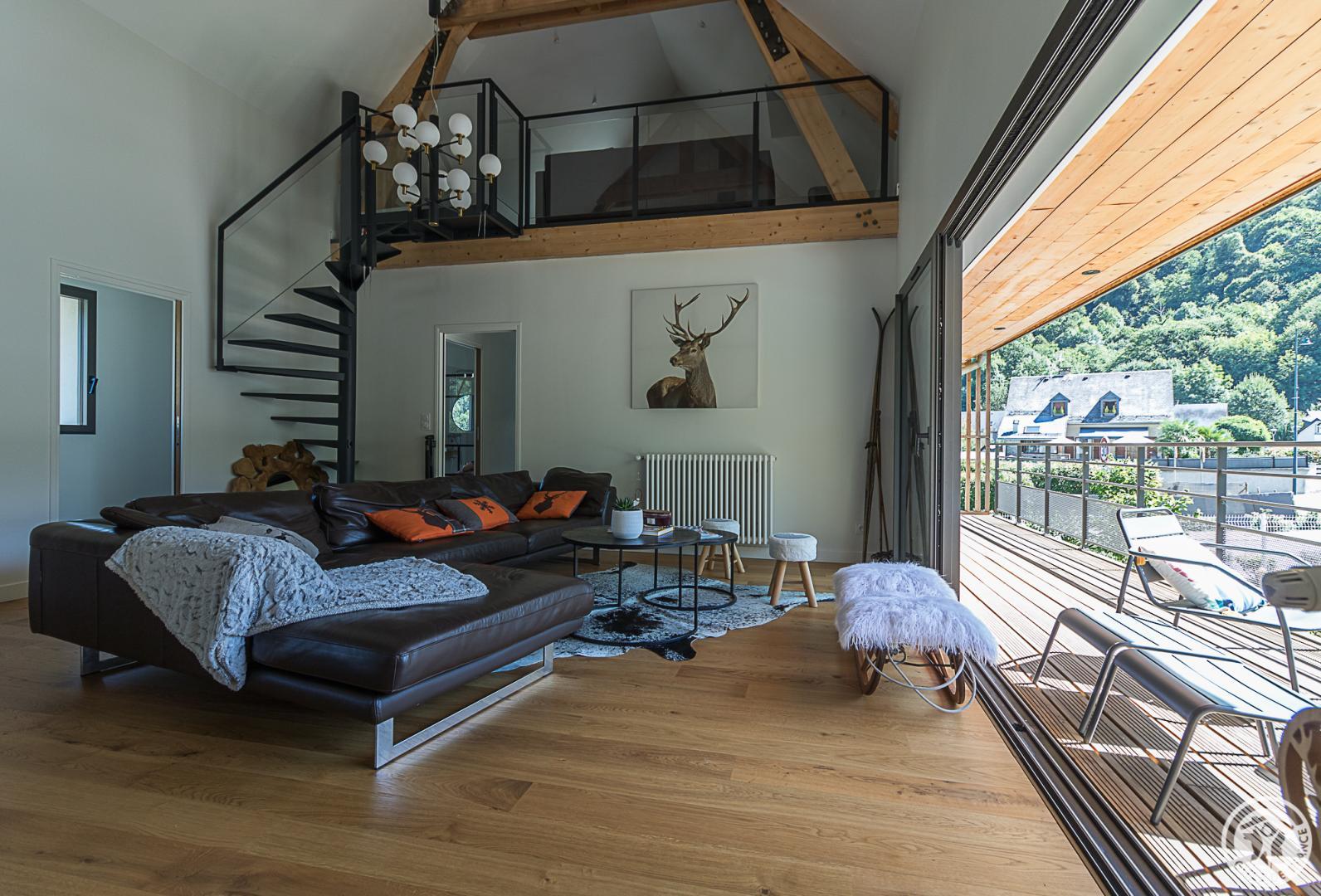 – Un escalier en colimaçon monte sur la mezzanine aménagée en salon de télévision.