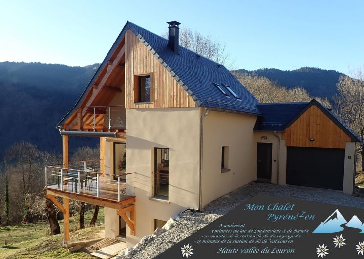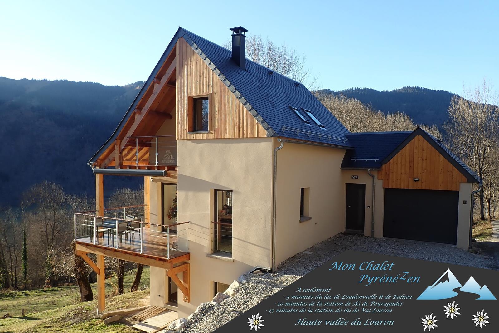 Le chalet est tout neuf (construit en 2022) et dispose d’une capacité d’accueil de 8 personnes sur 150 m² avec balcon terrasse surplombant la vallée. Situé dans le hameau de Cazaux-Fréchet, petit village Pyrénéen à flanc de vallée exposé sud-ouest, il est à 5 minutes en voiture de Loudenvielle, du lac de Génos et du centre thermo ludique Balnéa. Le logement : En Rez de Jardin : – 3 chambres disposant chacune d’un lit en 140 – Salle de bain avec baignoire à jets dorsaux – Toilettes Au Rez de Chaussée : Grande pièce à vivre très conviviale avec poêle a bois (bois inclus) – Cuisine ouverte entièrement équipée – Un balcon terrasse équipé d’un store électrique et de mobilier d’extérieur – Toilettes. A l’étage : 1 chbre avec lit en 160 x 200 et loggia privative – Espace TV salle d’eau WC .