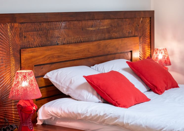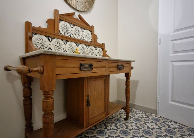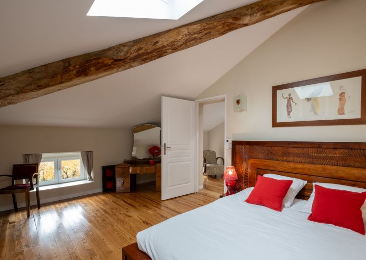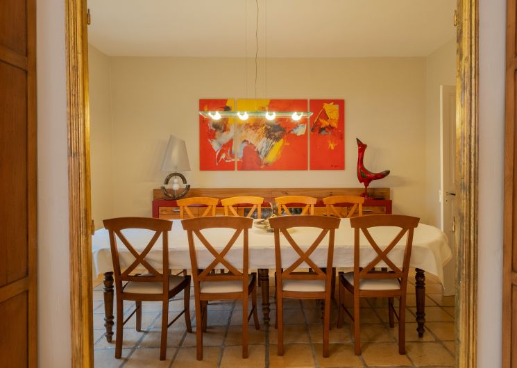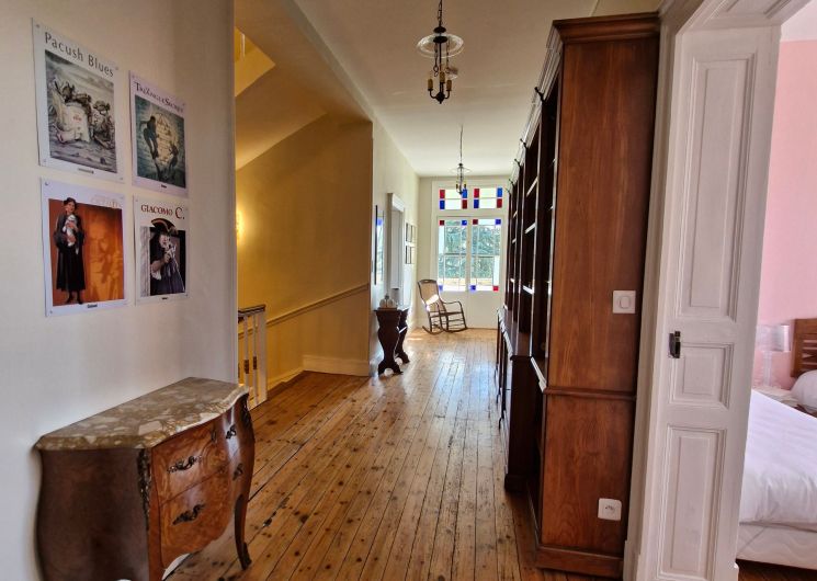 Dès l’entrée, le long couloir donne le ton : d’un rouge sublime vous découvrez le salon réservé aux hôtes, canapé, fauteuils, billard, puis la salle à manger pour la table d’hôtes et les petits déjeuners quand il n’est pas possible d’utiliser la grande terrasse attenante couverte par la glycine. Un wc public au rez-de-chaussée.
