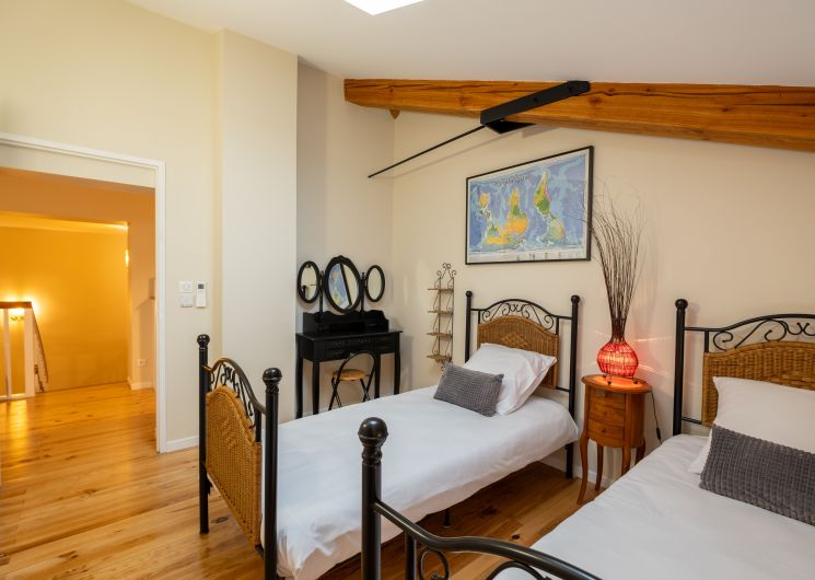 – la chambre Caroubier (1 lit 160, 1 lit 0,90, armoire, canapé fauteuils) salle d’eau privée et wc privatifs séparés.