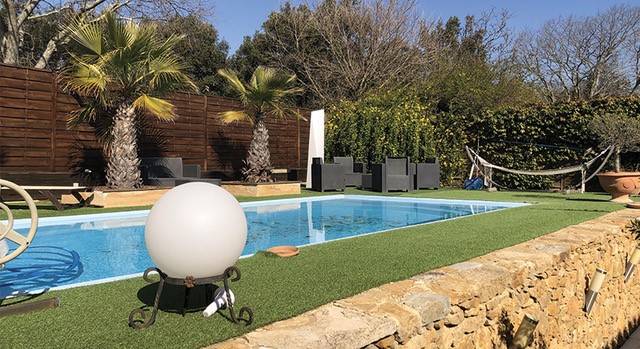 Piscine de 4 m x 8 m, utilisable en saison de 9h à 23h.