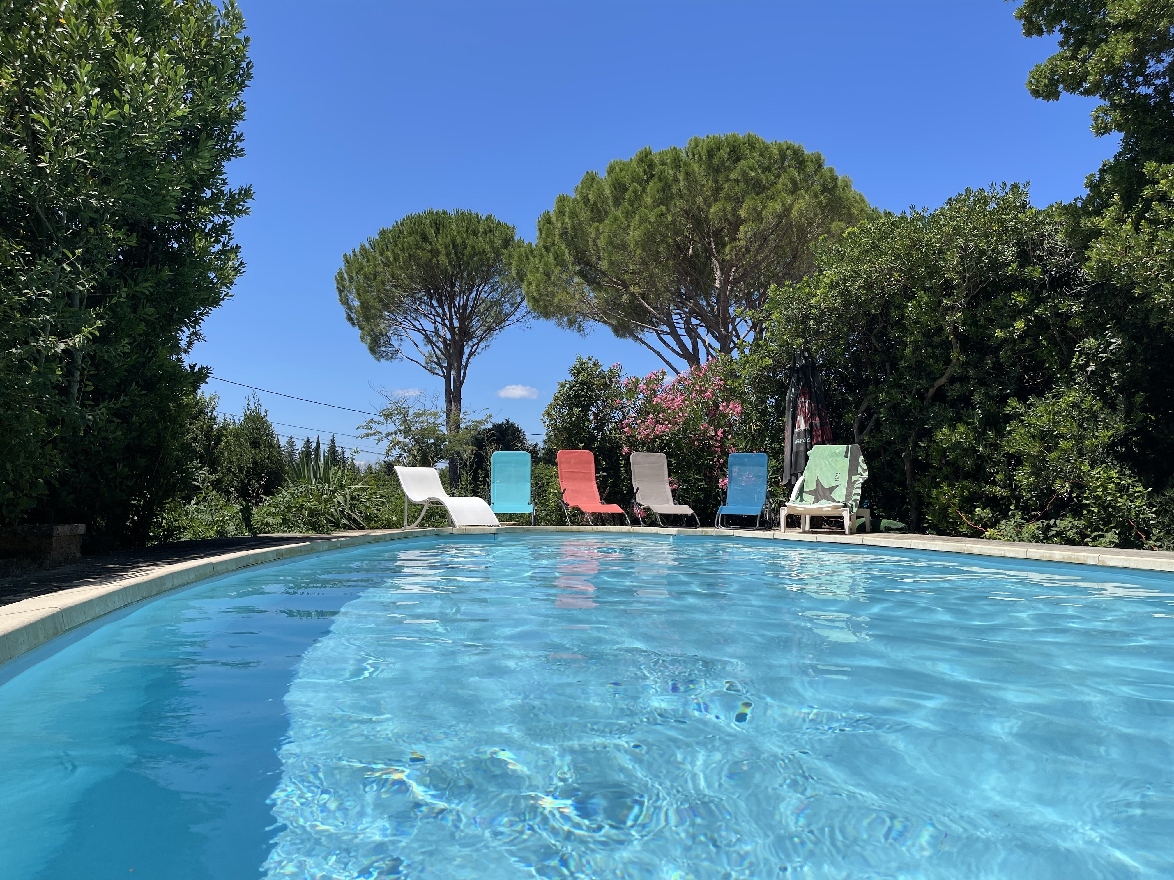 Gîte pour 6 personnes. 3 chambres, piscine, grand salon/ salle à manger cuisine équipée, grand jardin, terrasse avec plancha et table extérieure à l’ombre d’ un murier , climatisation et parking privé, quartier calme, adoucisseur d’eau. Télévision, wifi.