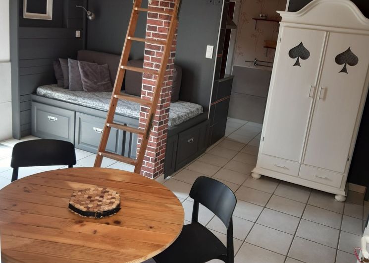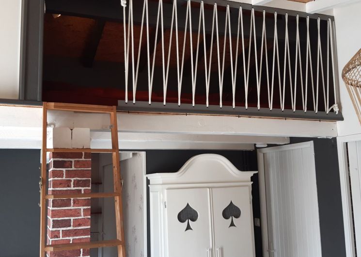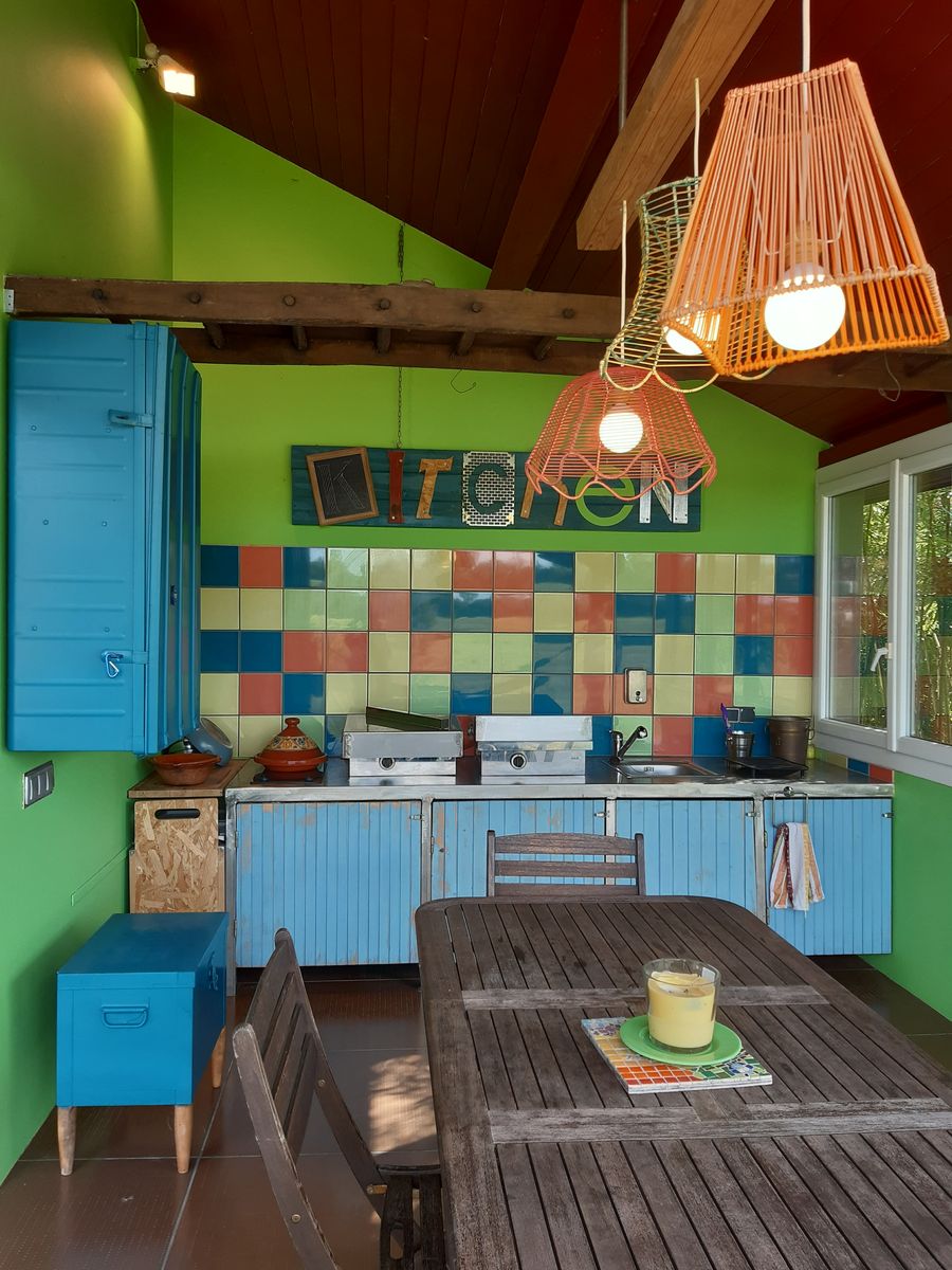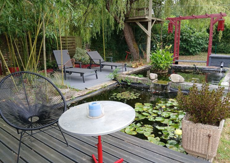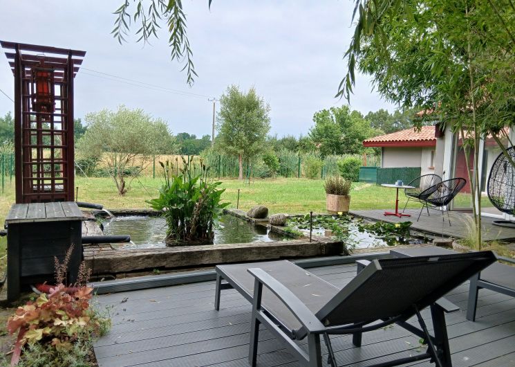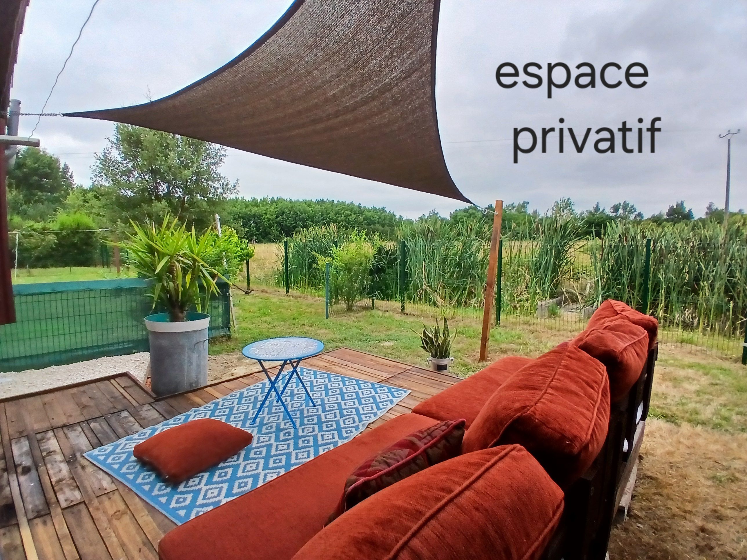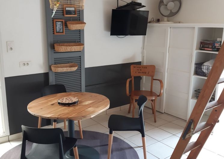 Ce logement entièrement au rez-de-chaussée se compose d’une pièce à vivre (canapé1 lit 0,90), TV, accès à une mezzanine par échelle, 1 espace cuisine (éléments intégrés LL, Four combiné MO), 1 chambre (1 lit 2 pers en 140), 1 wc indépendant. Accès à un espace extérieur avec cuisine d ‘été, plancha, bassin à poissons, salon de jardin, terrain pelouse. Un espace privatif exterieur (terrasse, toiles d’ombrage, canapé).