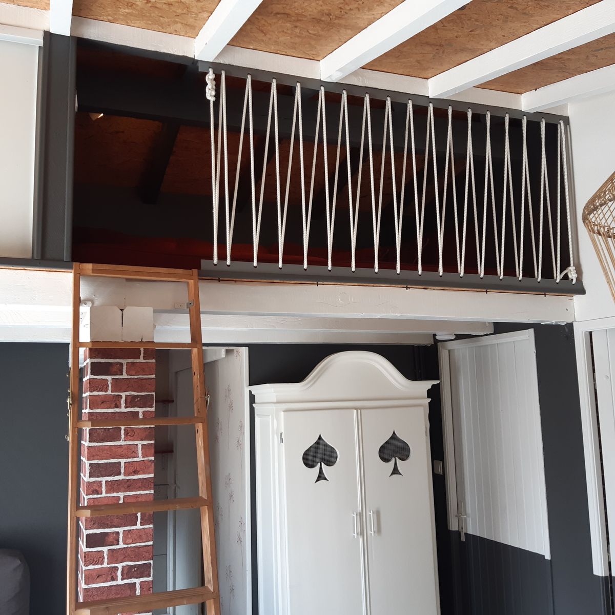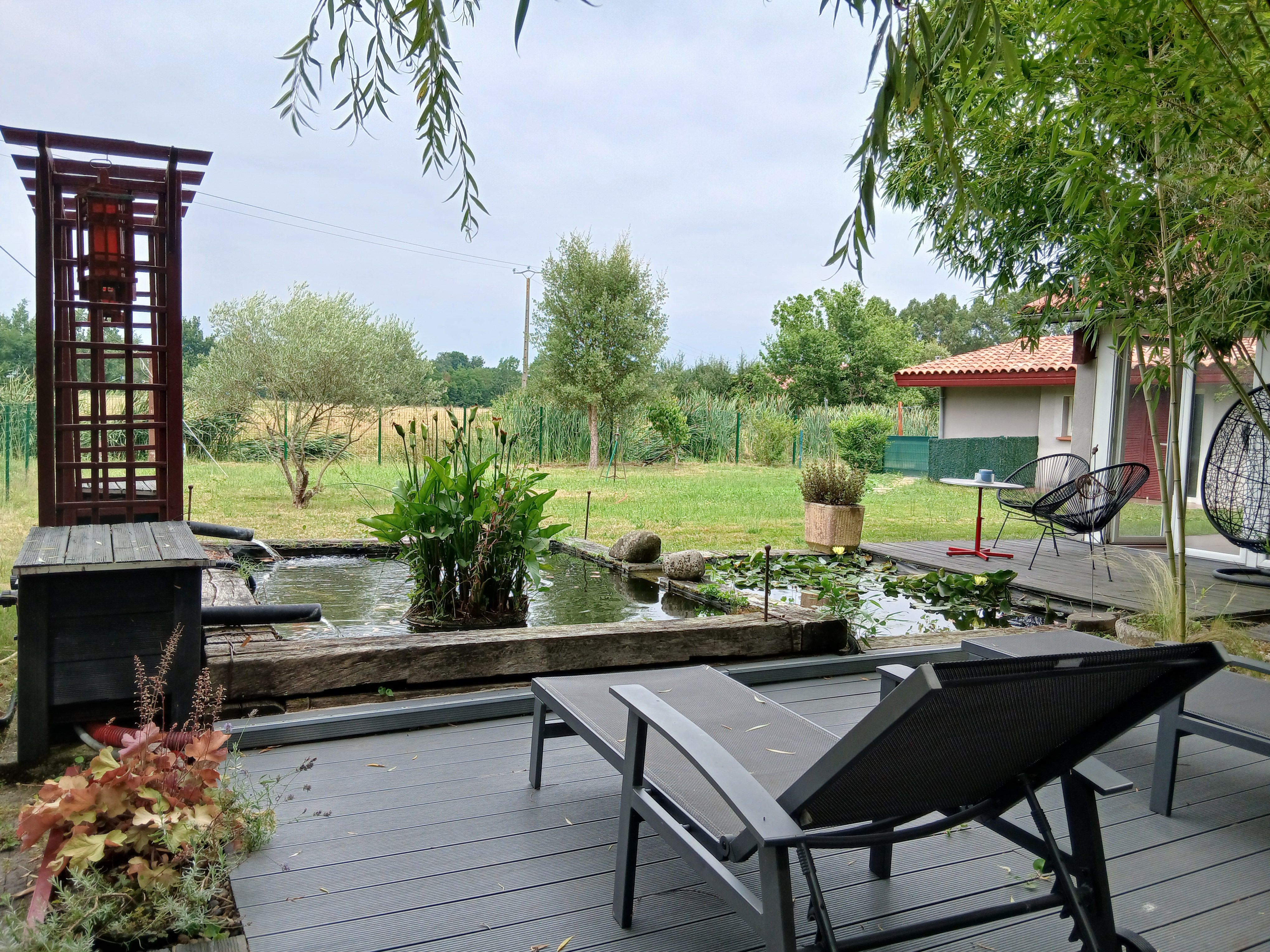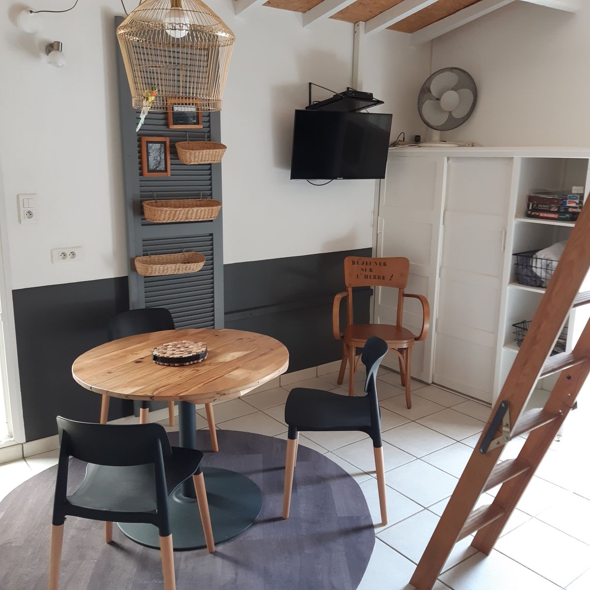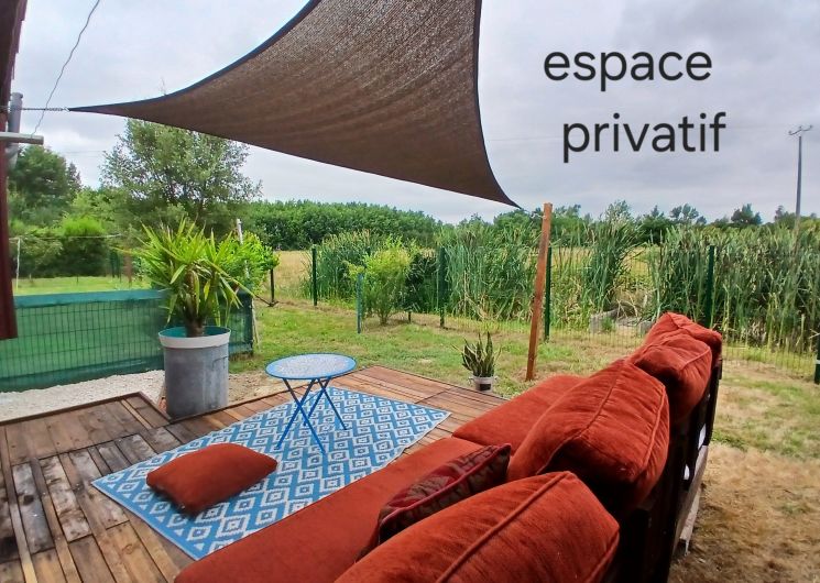 Ce logement entièrement au rez-de-chaussée se compose d’une pièce à vivre (canapé1 lit 0,90), TV, accès à une mezzanine par échelle, 1 espace cuisine (éléments intégrés LL, Four combiné MO), 1 chambre (1 lit 2 pers en 140), 1 wc indépendant. Accès à un espace extérieur avec cuisine d ‘été, plancha, bassin à poissons, salon de jardin, terrain pelouse. Un espace privatif exterieur (terrasse, toiles d’ombrage, canapé).