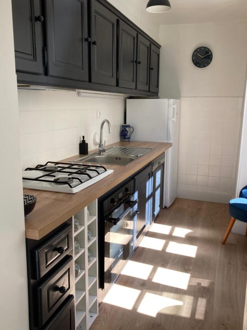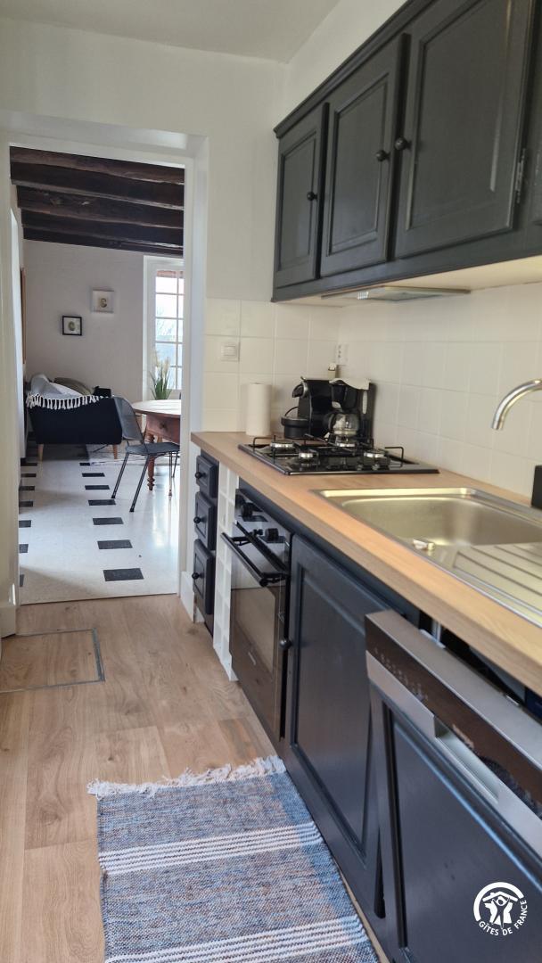 – cuisine en enfilade, équipée : lave-vaisselle, four, plaque cuisson gaz, micro-ondes, réfrigérateur avec freezer, cafetière filtre et à dosettes Nespresso, bouilloire, grille-pain.