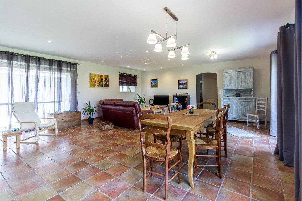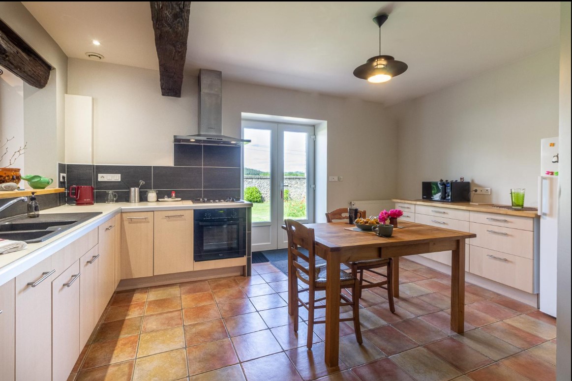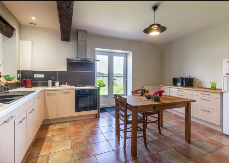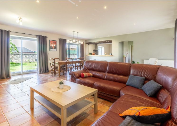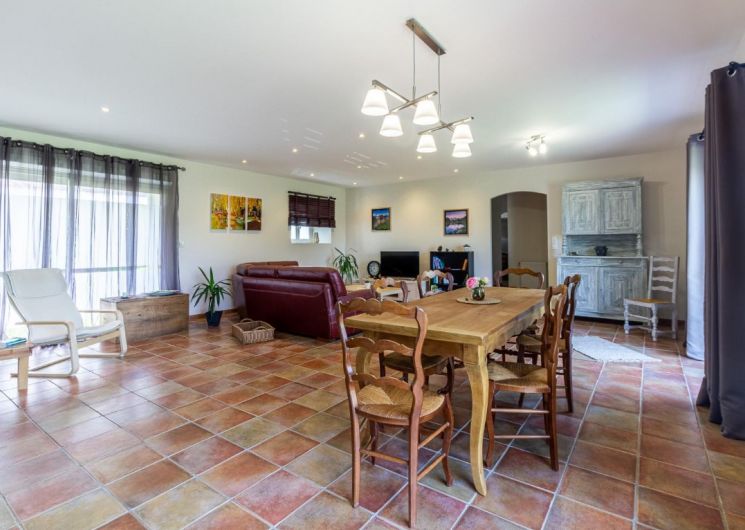 De plain-pied: cuisine ouverte sur un séjour de 50m² avec salle à manger/coin salon, cellier, salle d’eau, wc indépendants, 2 chambres (2 lits en 140), chambre (2 lits en 90 superposés). jardin avec partie gravillonnée d’environ 450m², gîte mitoyen aux dépendances de la maison des propriétaires sans vis à vis extérieur, parking privatif. Chauffage au gaz inclus, draps fournis, lits faits. .