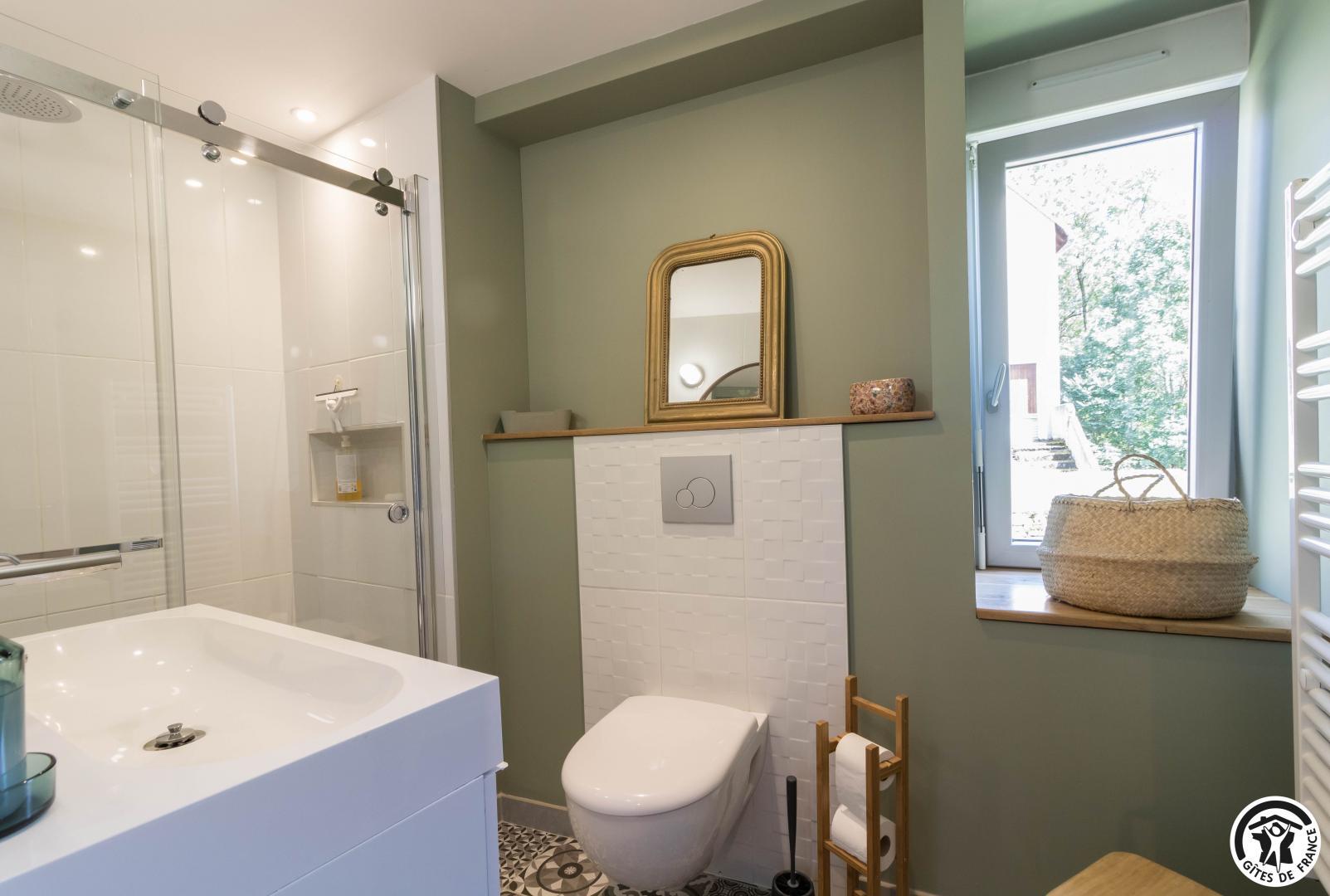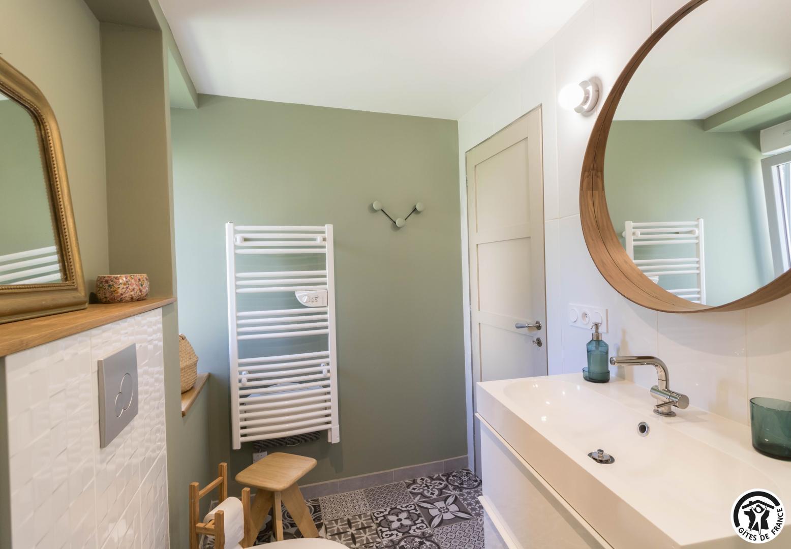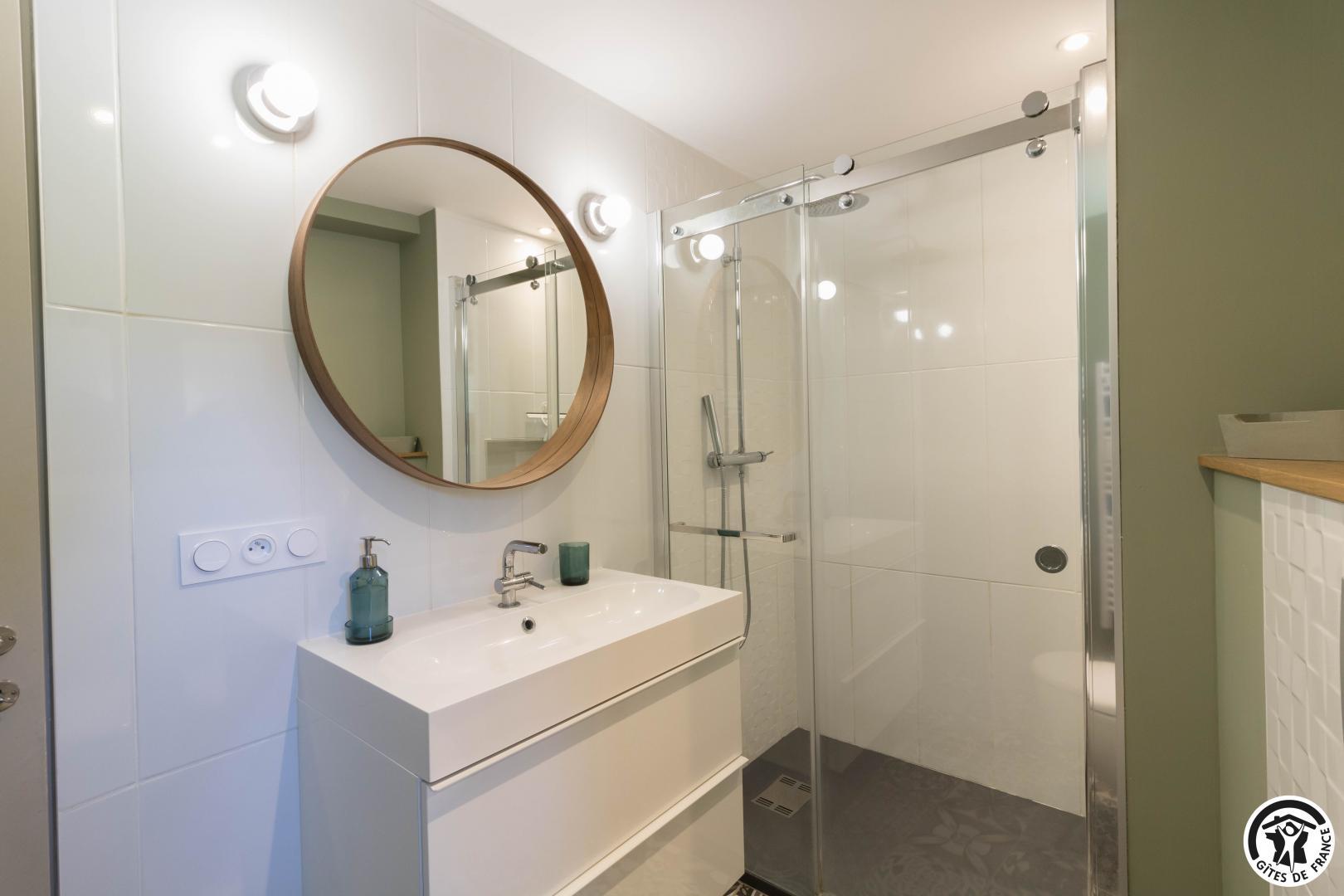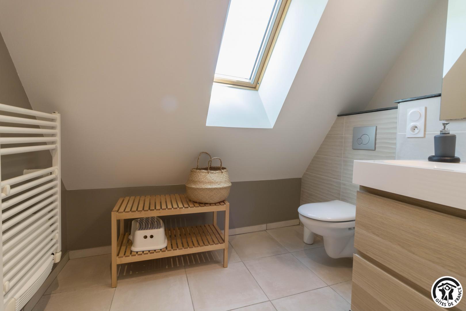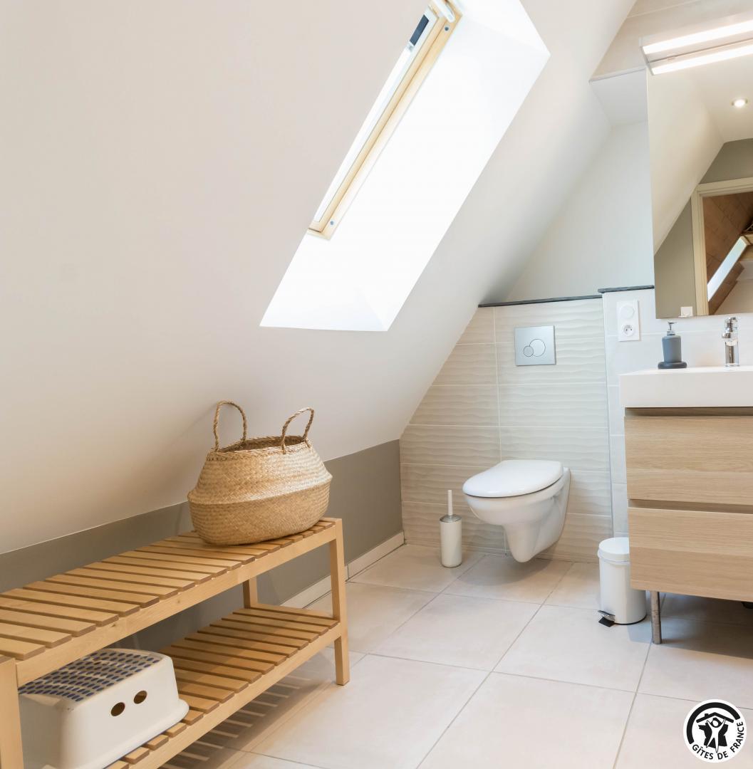 – au premier étage : 3 chambres, chacune avec 1 lit pour 2 personnes en 140*190cm, salle d’eau avec douche à l’italienne, vasque et WC.