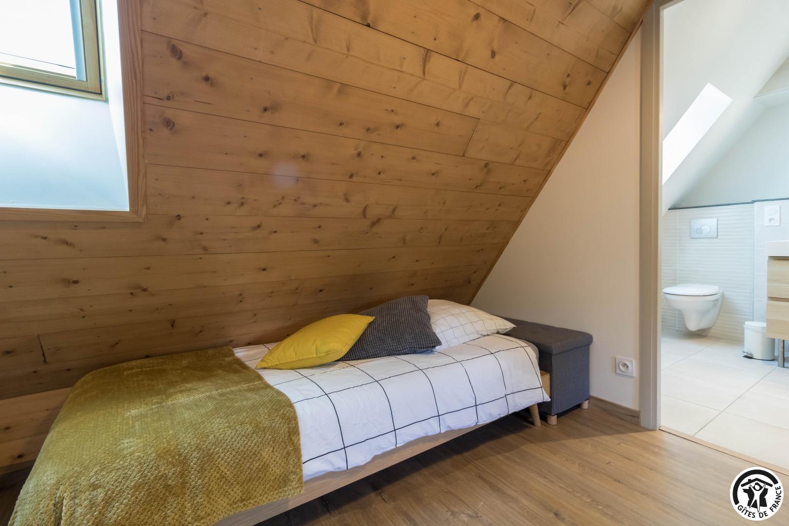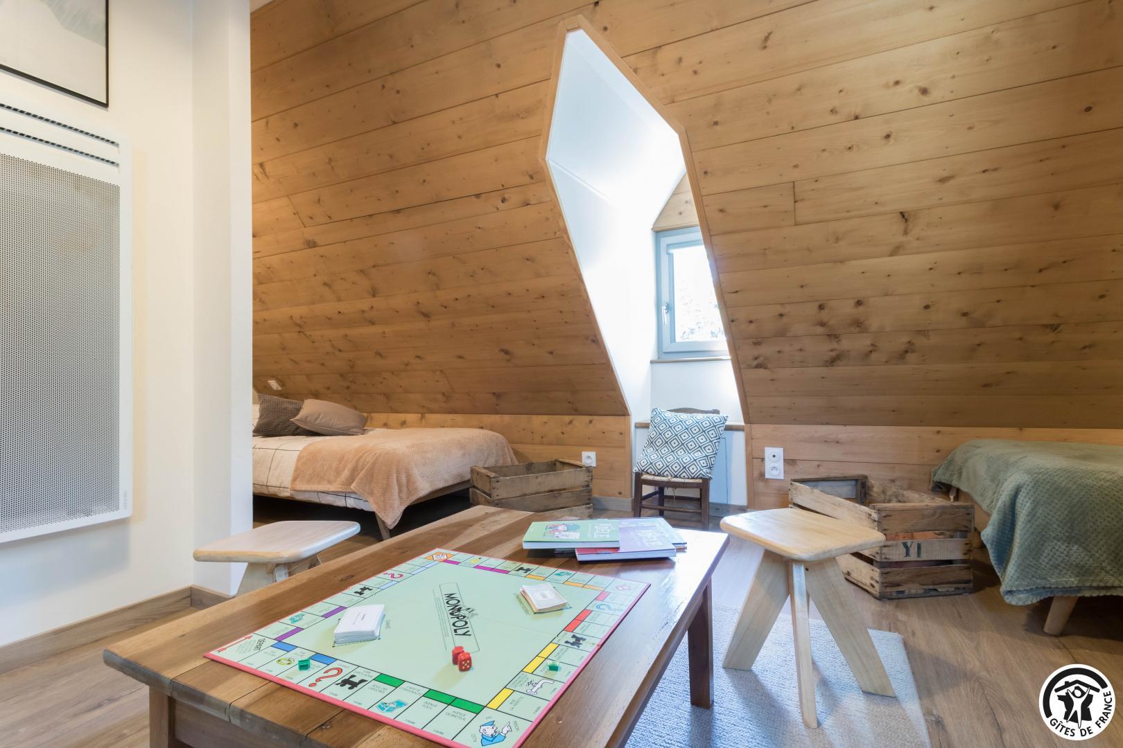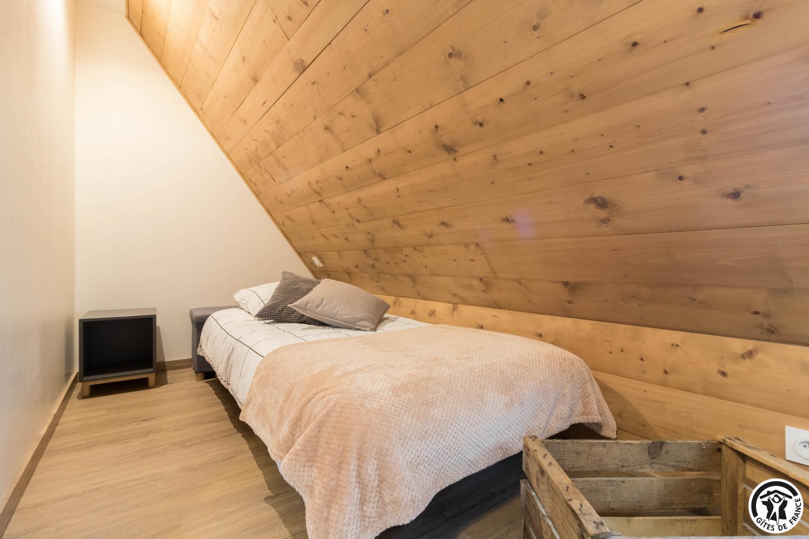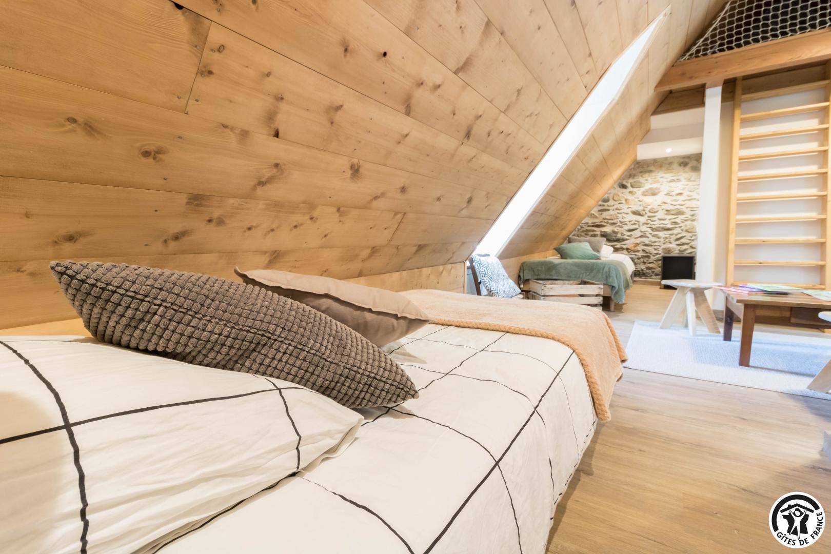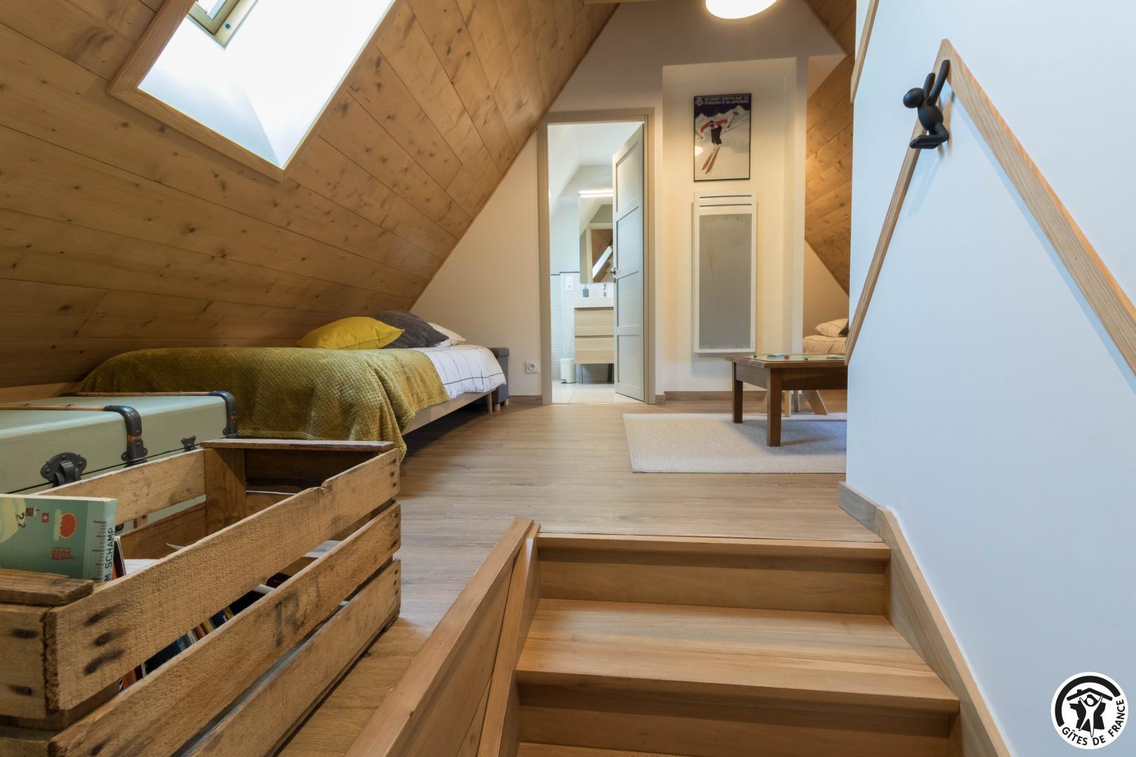 – au deuxième étage (accès depuis la rue pour décharger vos affaires) : dortoir pour enfants avec 3 lits pour 1 personne en 90*190cm. Mezzanine avec 1 lit supplémentaire pour 2 personnes en 140*190cm.