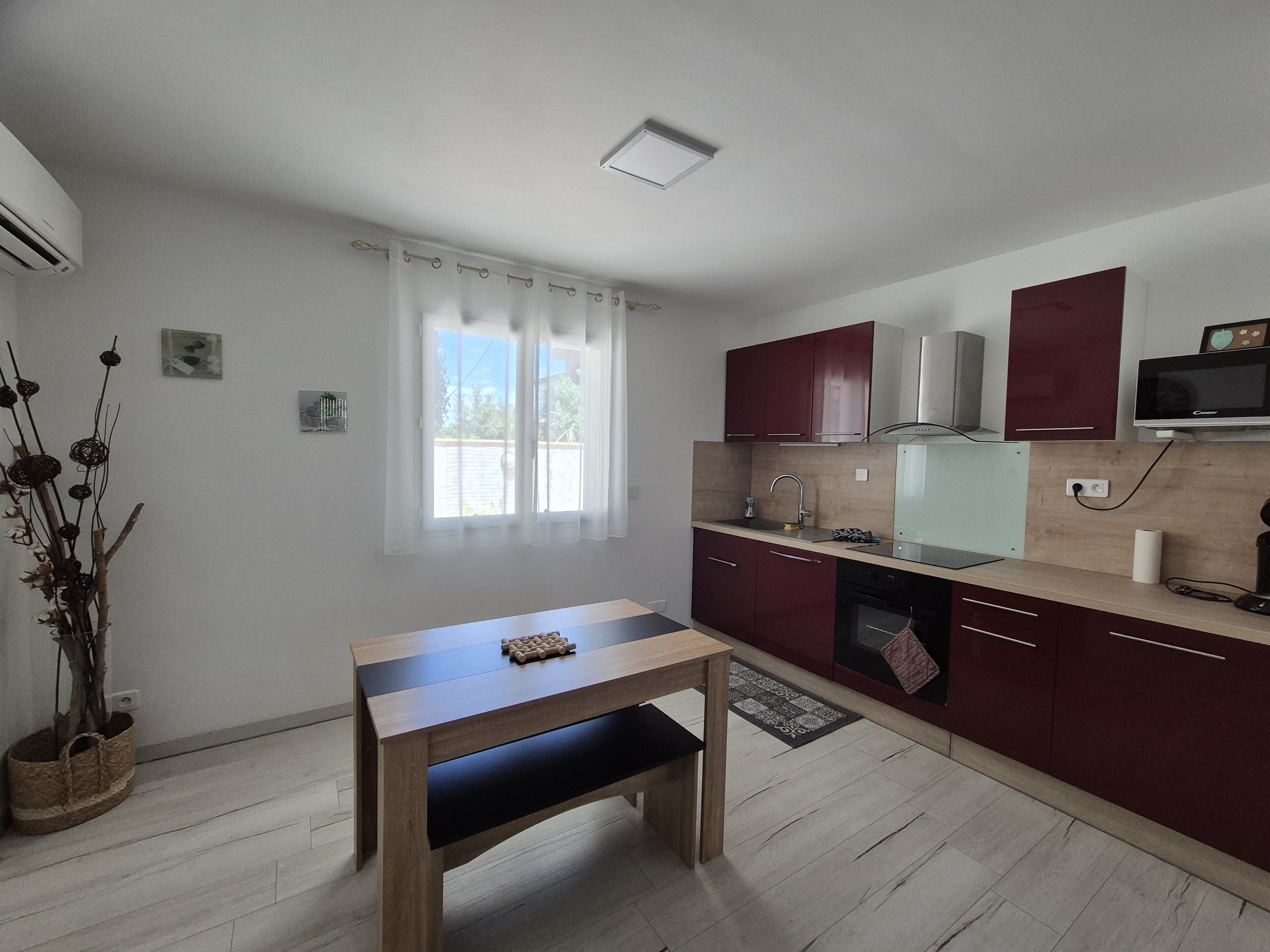 A 10 mn à pied du centre ville, appartement totalement climatisé, de plain pied d’environ 50 m², agrémenté d’une terrasse et d’un parking privatif et fermé. L’appartement comprend : un salon Une cuisine Une chambre avec un lit en 160×200 Une salle d’eau WC indépendant Plaque de cuisson, lave vaisselle, four, micro-ondes, réfrigérateur, congélateur, téléviseur, lave linge, étendoir..