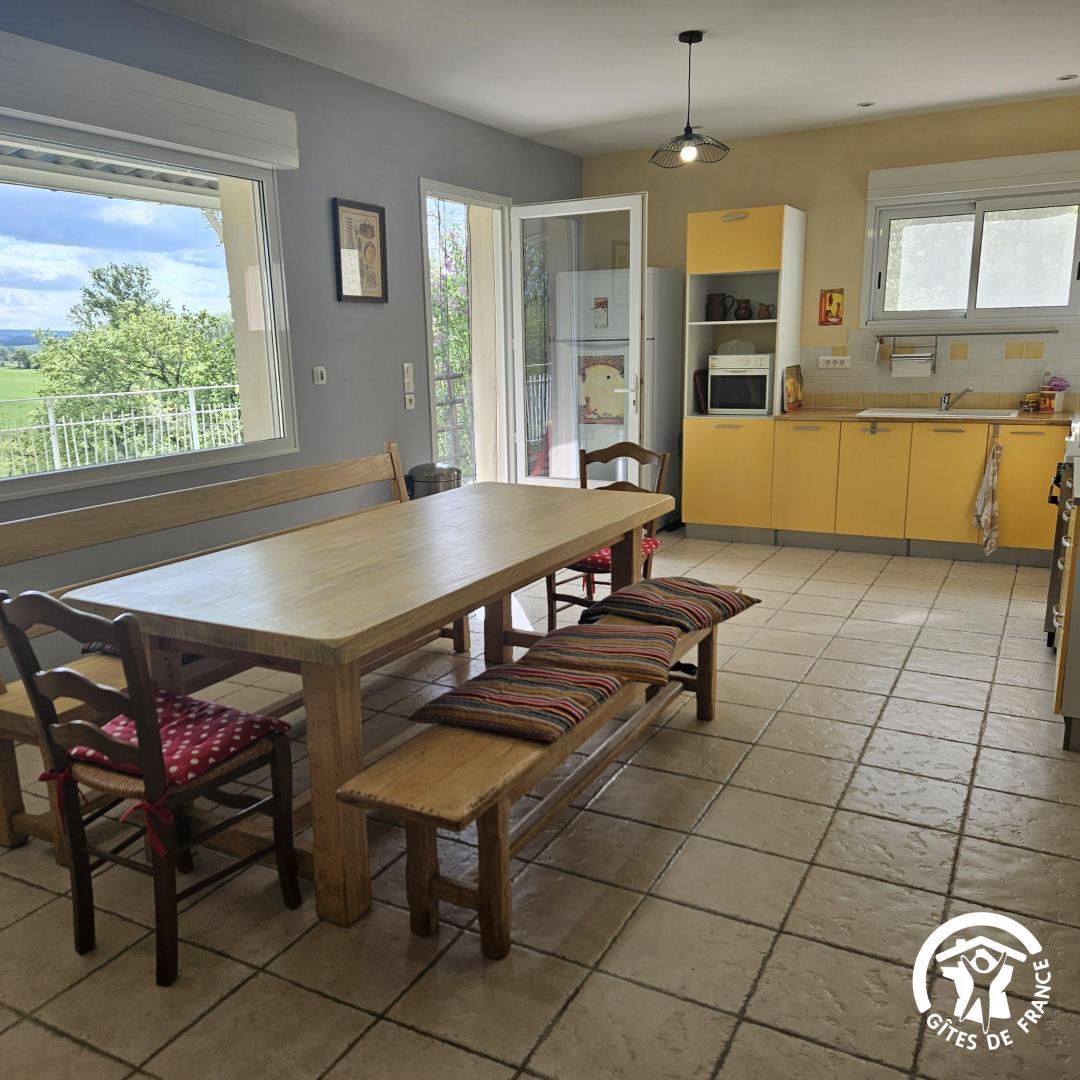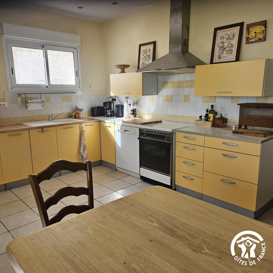 * cuisine toute équipée, très lumineuse grâce à la grande fenêtre avec vue sur le lac et les champs. Equipement cuisine : four électrique, 4 feux gaz, réfrigérateur, congélateur, micro-ondes…