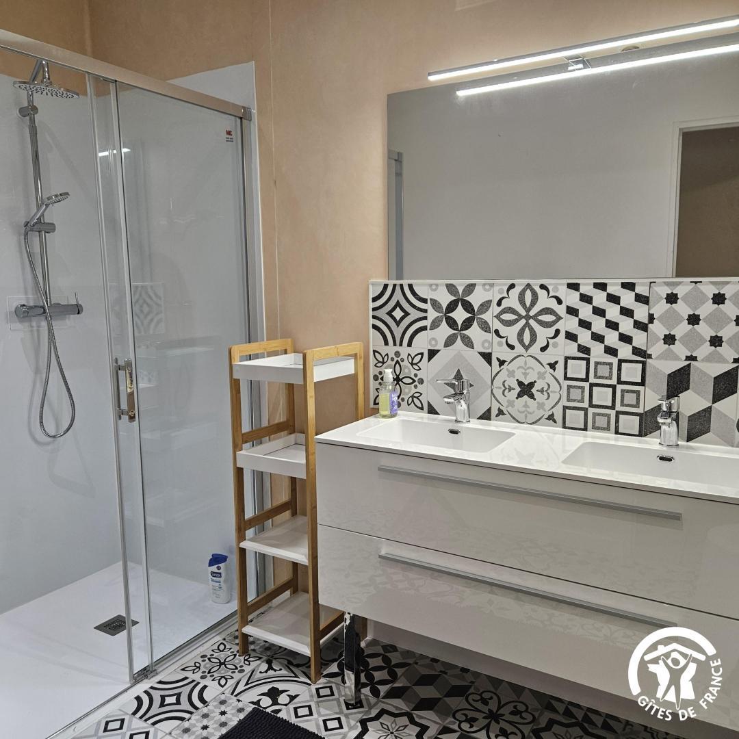 * grande salle d’eau avec douche, double vasque, lave-linge