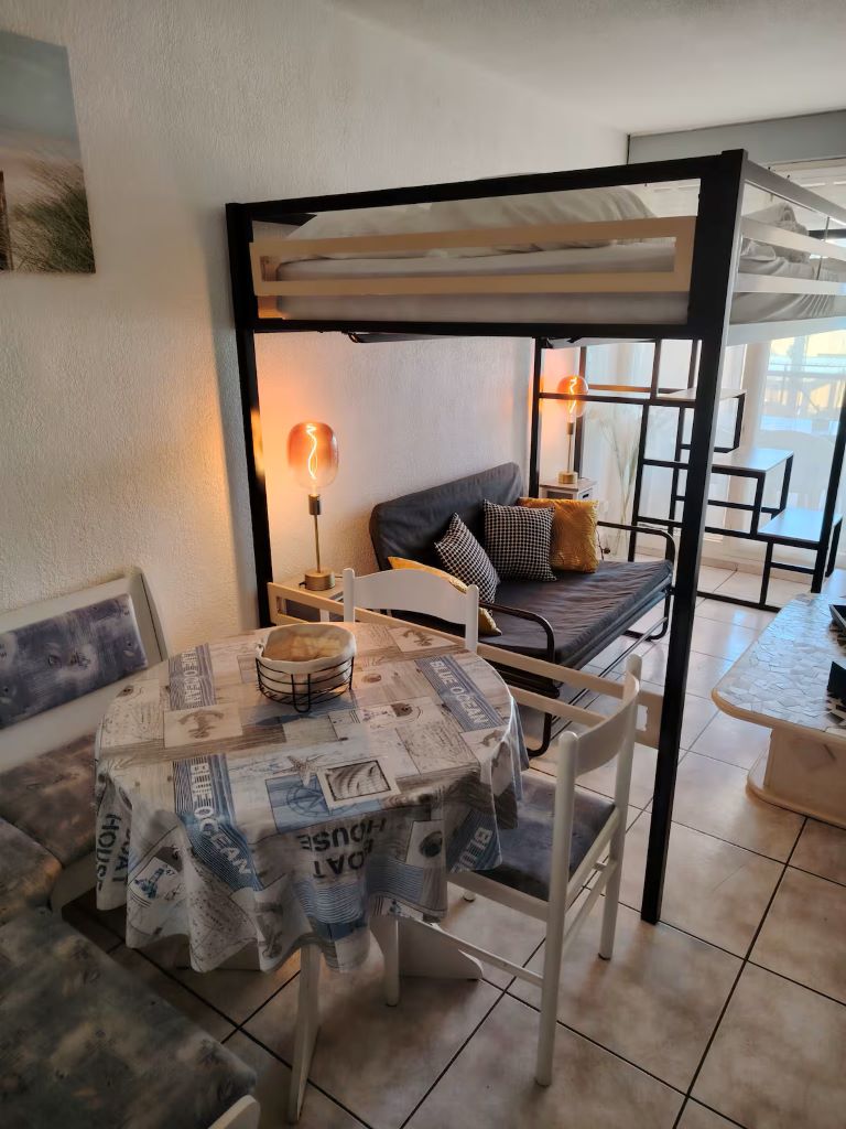 Charmant appartement T2 de 30 m², idéalement situé, avec accès direct à la plage sans aucune route à traverser et à proximité immédiate des commerces. Il se compose d’une agréable pièce de vie avec cuisine ouverte entièrement équipée (lave-linge, four micro-ondes, plaque à induction, grand réfrigérateur-congélateur), télévision et canapé-lit d’appoint, mezzanine avec un lit double, ainsi qu’un coin repas avec banc et rangements. L’appartement dispose également d’une loggia ouverte de 8 m² aménagée avec un salon de jardin. La chambre comprend un lit double, un lit simple en mezzanine. Climatisation dans la chambre et la pièce principale. Place de stationnement privative incluse.