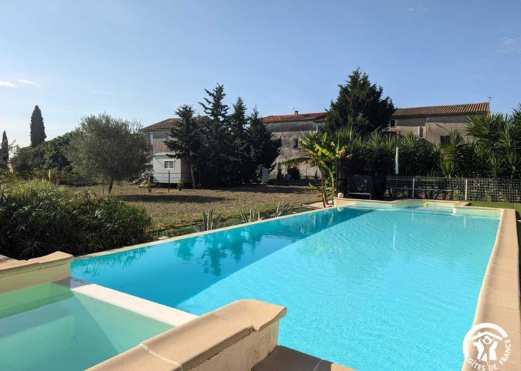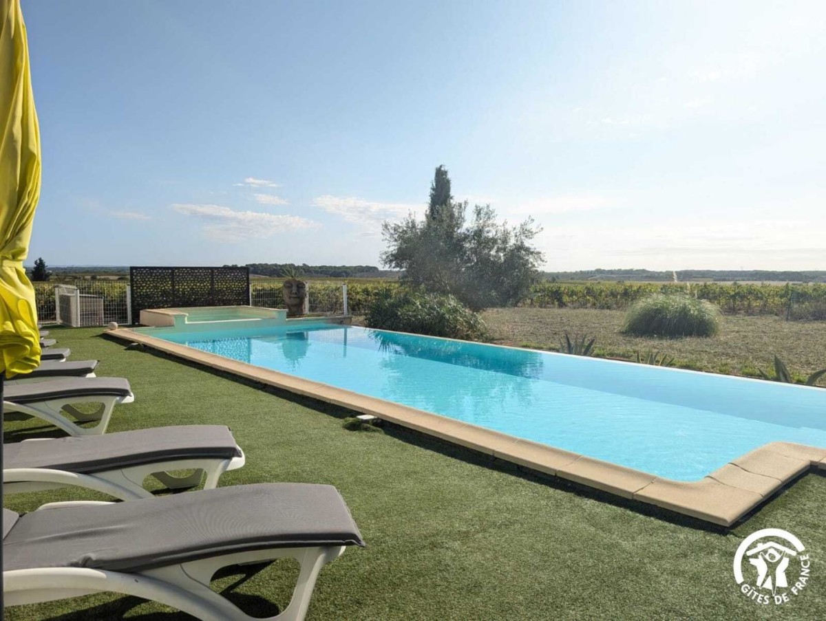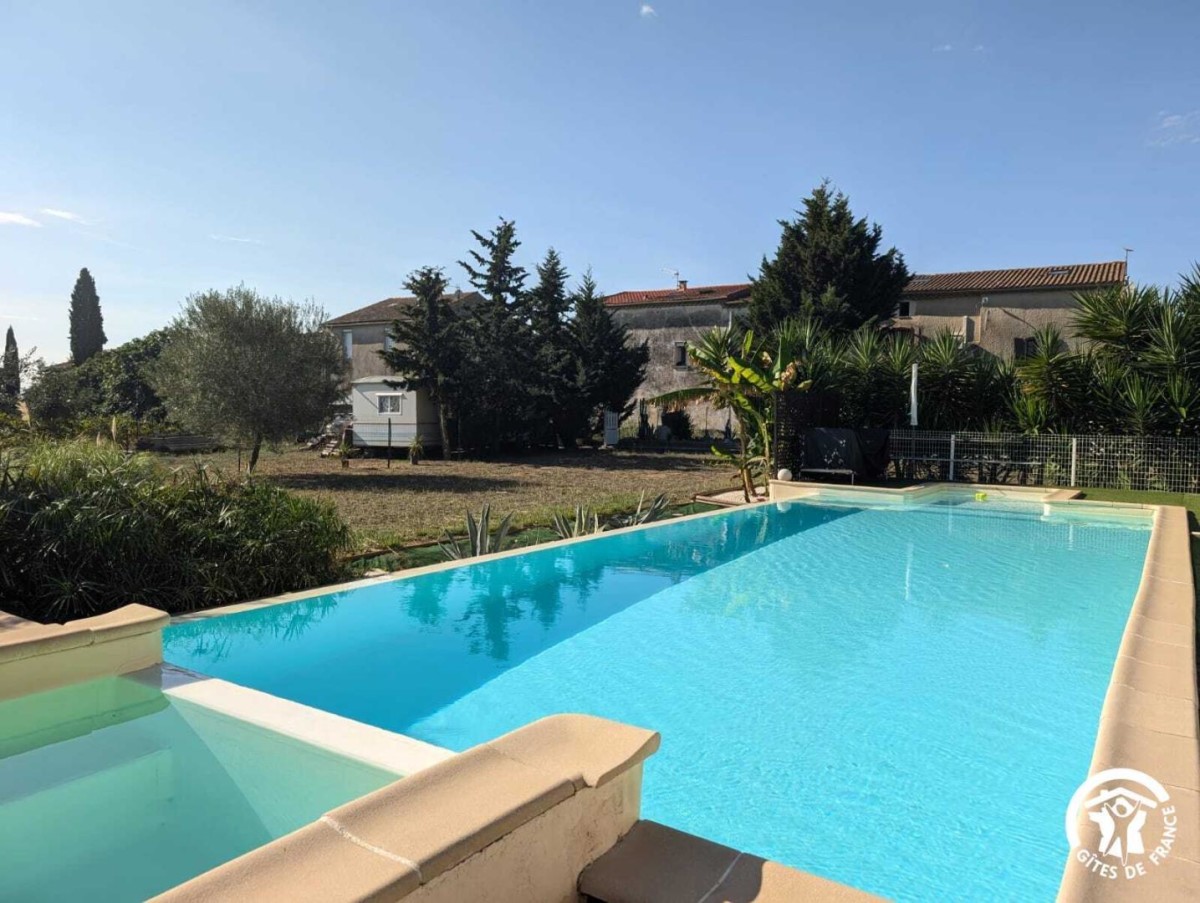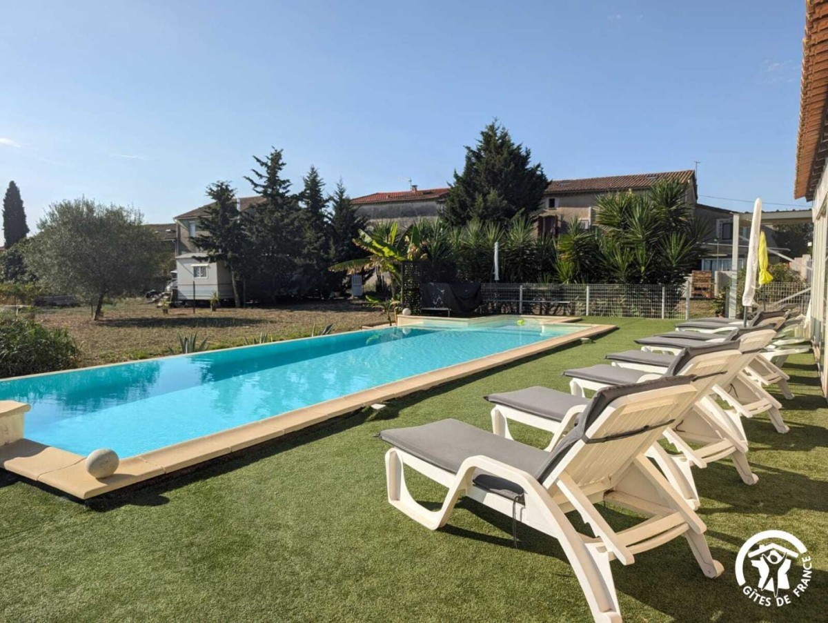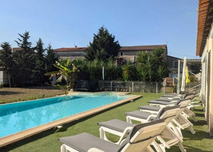 Venez profitez d’un séjour au calme en famille ou entre amis. Le gîte est situé entre Béziers et Pézenas, la ville de Molière à ne pas manquer. Les plages Méditerranéennes sont à une vingtaine de kilomètres (Vias, Agde, Marseillan). Vous pourrez déguster les vins locaux ou encore les coquillages de l’Etang de Thau. Le gîte est une maison de 250 m2 située à l’écart du village. Il se compose comme suit : Au rez-de-chaussée : – Une entrée, avec toilette et buanderie (lave-linge, nécessaire de ménage) – Un cuisine tout équipée avec salle à manger, une cheminée – Un salon avec un grand canapé confortable et une grande télévision – Une véranda disposant d’un billard, d’une grande table ronde et d’un petit comptoir A l’étage : – Un espace bureau / bibliothèque – Une chambre avec un lit en 180*200, et un équipement sportif – Une chambre avec un lit en 160*200, et une coiffeuse – Une chambre avec un lit en 200*200, une salle d’eau privative avec WC, une cheminée – Une chambre avec un lit rond 2m*2m, une salle d’eau privative avec WC – Une grande salle de bain avec douche et baignoire et deux vasques – Un wc séparé Au 2ème étage : – Une chambre dortoir mansardée avec 2 lits en 140*200, 2 lits en 90*190, un lit en 120*190. Possibilité de réserver pour 14 personnes sur demande en contactant le service réservation. Extérieur : – Un grand jardin de 1500m2 – Un barbecue(bois mis à disposition) et plancha gaz – Une table d’apéro – Une grande table bien ombragée sous une treille de vigne – Une piscine (11X4, profondeur 20cm à 1m60) ouverte d’avril à octobre, avec transat et coin détente – Boulodrome (15×5.5) – Table de ping pong – Jeux d’extérieur disponibles (molky, badminton, croquet, etc.) Stationnement privé dans l’allée. Climatisation à l’étage dans les chambres