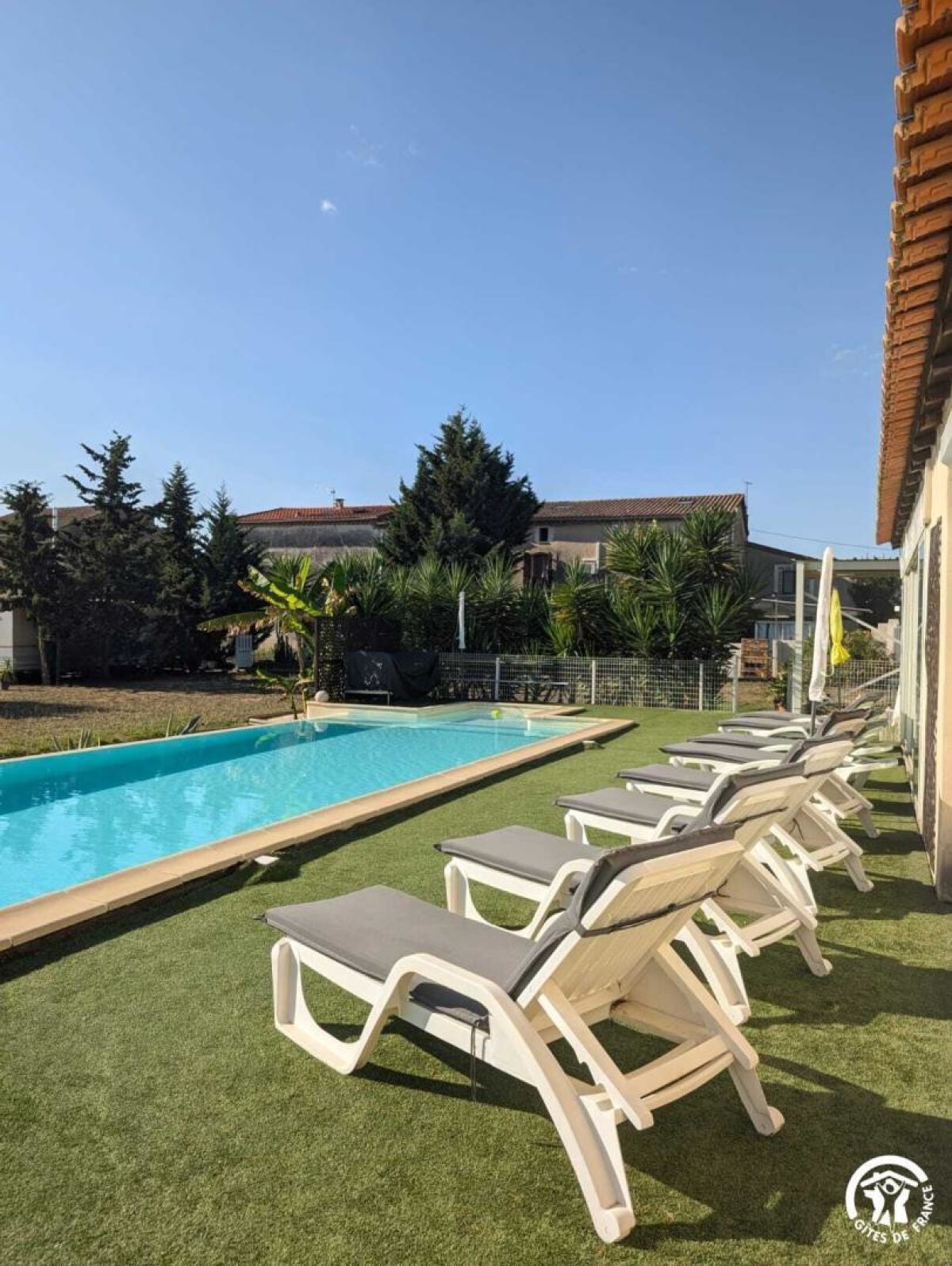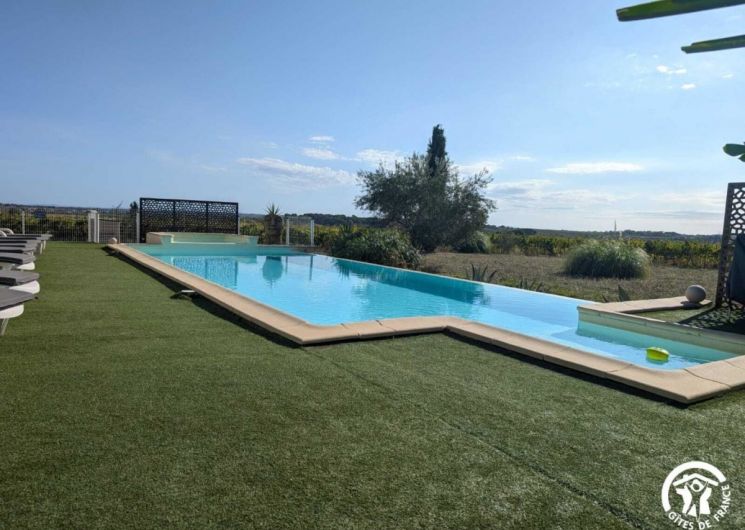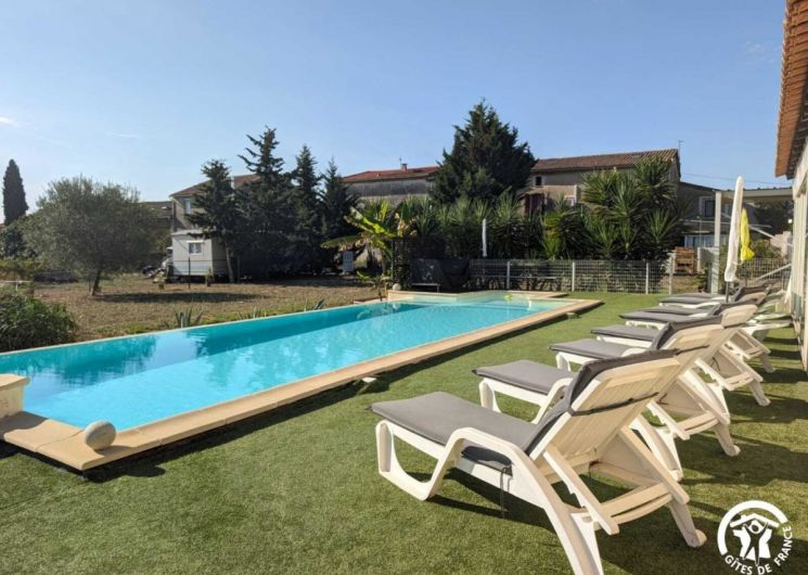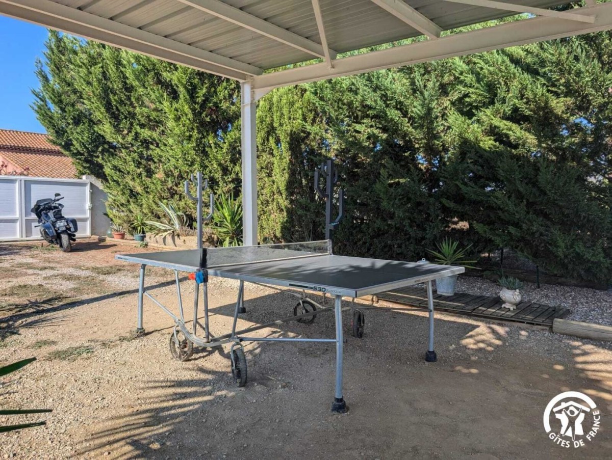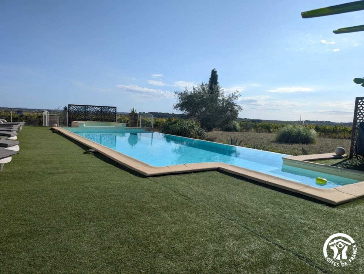Venez profitez d’un séjour au calme en famille ou entre amis. Le gîte est situé entre Béziers et Pézenas, la ville de Molière à ne pas manquer. Les plages Méditerranéennes sont à une vingtaine de kilomètres (Vias, Agde, Marseillan). Vous pourrez déguster les vins locaux ou encore les coquillages de l’Etang de Thau. Le gîte est une maison de 250 m2 située à l’écart du village. Il se compose comme suit : Au rez-de-chaussée : – Une entrée, avec toilette et buanderie (lave-linge, nécessaire de ménage) – Un cuisine tout équipée avec salle à manger, une cheminée – Un salon avec un grand canapé confortable et une grande télévision – Une véranda disposant d’un billard, d’une grande table ronde et d’un petit comptoir A l’étage : – Un espace bureau / bibliothèque – Une chambre avec un lit en 180*200, et un équipement sportif – Une chambre avec un lit en 160*200, et une coiffeuse – Une chambre avec un lit en 200*200, une salle d’eau privative avec WC, une cheminée – Une chambre avec un lit rond 2m*2m, une salle d’eau privative avec WC – Une grande salle de bain avec douche et baignoire et deux vasques – Un wc séparé Au 2ème étage : – Une chambre dortoir mansardée avec 2 lits en 140*200, 2 lits en 90*190, un lit en 120*190. Possibilité de réserver pour 14 personnes sur demande en contactant le service réservation. Extérieur : – Un grand jardin de 1500m2 – Un barbecue(bois mis à disposition) et plancha gaz – Une table d’apéro – Une grande table bien ombragée sous une treille de vigne – Une piscine (11X4, profondeur 20cm à 1m60) ouverte d’avril à octobre, avec transat et coin détente – Boulodrome (15×5.5) – Table de ping pong – Jeux d’extérieur disponibles (molky, badminton, croquet, etc.) Stationnement privé dans l’allée. Climatisation à l’étage dans les chambres