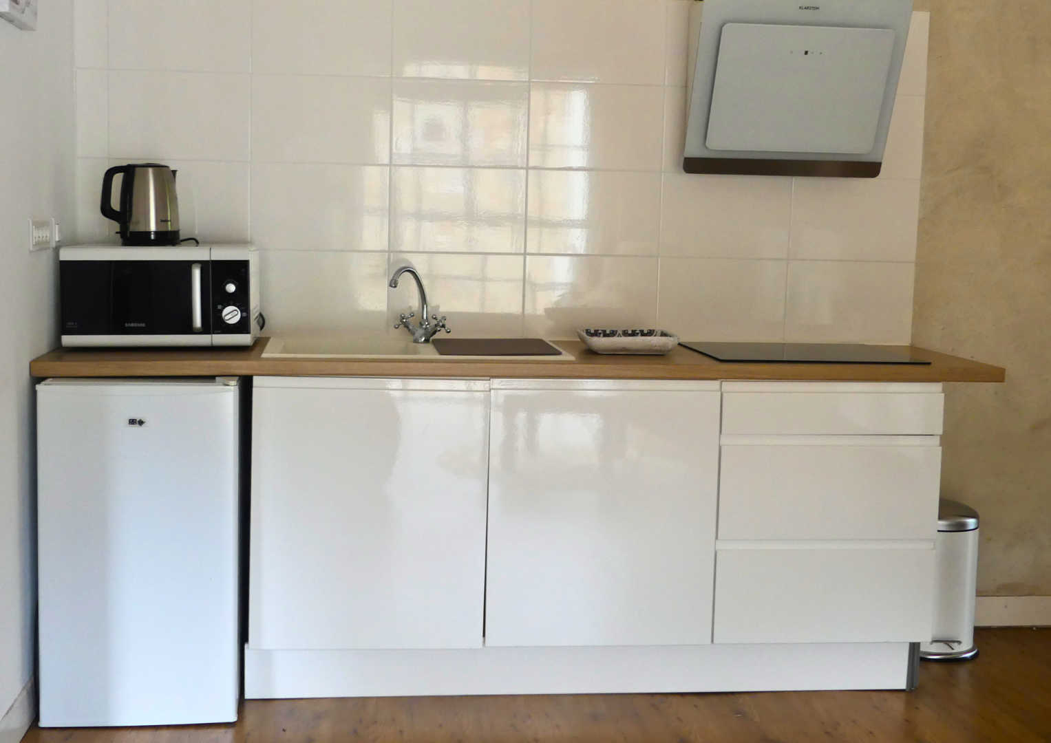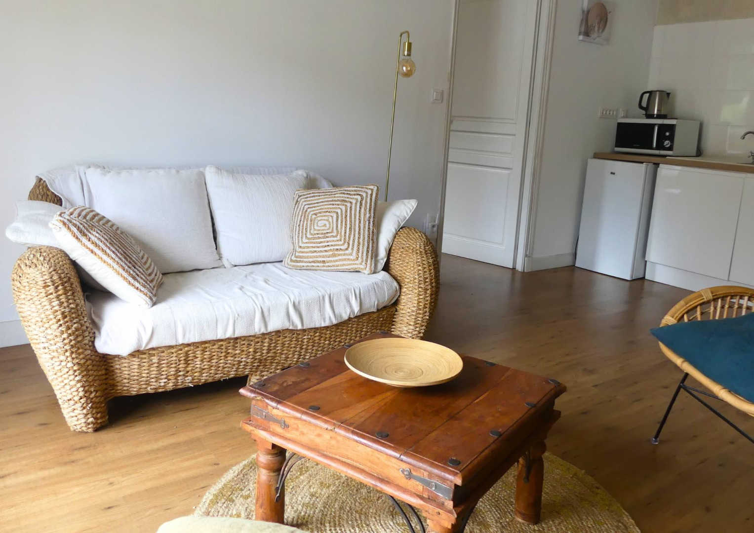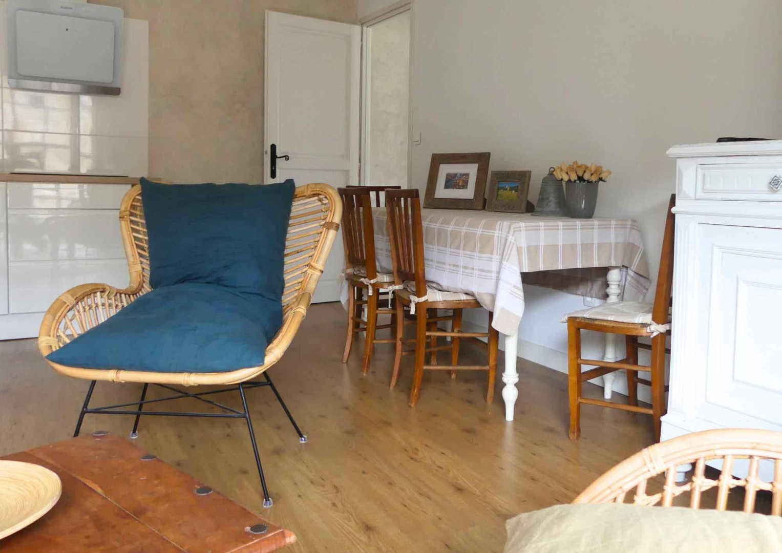 Séjour avec cuisine ouverte toute équipée (réfrigérateur, micro-ondes, cafetière, plaques à induction, hotte, barbecue électrique), table, canapé deux places, deux fauteuils, vaisselier, table basse.