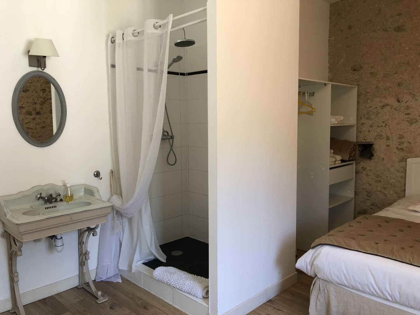 Première chambre, deux lits 90×200 jumelables en un lit 180×200, salle d’eau privative (douche, vasque).