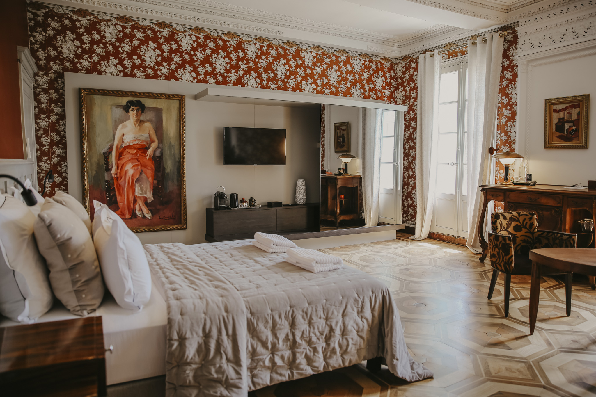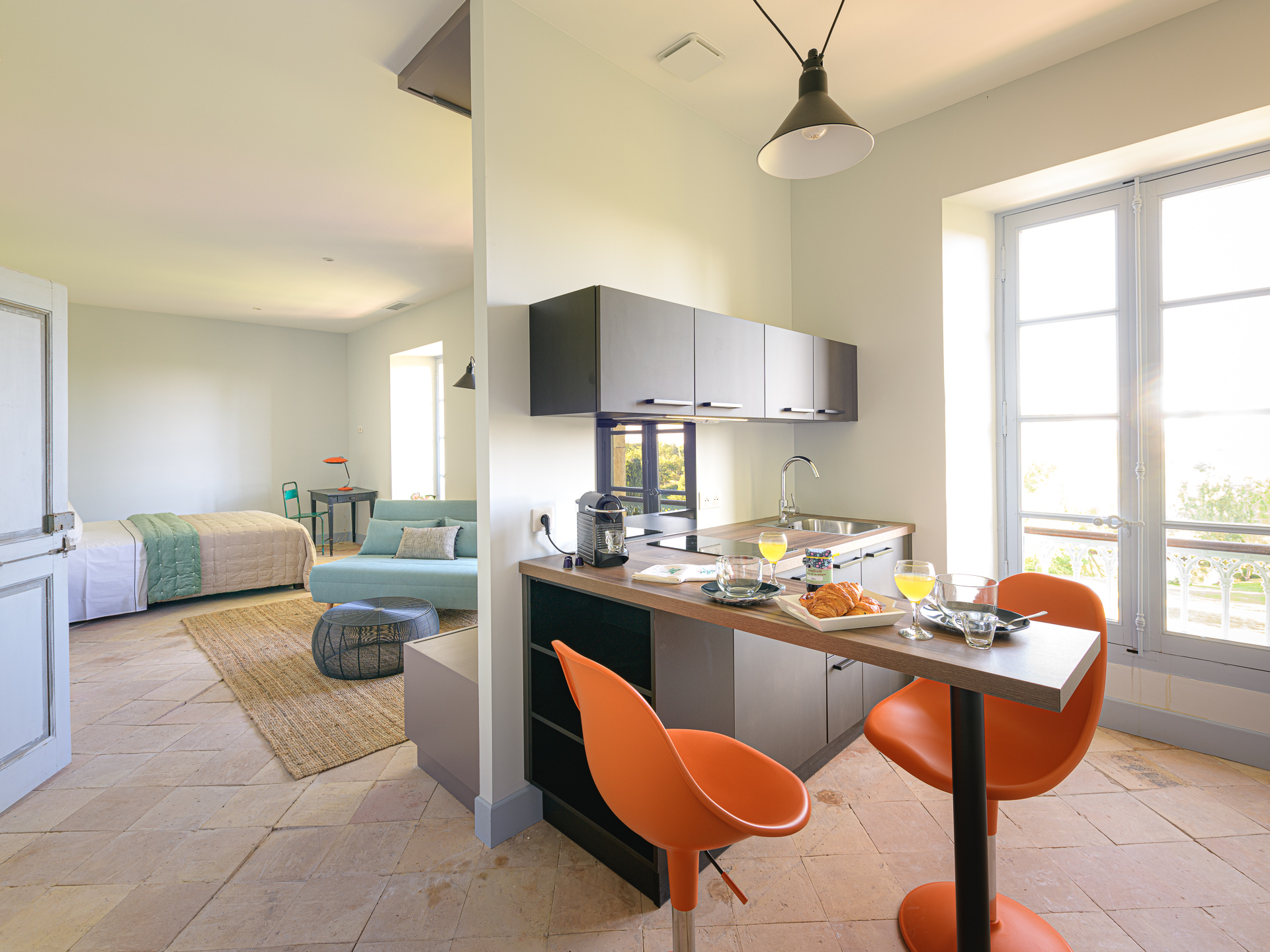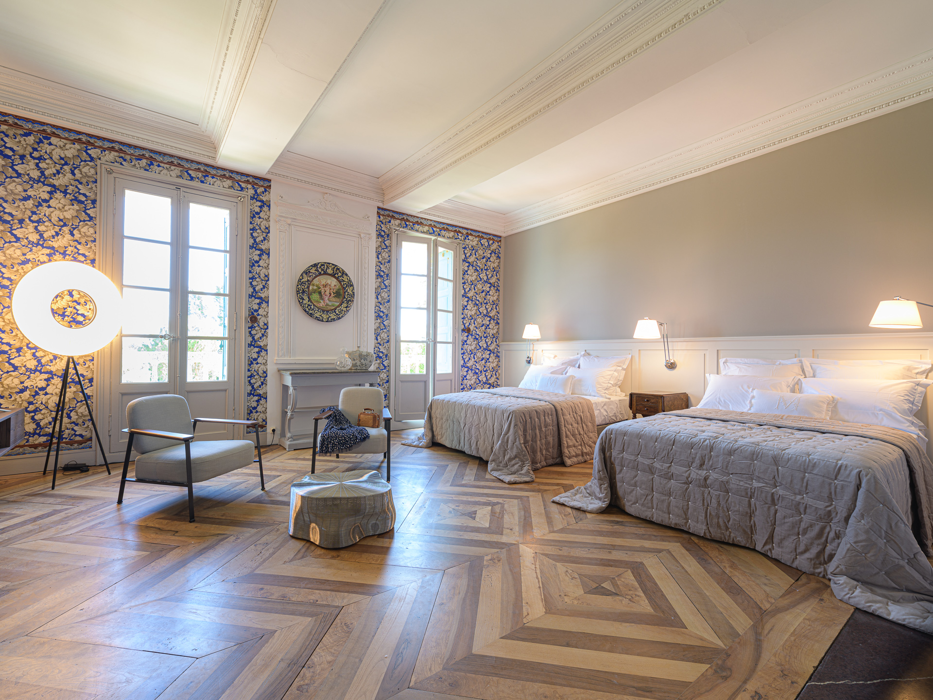 La Suite Bleue, tapissée au pastel et ses balcons donnant sur le parc, la Suite Palmyre, à l’esprit art déco ou la Suite Sarah, au parfum d’antan. Dans la suite Italienne ou celle de la Tour, la cheminée de briquettes monumentale, les murs de pierre et les tomettes d’origine qui gardent l’empreinte du passé, vous ramènent au temps des chandeliers dans un confort très actuel. Vous souhaitez vous retrouver entre amis ou en famille ? Deux appartements sont proposés, l’un agrémenté d’une pièce à vivre au plafond cathédrale qui bénéficie d’une vue imprenable sur le parc, comprenant deux chambres doubles avec salle d’eau et une chambre double d’appoint. Le deuxième appartement comprend une vaste suite avec salle de bain, coin salon, kitchenette et une chambre double.