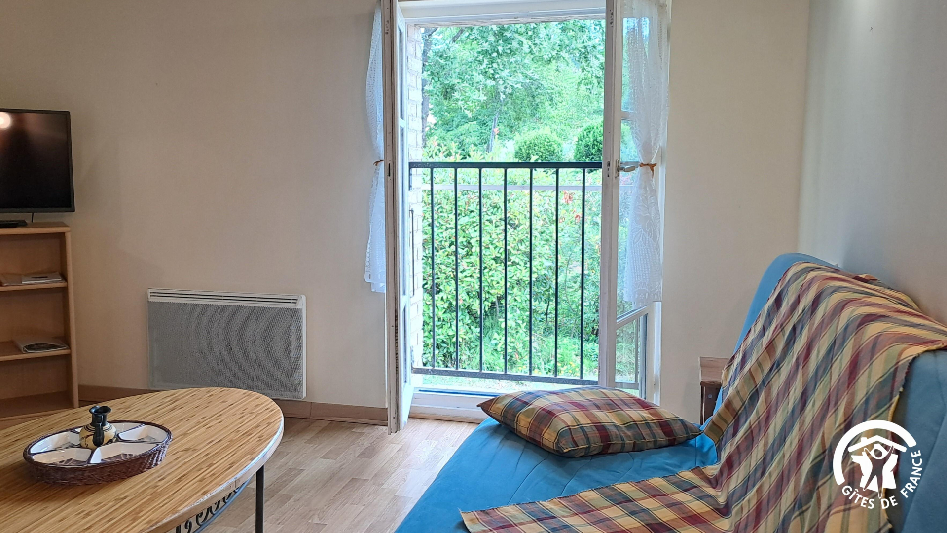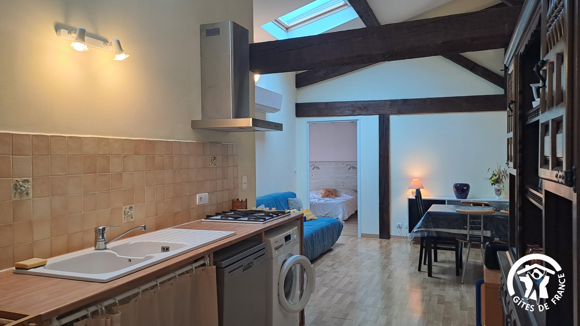 – Pièce à vivre avec coin cuisine, ouverte sur la salle à manger et salon avec TV. Une salle d’eau avec wc est accessible depuis le salon. Cuisine avec lave-vaisselle, mini-four, cafetière à filtre, grille-pain, bouilloire, réfrigérateur et lave-linge.