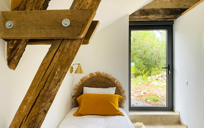 Gîte de 50 M2 avec poêle à bois. Le bâtiment entièrement rénové est très bien isolé et sa configuration permet de se passer de climatisation. Cuisine équipée de deux plaques à induction, d’un frigo et d’un four mixte. Gîte adapté pour les personnes à mobilité réduite. Grande table de ferme. Coin salon. Une chambre avec un lit double (160 x 200). Deux lits simples dans un espace ouvert (90 x 200). Salle de bain avec douche et toilettes. Lit et chaise bébé sur demande. Un canapé convertible. Espace extérieur privatif avec salon de jardin.