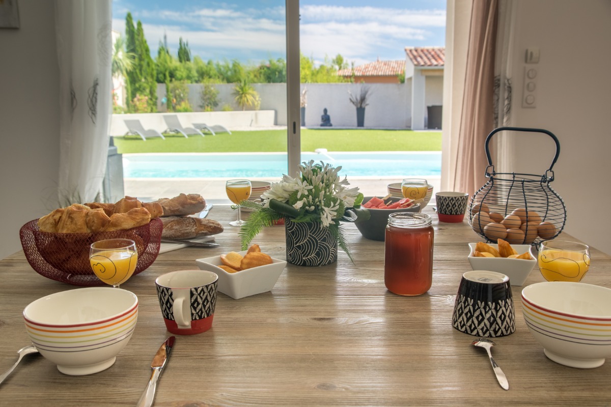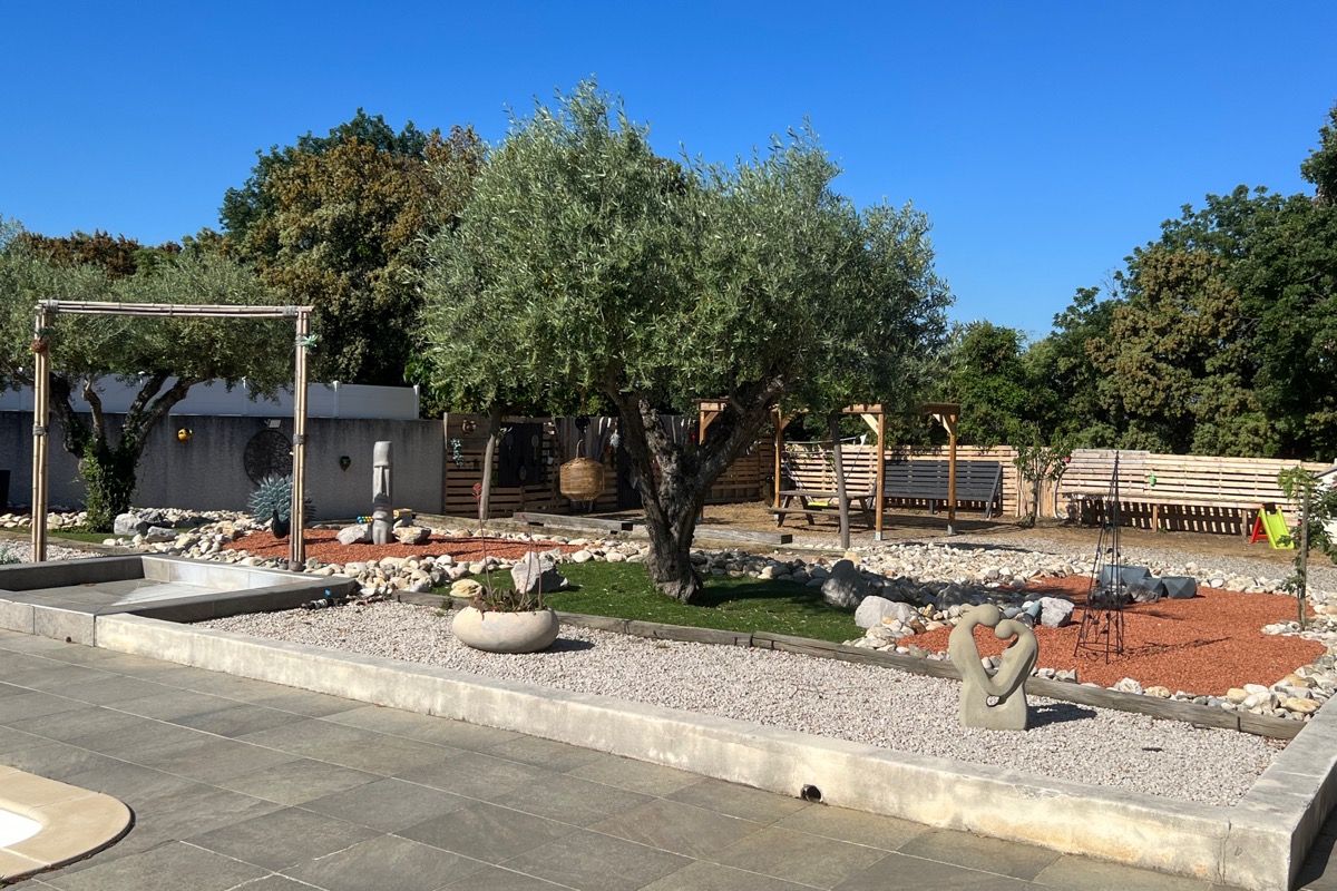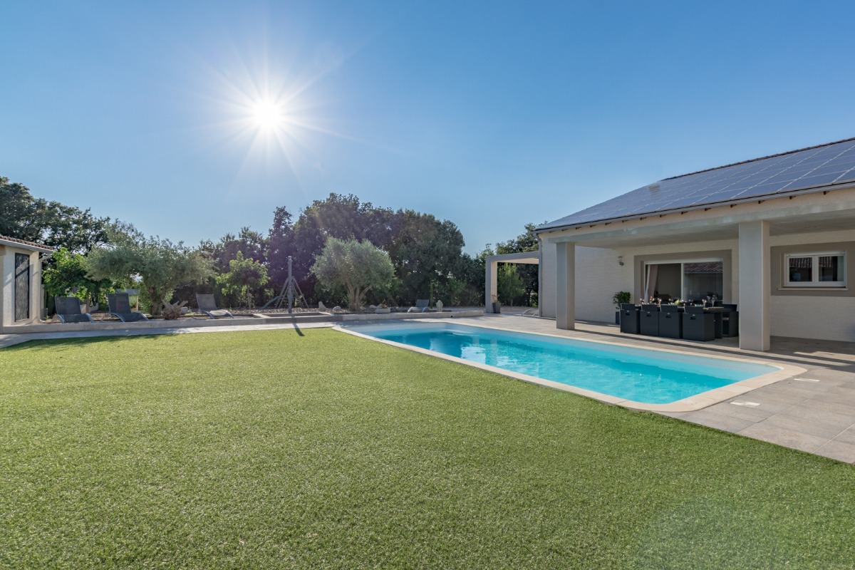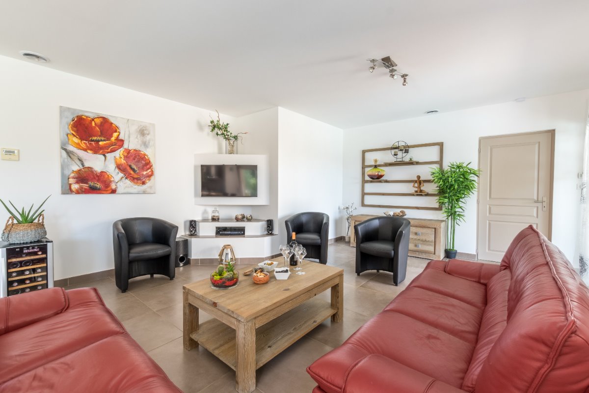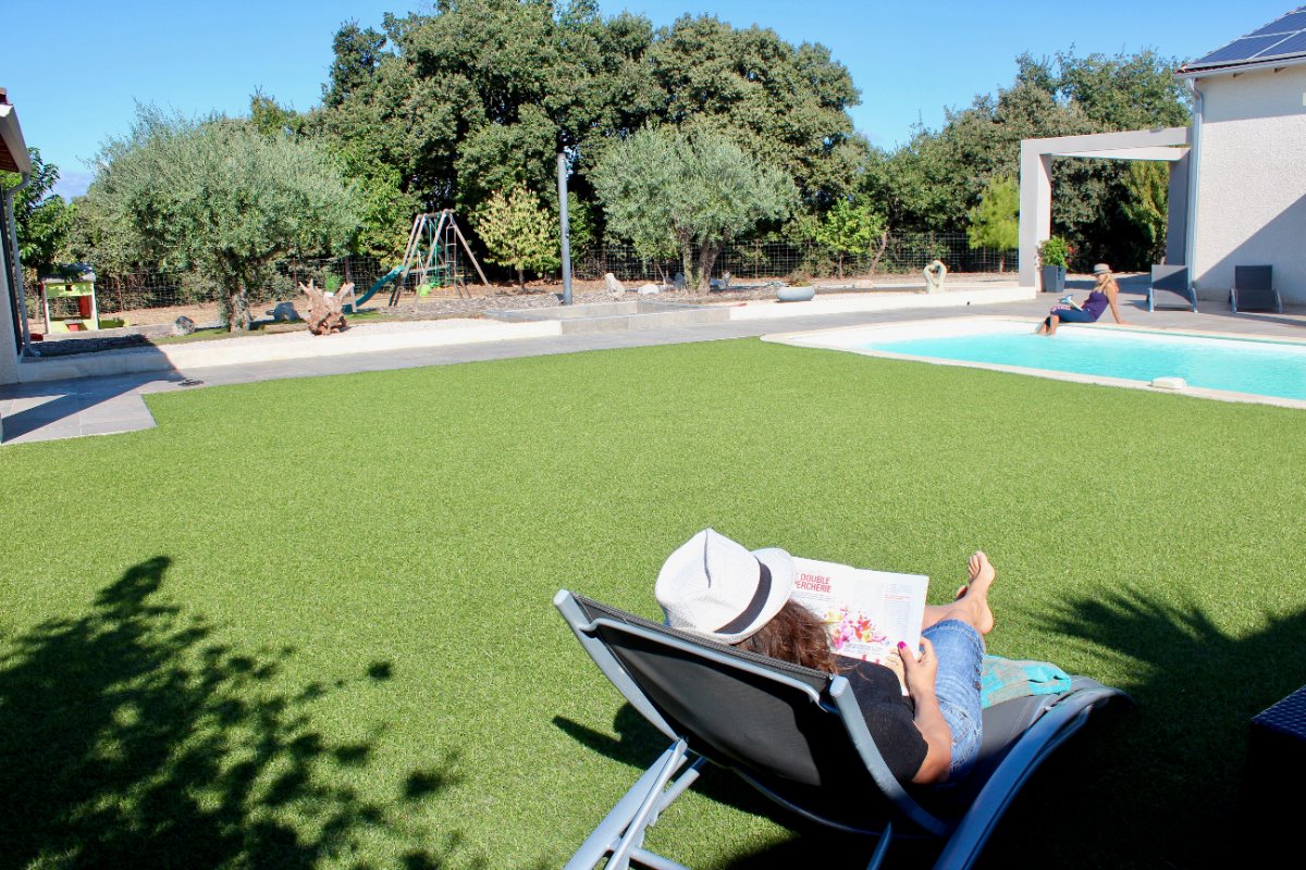 Bienvenue chez vous! Le domaine des TERRIÈRES vous ouvre les portes d’un petit coin de paradis, propice à la douceur de vivre , un havre de paix de 17 ha au cœur du vignoble verdoyant du Languedoc. La Sérannne, Villa pour 8 pers., récente est très confortable, climatisée et décorée de façon moderne et chaleureuse où vous pourrez vous détendre après une journée passée au bord de la piscine ou en balade. Vous disposer de grands terrains aménagés où les enfants peuvent jouer en toute tranquillité pour leur plus grand bonheur. Les grandes baies vitrée qui mènent aux terrasses couvertes ou baignées de soleil sont une invitation à la détente et aux repas en famille face aux jardins et pelouses. Un barbecue prêt pour les grillades et un bar pour vous désaltérer après une partie de pétanque sont au rendez vous ! Dégustez une bonne tomate tout juste cueillit dans notre potager bio ! A la nuit tombée, l’éclairage sous marin donnera de la douceur à vos soirées. La cuisine ouverte sur le séjour est entièrement équipée avec tout le nécessaire pour huit personnes. La partie nuit dispose de quatre chambres décorées avec raffinement, deux salles d’eau, dont une attenante à la chambre parentale. Toilettes séparées. La possibilité de garer les voitures ou motos en toute sécurité sur la propriété. Partez à la rencontre avec nos animaux : poules, chèvres, chevaux….etc. Possibilité de : – Dégustation de vins avec le propriétaire, visite de ses caves, participation aux vendanges. – Soins de relaxation ou de beauté sur réservation dans les vignes ou dans une pièce dédiée sur le domaine. Tout un programme qui vous attend !