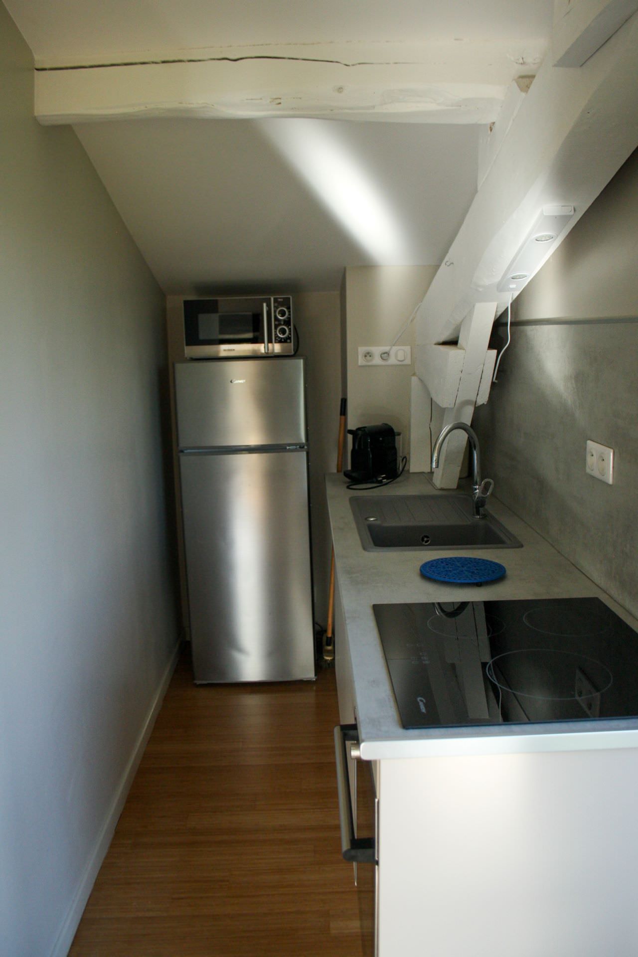 Gîte de type loft composé d’un espace de vie avec une cuisine ouverte, d’une zone chambre avec lit double spacieux et un lit simple, d’une grande salle de bain avec baignoire et douche, WC.