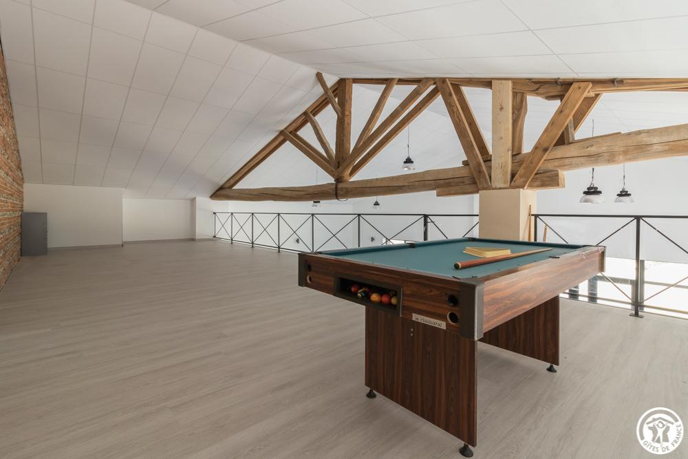 Une cuisine et la grande salle commune sont accessibles dans le même bâtiment pour préparer et prendre vos repas si vous le désirez ; ces espaces sont en cohabitation avec les 2 autres gîtes-studios, situés au premier étage. Une salle de jeux/détente en mezzanine au-dessus de la grande salle est aussi accessible aux 3 gîtes (petit billard).